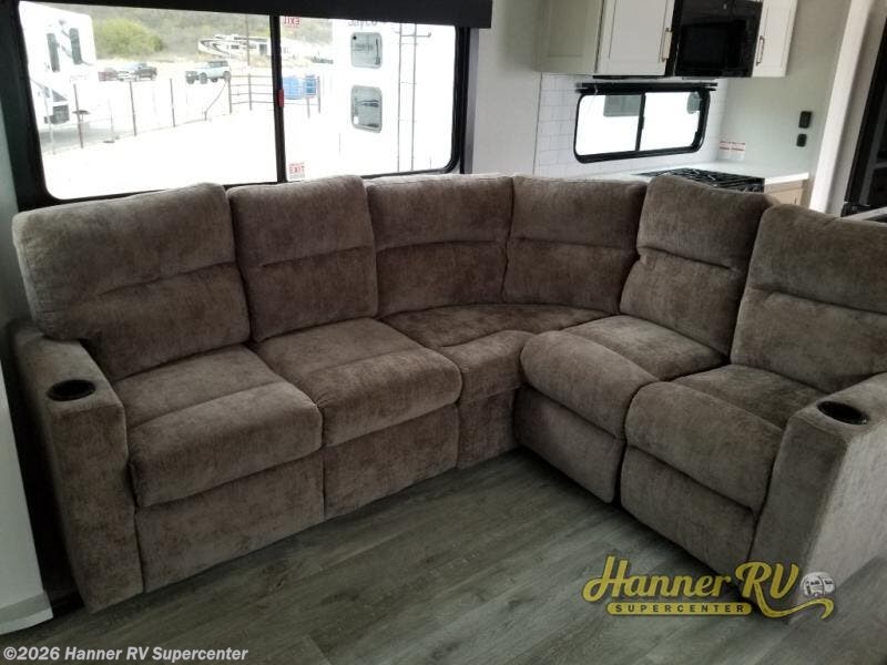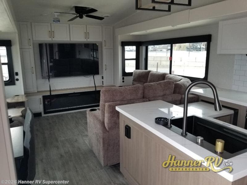 It will be so easy to enjoy time in this spacious fifth wheel! The rear living area includes an entertainment center with a fireplace across from the L-shaped sofa for movie nights. There is also a theater sofa with cup holders plus a roll-top dinette with two chairs to dine at. The chef of your group will love the generous counter space in the middle kitchen, and there is a large pantry to keep food stocked. Heading up front, you'll find the spacious bathroom that includes a shower with a seat, and the front private bedroom with a king bed slide out. There is also a chest with a TV, front shelves with drawers, plus washer and dryer prep!