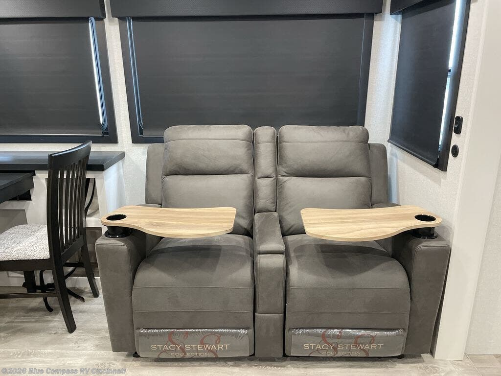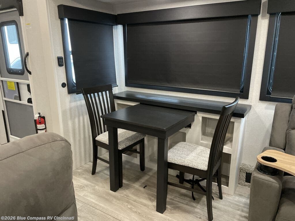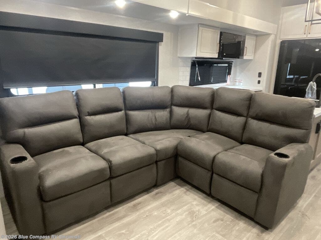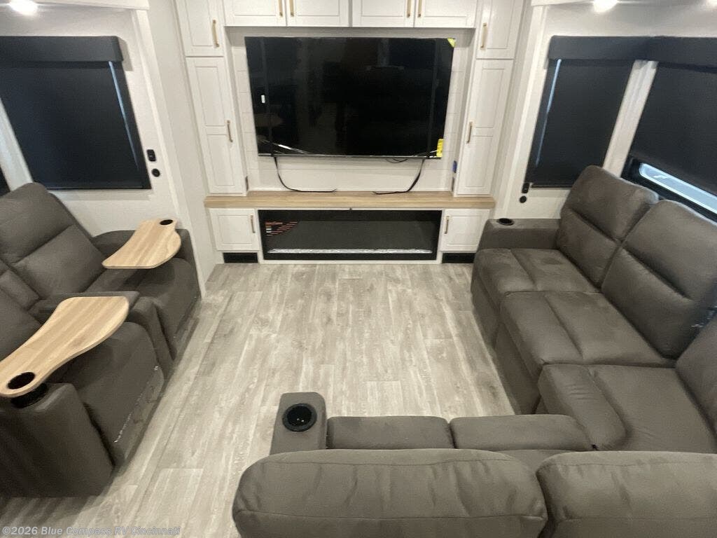 It will be so easy to enjoy time in this spacious fifth wheel! The rear living area includes an entertainment center with a fireplace across from the L-shaped sofa for movie nights. There is also a theater sofa with cup holders plus a roll-top dinette with two chairs to dine at. The chef of your group will love the generous counter space in the middle kitchen, and there is a large pantry to keep food stocked. Heading up front, you'll find the spacious bathroom that includes a shower with a seat, and the front private bedroom with a king bed slide out. There is also a chest with a TV, front shelves with drawers, plus washer and dryer prep!