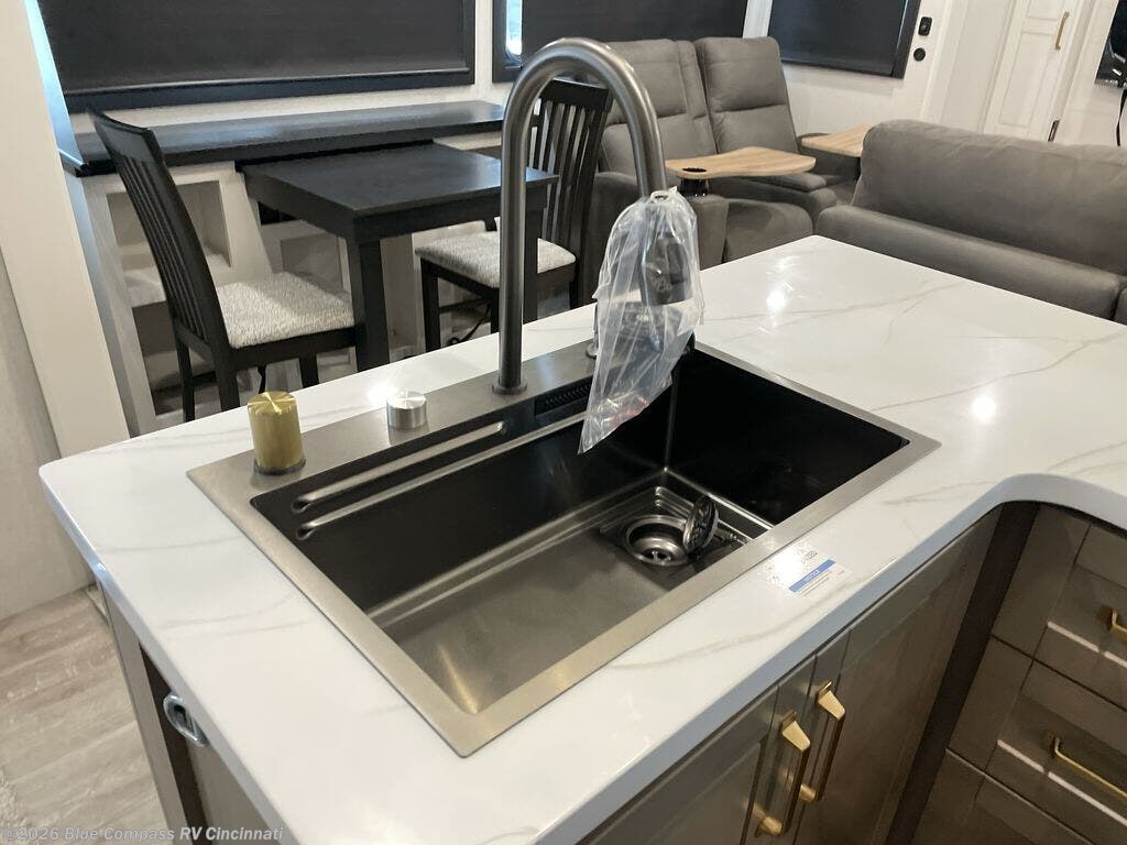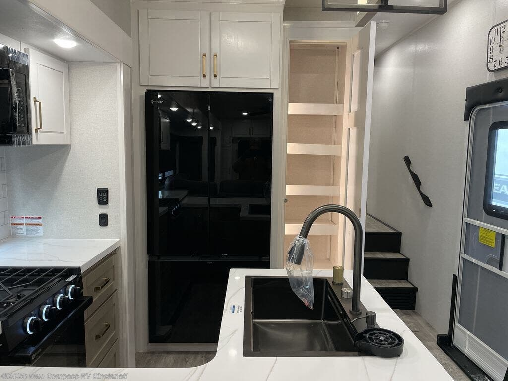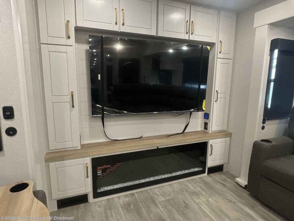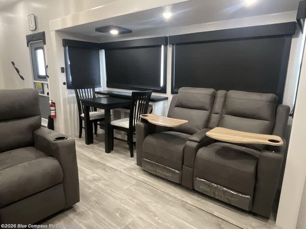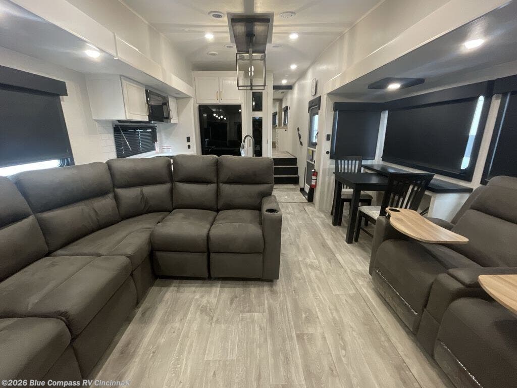 It will be so easy to enjoy time in this spacious fifth wheel! The rear living area includes an entertainment center with a fireplace across from the L-shaped sofa for movie nights. There is also a theater sofa with cup holders plus a roll-top dinette with two chairs to dine at. The chef of your group will love the generous counter space in the middle kitchen, and there is a large pantry to keep food stocked. Heading up front, you'll find the spacious bathroom that includes a shower with a seat, and the front private bedroom with a king bed slide out. There is also a chest with a TV, front shelves with drawers, plus washer and dryer prep!
