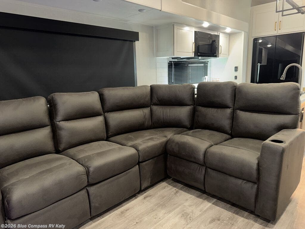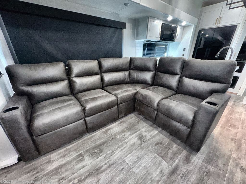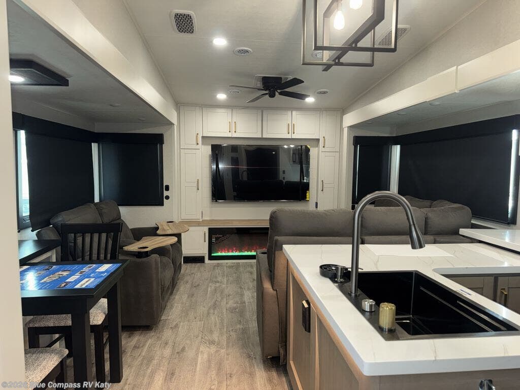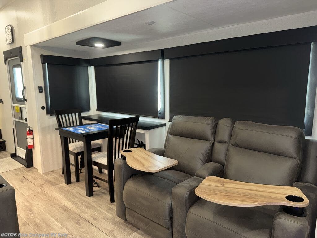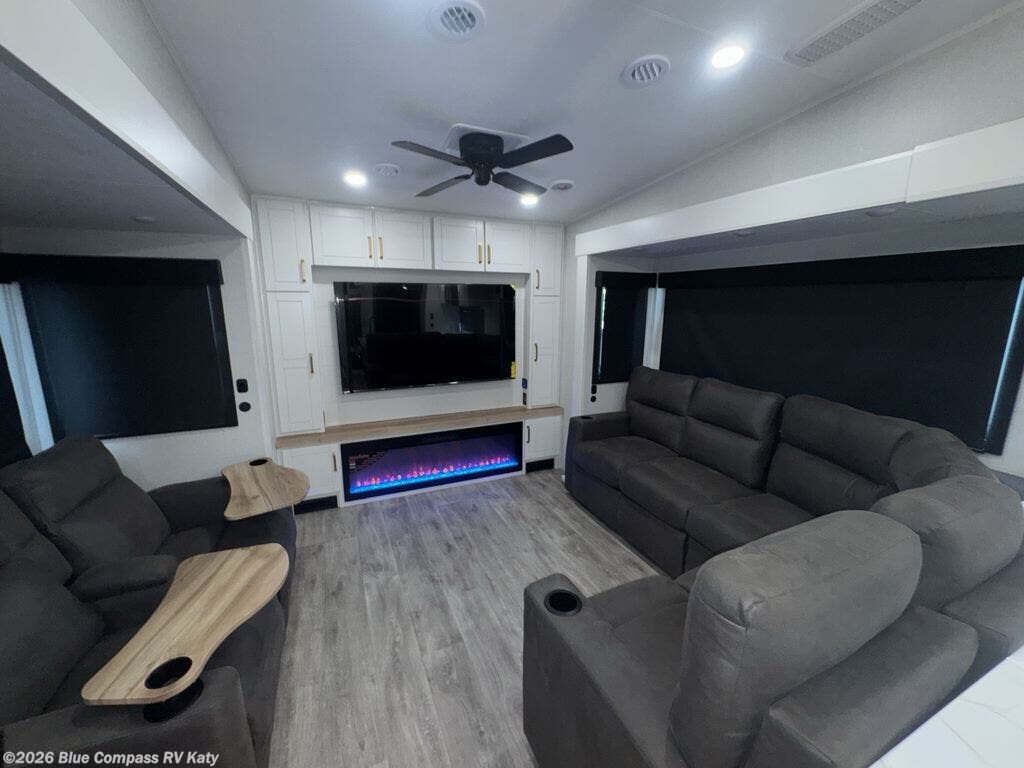 It will be so easy to enjoy time in this spacious fifth wheel! The rear living area includes an entertainment center with a fireplace across from the L-shaped sofa for movie nights. There is also a theater sofa with cup holders plus a roll-top dinette with two chairs to dine at. The chef of your group will love the generous counter space in the middle kitchen, and there is a large pantry to keep food stocked. Heading up front, you'll find the spacious bathroom that includes a skylight, moving forward the front private bedroom features a king bed slide out. There is also a chest with a TV, front shelves with drawers, plus washer and dryer prep!