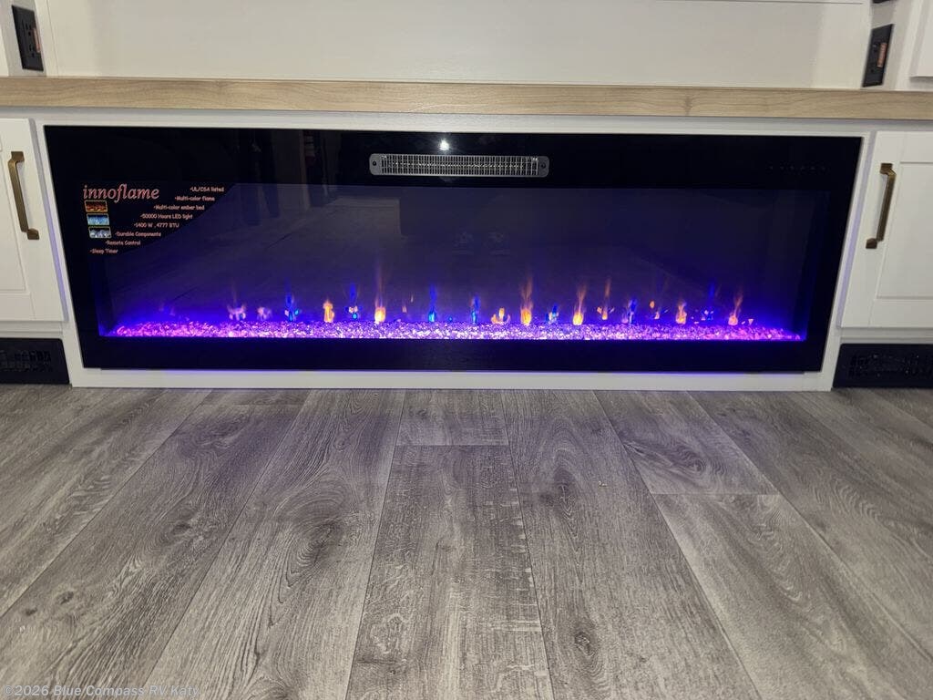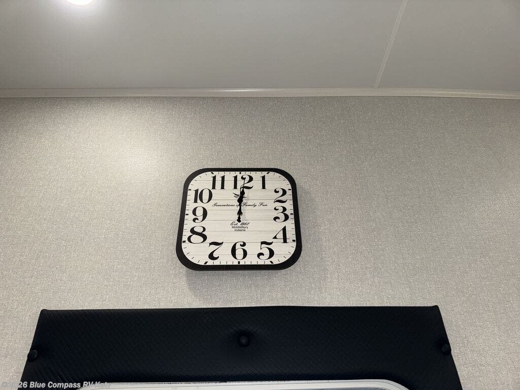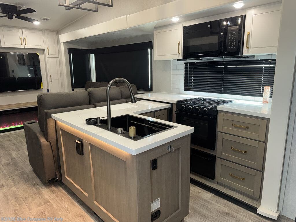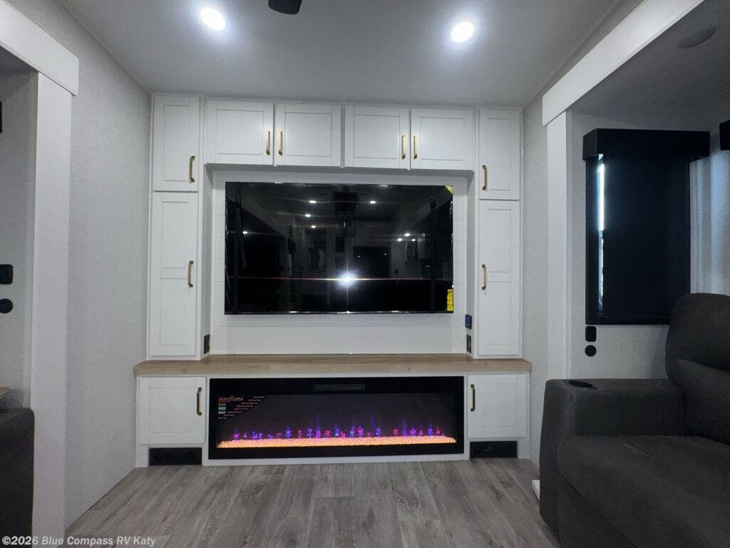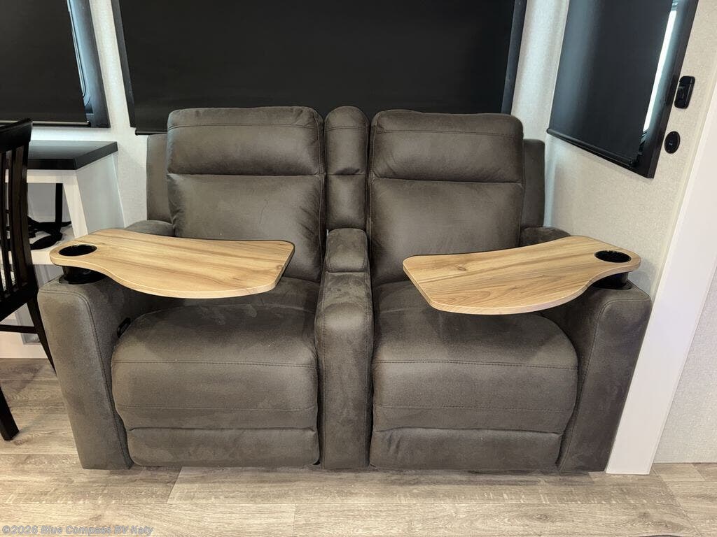 It will be so easy to enjoy time in this spacious fifth wheel! The rear living area includes an entertainment center with a fireplace across from the L-shaped sofa for movie nights. There is also a theater sofa with cup holders plus a roll-top dinette with two chairs to dine at. The chef of your group will love the generous counter space in the middle kitchen, and there is a large pantry to keep food stocked. Heading up front, you'll find the spacious bathroom that includes a skylight, moving forward the front private bedroom features a king bed slide out. There is also a chest with a TV, front shelves with drawers, plus washer and dryer prep!