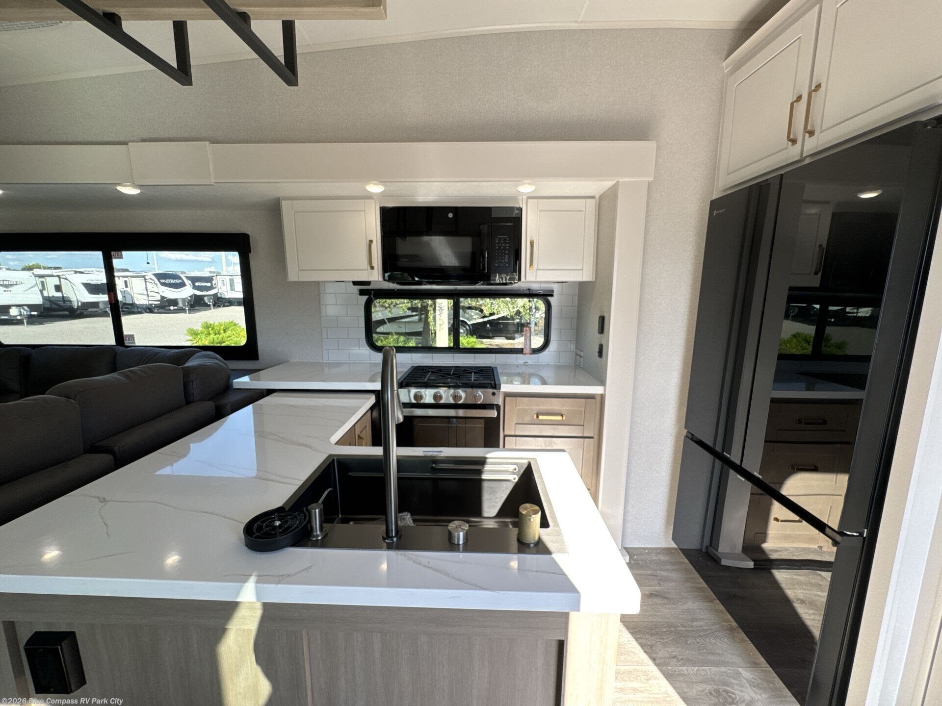 It will be so easy to enjoy time in this spacious fifth wheel! The rear living area includes an entertainment center with a fireplace across from the L-shaped sofa for movie nights. There is also a theater sofa with cup holders plus a roll-top dinette with two chairs to dine at. The chef of your group will love the generous counter space in the middle kitchen, and there is a large pantry to keep food stocked. Heading up front, you'll find the spacious bathroom that includes a skylight, moving forward the front private bedroom features a king bed slide out. There is also a chest with a TV, front shelves with drawers, plus washer and dryer prep!