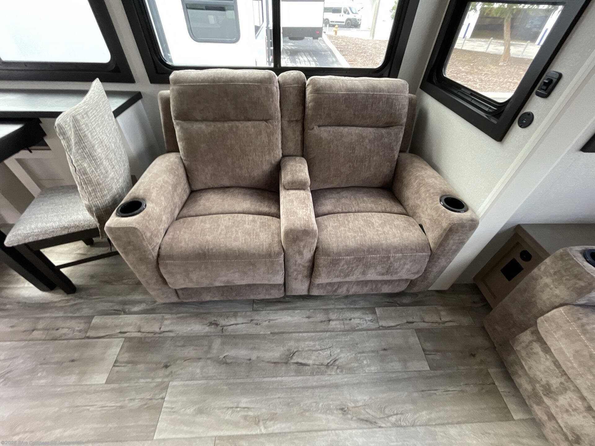 This fifth wheel with four slides is one your whole crew will love! There is a middle bedroom/den with a tri-fold sofa and a desk, allowing this room to become an office if you need it. The loft above this room will be a big hit with the little ones, and the full bath is centrally located so everyone can use it easily. You will have the front private bedroom all to yourselves with a king bed slide out, a chest with TV prep, plus washer and dryer prep in the walk-in closet. The main living area includes everything you need to relax in comfort, like the theater seats, tri-fold sofa, and entertainment center with a fireplace. The chef will enjoy the extra counter space provided by the kitchen island, and there is plenty of storage with the pantry, hutch, and 16 cu. ft. 12V refrigerator. This model even has an outside kitchen, two power awnings, and outside storage for all your gear!