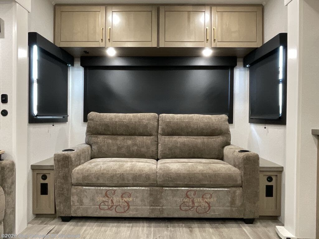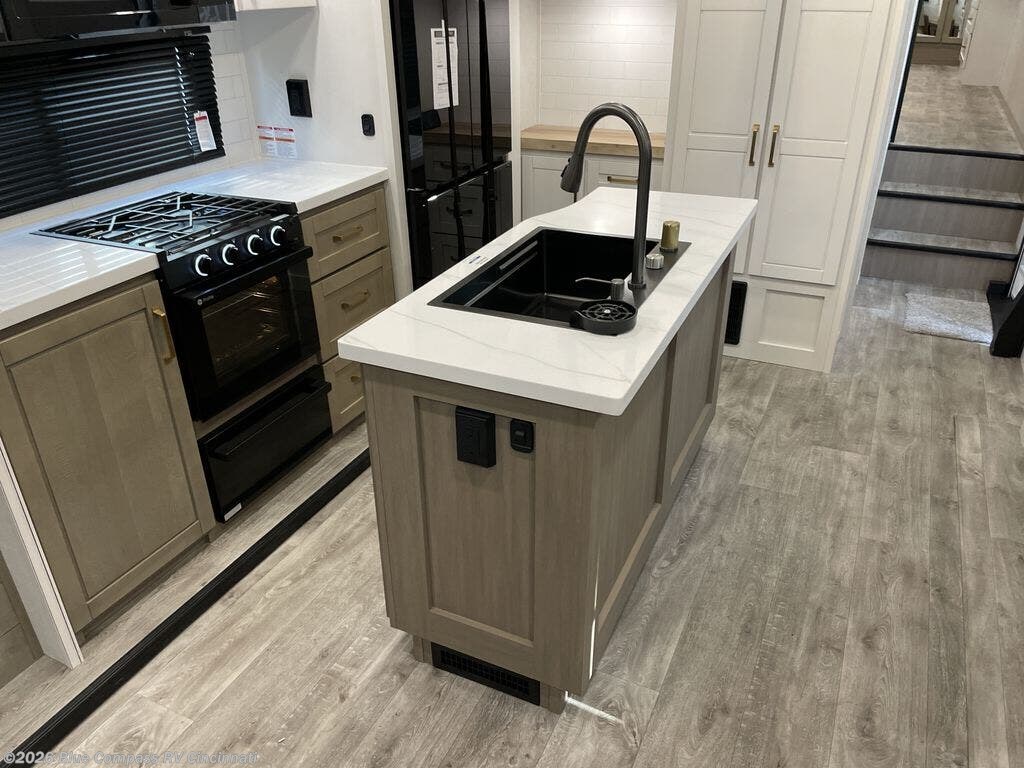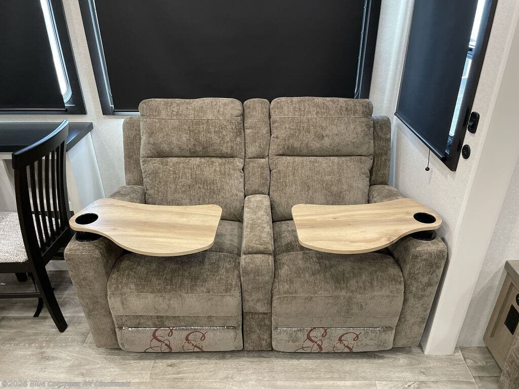 This fifth wheel with four slides is one your whole crew will love! There is a middle bedroom/den with a tri-fold sofa and a desk, allowing this room to become an office if you need it. The loft above this room will be a big hit with the little ones, and the full bath is centrally located so everyone can use it easily. You will have the front private bedroom all to yourselves with a king bed slide out, a chest with TV prep, plus washer and dryer prep in the walk-in closet. The main living area includes everything you need to relax in comfort, like the theater seats, tri-fold sofa, and entertainment center with a fireplace. The chef will enjoy the extra counter space provided by the kitchen island, and there is plenty of storage with the pantry, hutch, and 16 cu. ft. 12V refrigerator. This model even has an outside kitchen, two power awnings, and outside storage for all your gear!