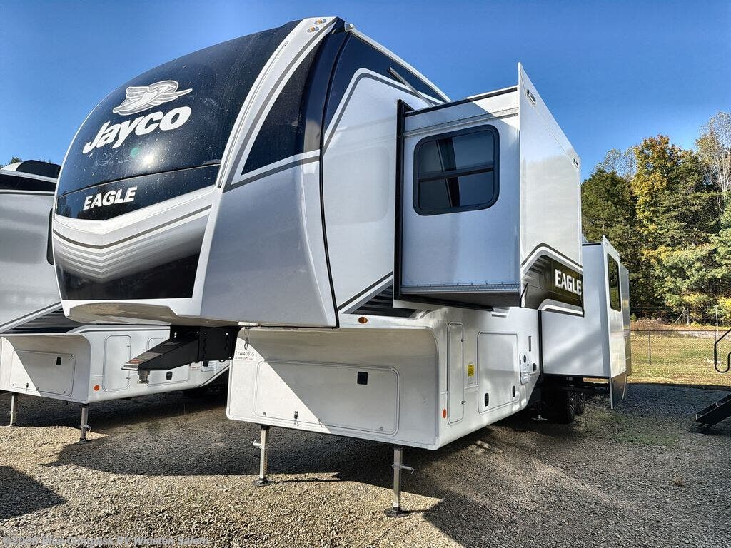 With any Eagle fifth wheel by Jayco you will appreciate durable construction materials, like the Magnum Truss Roof and the Stronghold VBL laminated walls. The JAYCOMMAND Smart RV system puts you in control of your RV's functions, and the 5 Star Handling Package will provide smooth towing from home to camp. Each model features Climate Shield zero-degree tested weather protection and the industry-exclusive HELIX cooling system that features two 15,000 BTU Whisper Quiet A/C's to keep you comfortable year around. Some of the exterior conveniences you are sure to love are the pass-through storage with Slam-Latch baggage doors and an automotive style front cap with max turn radius. The Eagle fifth wheels are designed to make you feel at home with solid hardwood slide fascia, residential vinyl flooring throughout, 100% no floor vents, and blackout roller shades with reflective side throughout for added privacy and insulation.