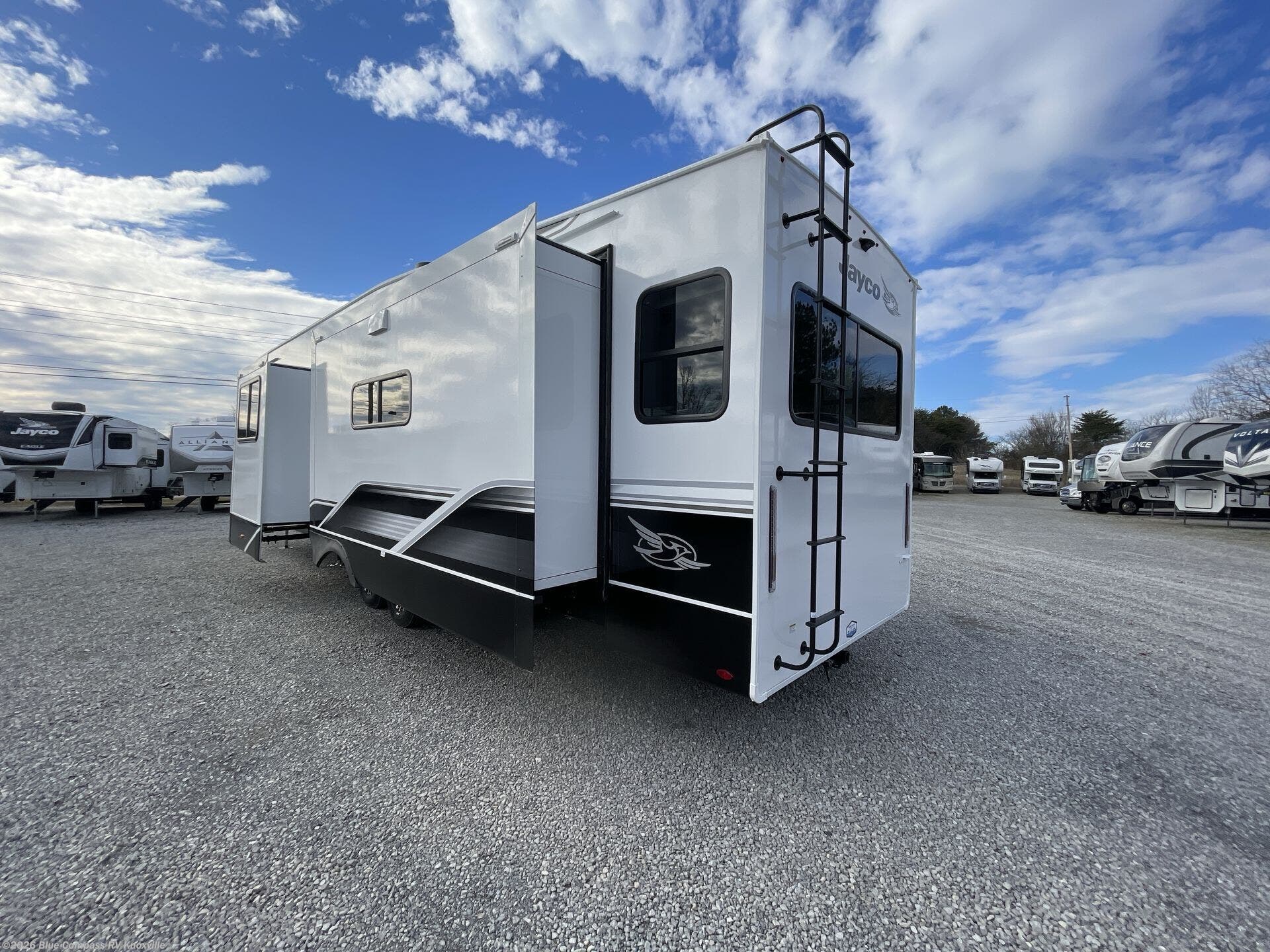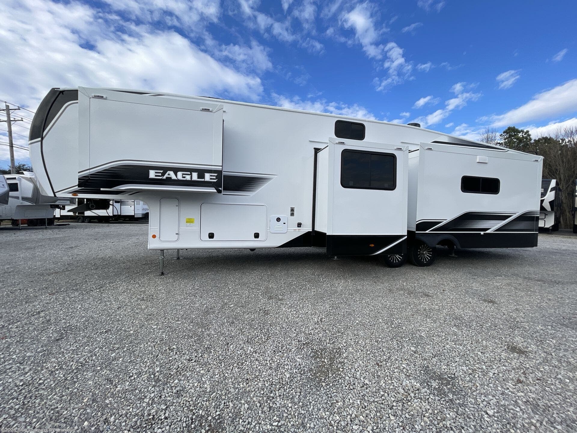 With any Eagle fifth wheel by Jayco you will appreciate durable construction materials, like the Magnum Truss Roof and the Stronghold VBL laminated walls. The JAYCOMMAND Smart RV system puts you in control of your RV's functions, and the 5 Star Handling Package will provide smooth towing from home to camp. Each model features Climate Shield zero-degree tested weather protection and the industry-exclusive HELIX cooling system that features two 15,000 BTU Whisper Quiet A/C's to keep you comfortable year around. Some of the exterior conveniences you are sure to love are the pass-through storage with Slam-Latch baggage doors and an automotive style front cap with max turn radius. The Eagle fifth wheels are designed to make you feel at home with solid hardwood slide fascia, residential vinyl flooring throughout, 100% no floor vents, and blackout roller shades with reflective side throughout for added privacy and insulation.