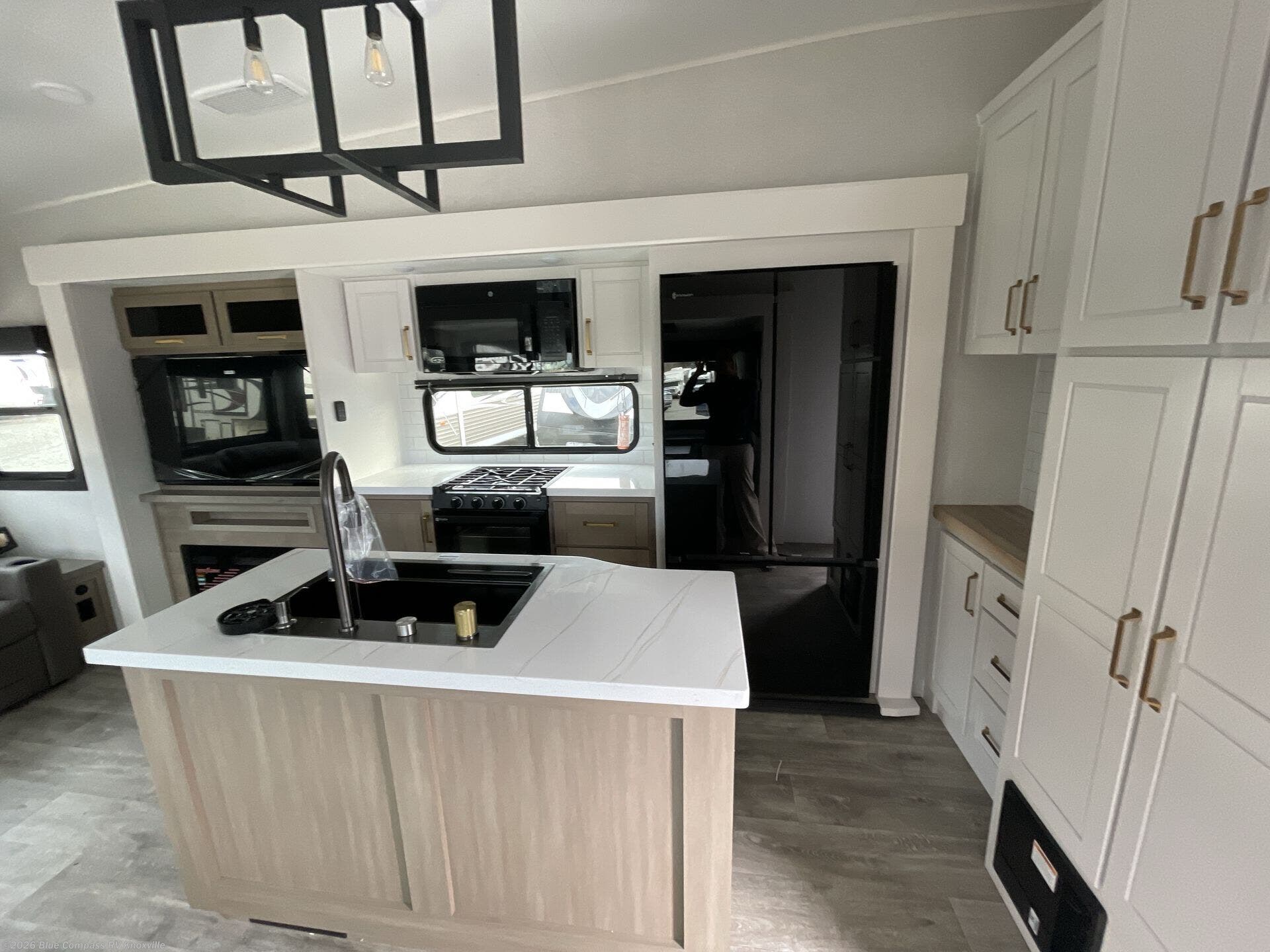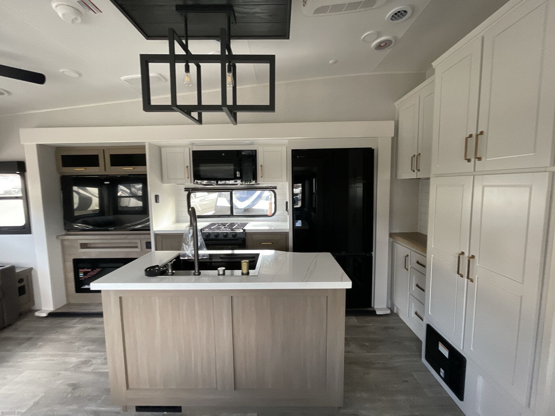 This fifth wheel with four slides is one your whole crew will love! There is a middle bedroom/den with a tri-fold sofa and a desk, allowing this room to become an office if you need it. The loft above this room will be a big hit with the little ones, and the full bath is centrally located so everyone can use it easily. You will have the front private bedroom all to yourselves with a king bed slide out, a chest with TV prep, plus washer and dryer prep in the walk-in closet. The main living area includes everything you need to relax in comfort, like the theater seats, tri-fold sofa, and entertainment center with a fireplace. The chef will enjoy the extra counter space provided by the kitchen island, and there is plenty of storage with the pantry, hutch, and 16 cu. ft. 12V refrigerator. This model even has an outside kitchen, two power awnings, and outside storage for all your gear!