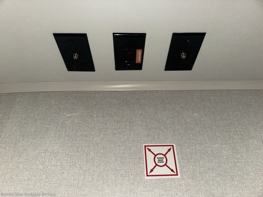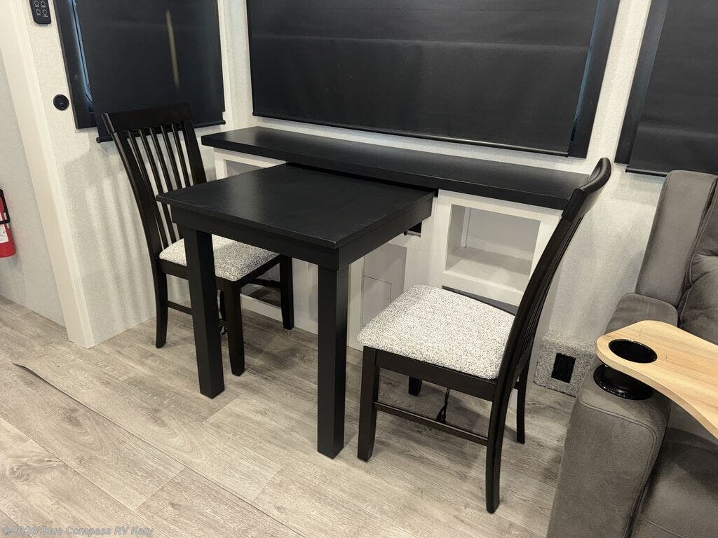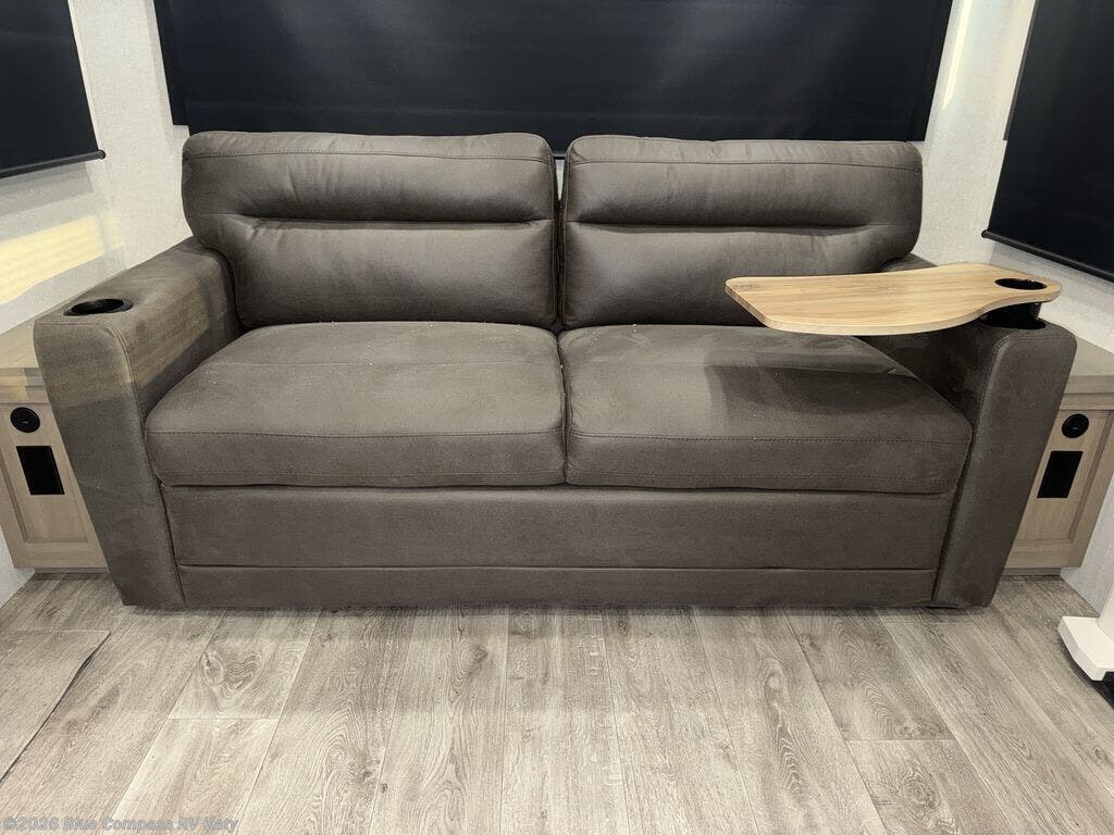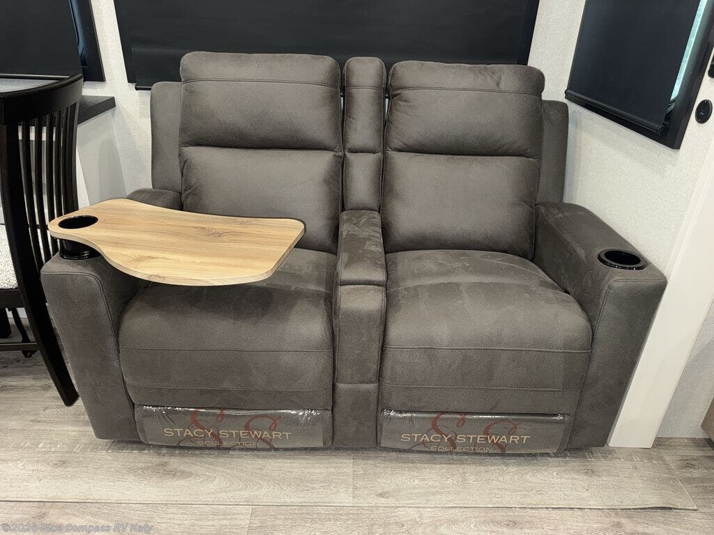 This fifth wheel with four slides is one your whole crew will love! There is a middle bedroom/den with a tri-fold sofa and a desk, allowing this room to become an office if you need it. The loft above this room will be a big hit with the little ones, and the full bath is centrally located so everyone can use it easily. You will have the front private bedroom all to yourselves with a king bed slide out, a chest with TV prep, plus washer and dryer prep in the front closet. The main living area includes everything you need to relax in comfort, like the theater seat, tri-fold sofa, and entertainment center with a fireplace. The chef will enjoy the extra counter space provided by the kitchen island, and there is plenty of storage with the pantry, hutch, and 16 cu. ft. 12V refrigerator. This model even has an outside kitchen, two power awnings, and outside storage for all your gear!