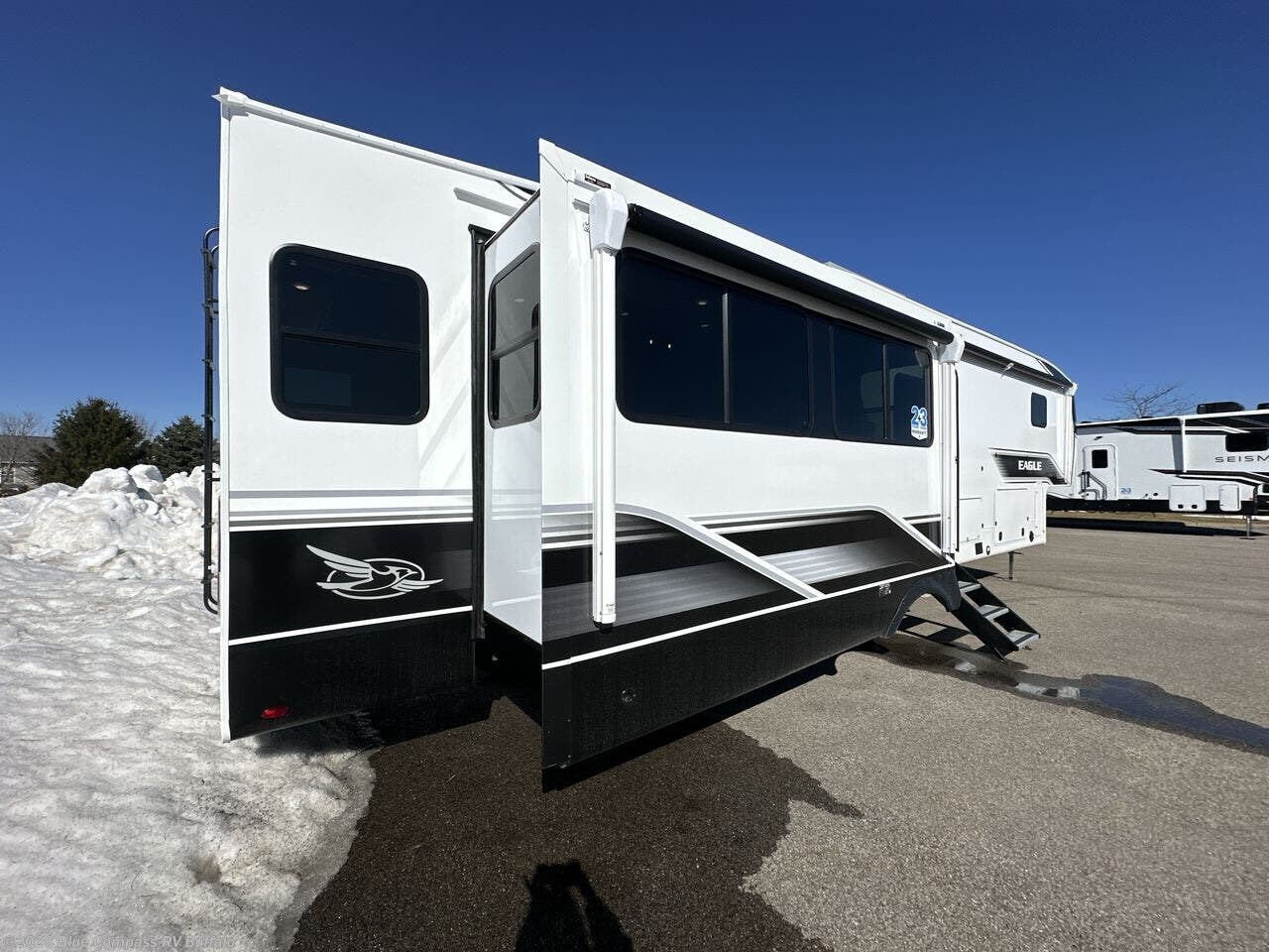 With any Eagle fifth wheel by Jayco you will appreciate durable construction materials, like the Magnum Truss Roof and the Stronghold VBL laminated walls. The JAYCOMMAND Smart RV system puts you in control of your RV's functions, and the 4 Star Handling Package will provide smooth towing from home to camp. Each model features Climate Shield zero-degree tested weather protection and the industry-exclusive HELIX cooling system that features two 15,000 BTU Whisper Quiet A/C's to keep you comfortable during those colder months. Some of the exterior conveniences you are sure to love are the pass-through storage with Slam-Latch baggage doors and an automotive style front cap with max turn radius. The Eagle fifth wheels are designed to make you feel at home with solid surface countertops, residential vinyl flooring throughout, 100% no floor vents, and blackout roller shades with reflective side throughout for added privacy and insulation.