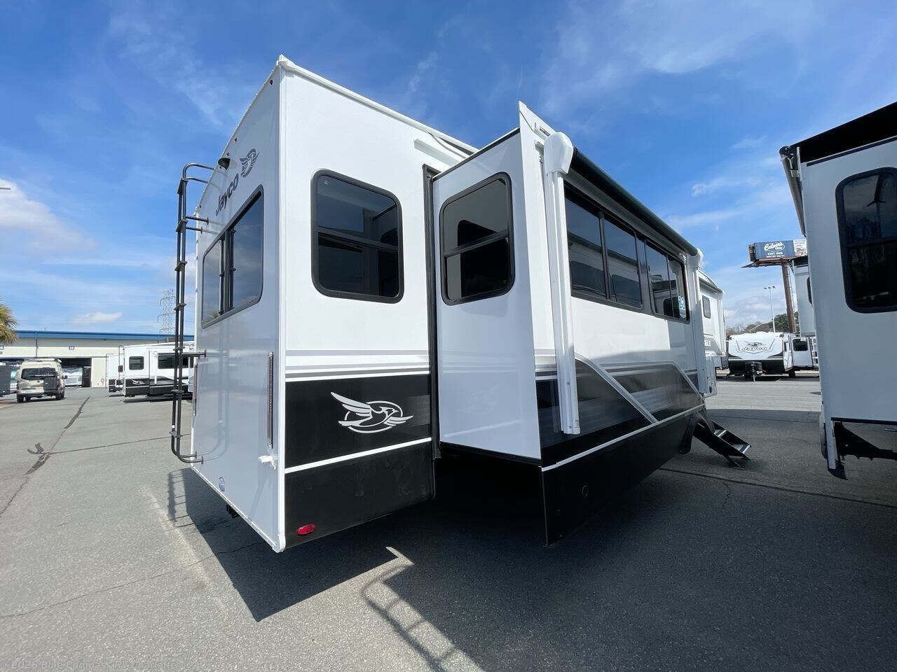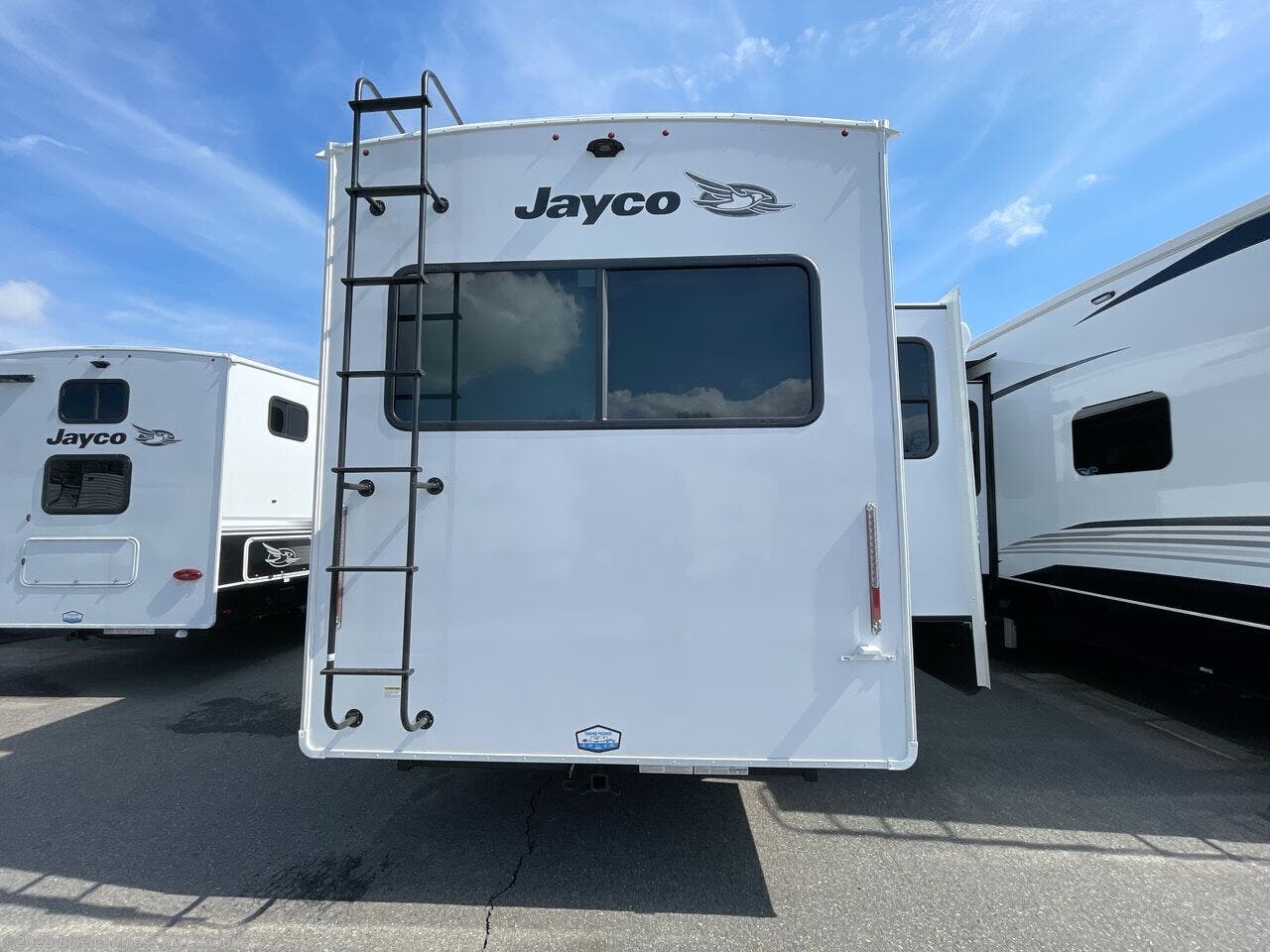 With any Eagle fifth wheel by Jayco you will appreciate durable construction materials, like the Magnum Truss Roof and the Stronghold VBL laminated walls. The JAYCOMMAND Smart RV system puts you in control of your RV's functions, and the 4 Star Handling Package will provide smooth towing from home to camp. Each model features Climate Shield zero-degree tested weather protection and the industry-exclusive HELIX cooling system that features two 15,000 BTU Whisper Quiet A/C's to keep you comfortable during those colder months. Some of the exterior conveniences you are sure to love are the pass-through storage with Slam-Latch baggage doors and an automotive style front cap with max turn radius. The Eagle fifth wheels are designed to make you feel at home with solid surface countertops, residential vinyl flooring throughout, 100% no floor vents, and blackout roller shades with reflective side throughout for added privacy and insulation.
