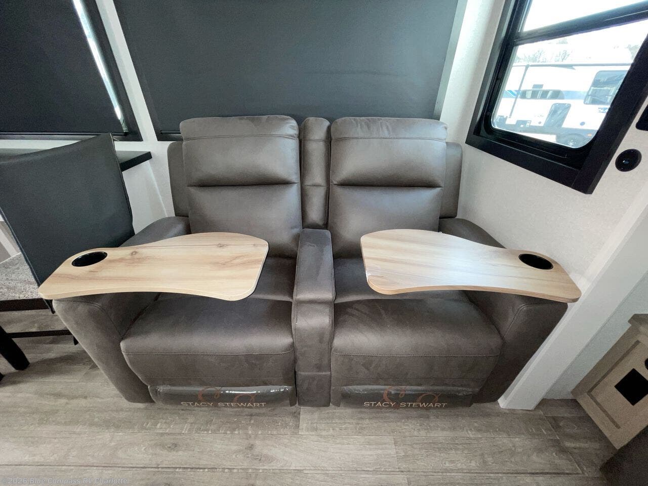 This fifth wheel with four slides is one your whole crew will love! There is a middle bedroom/den with a tri-fold sofa and a desk, allowing this room to become an office if you need it. The loft above this room will be a big hit with the little ones, and the full bath is centrally located so everyone can use it easily. You will have the front private bedroom all to yourselves with a king bed slide out, a chest with TV prep, plus washer and dryer prep in the front closet. The main living area includes everything you need to relax in comfort, like the theater seat, tri-fold sofa, and entertainment center with a fireplace. The chef will enjoy the extra counter space provided by the kitchen island, and there is plenty of storage with the pantry, hutch, and 16 cu. ft. 12V refrigerator. This model even has an outside kitchen, two power awnings, and outside storage for all your gear!