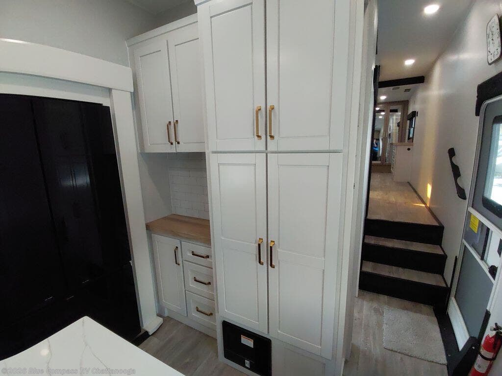 This fifth wheel with four slides is one your whole crew will love! There is a middle bedroom/den with a tri-fold sofa and a desk, allowing this room to become an office if you need it. The loft above this room will be a big hit with the little ones, and the full bath is centrally located so everyone can use it easily. You will have the front private bedroom all to yourselves with a king bed slide out, a chest with TV prep, plus washer and dryer prep in the walk-in closet. The main living area includes everything you need to relax in comfort, like the theater seats, tri-fold sofa, and entertainment center with a fireplace. The chef will enjoy the extra counter space provided by the kitchen island, and there is plenty of storage with the pantry, hutch, and 16 cu. ft. 12V refrigerator. This model even has an outside kitchen, two power awnings, and outside storage for all your gear!