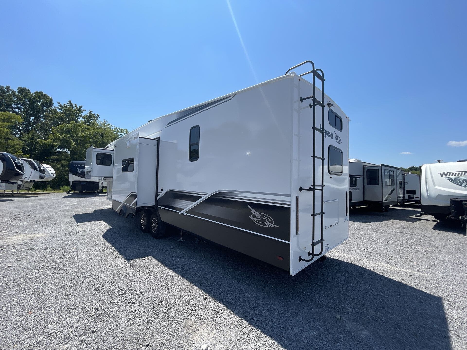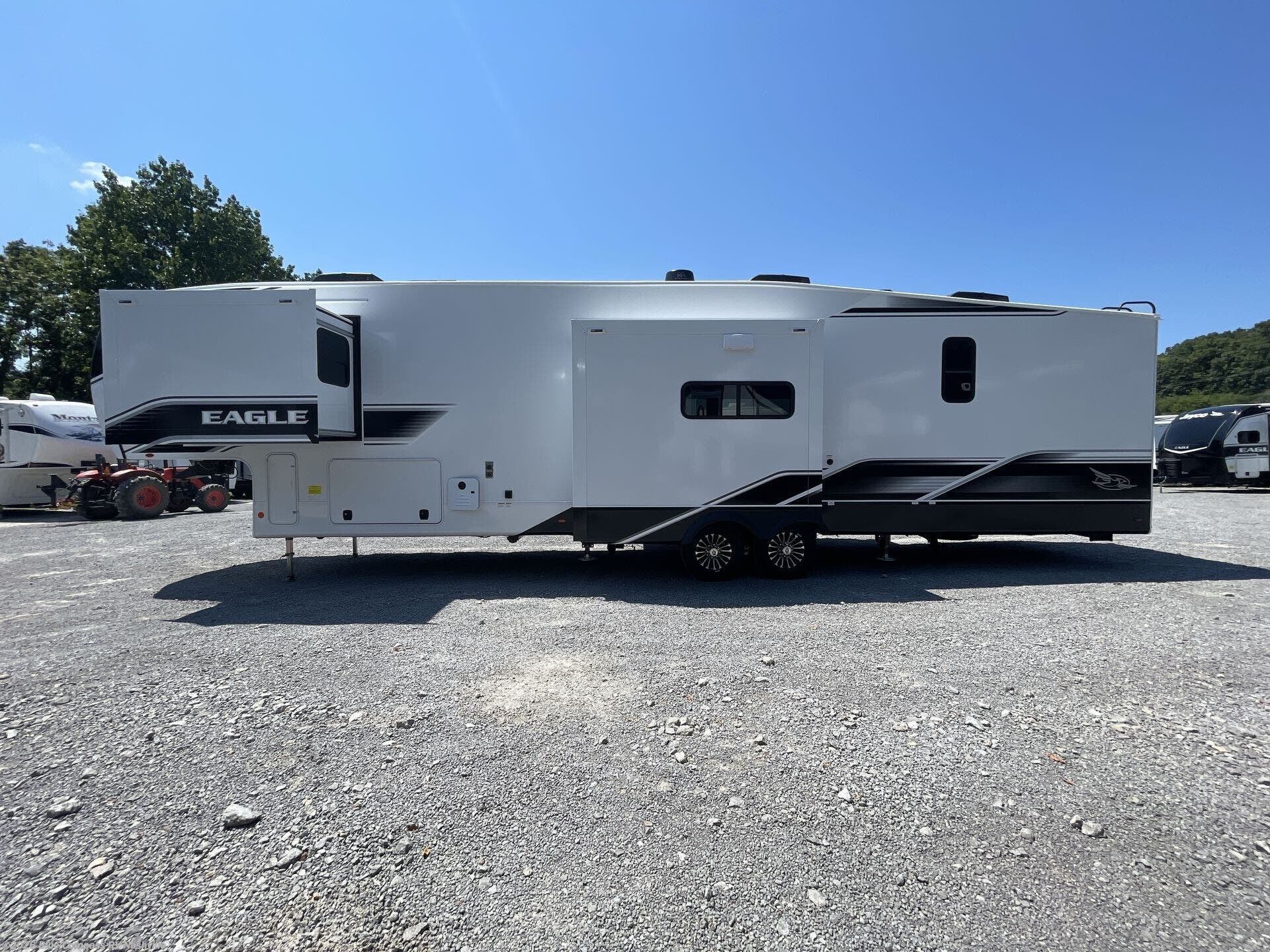 With any Eagle fifth wheel by Jayco you will appreciate durable construction materials, like the Magnum Truss Roof and the Stronghold VBL laminated walls. The JAYCOMMAND Smart RV system puts you in control of your RV's functions, and the 5 Star Handling Package will provide smooth towing from home to camp. Each model features Climate Shield zero-degree tested weather protection and the industry-exclusive HELIX cooling system that features two 15,000 BTU Whisper Quiet A/C's to keep you comfortable year around. Some of the exterior conveniences you are sure to love are the pass-through storage with Slam-Latch baggage doors and an automotive style front cap with max turn radius. The Eagle fifth wheels are designed to make you feel at home with solid hardwood slide fascia, residential vinyl flooring throughout, 100% no floor vents, and blackout roller shades with reflective side throughout for added privacy and insulation.