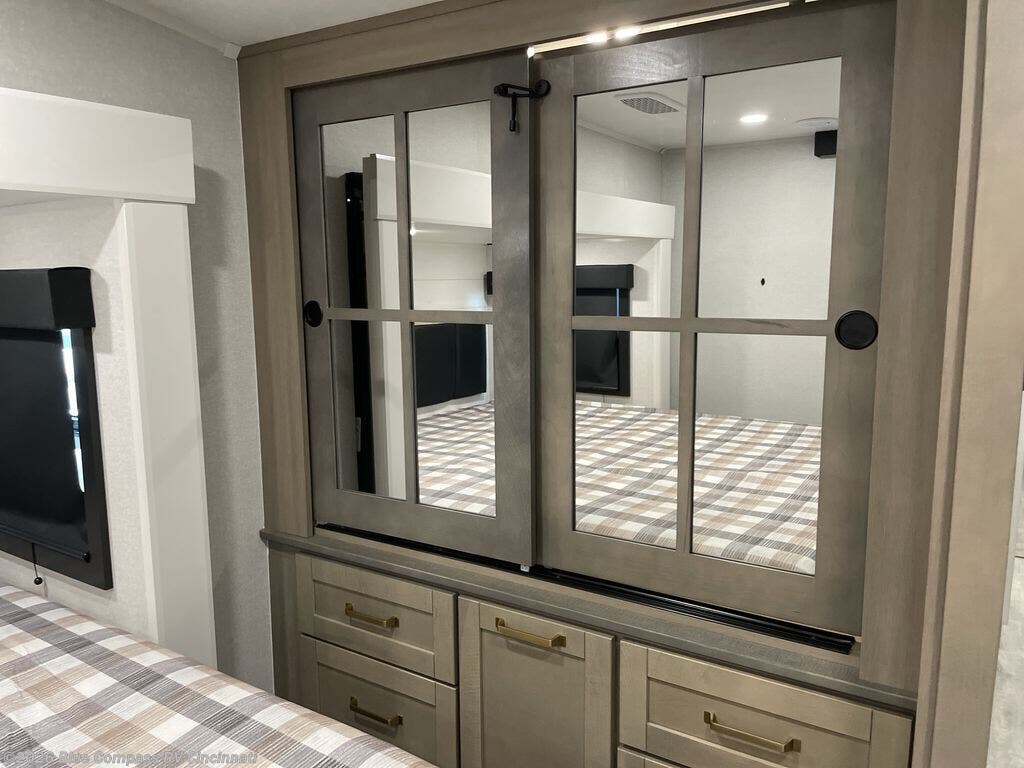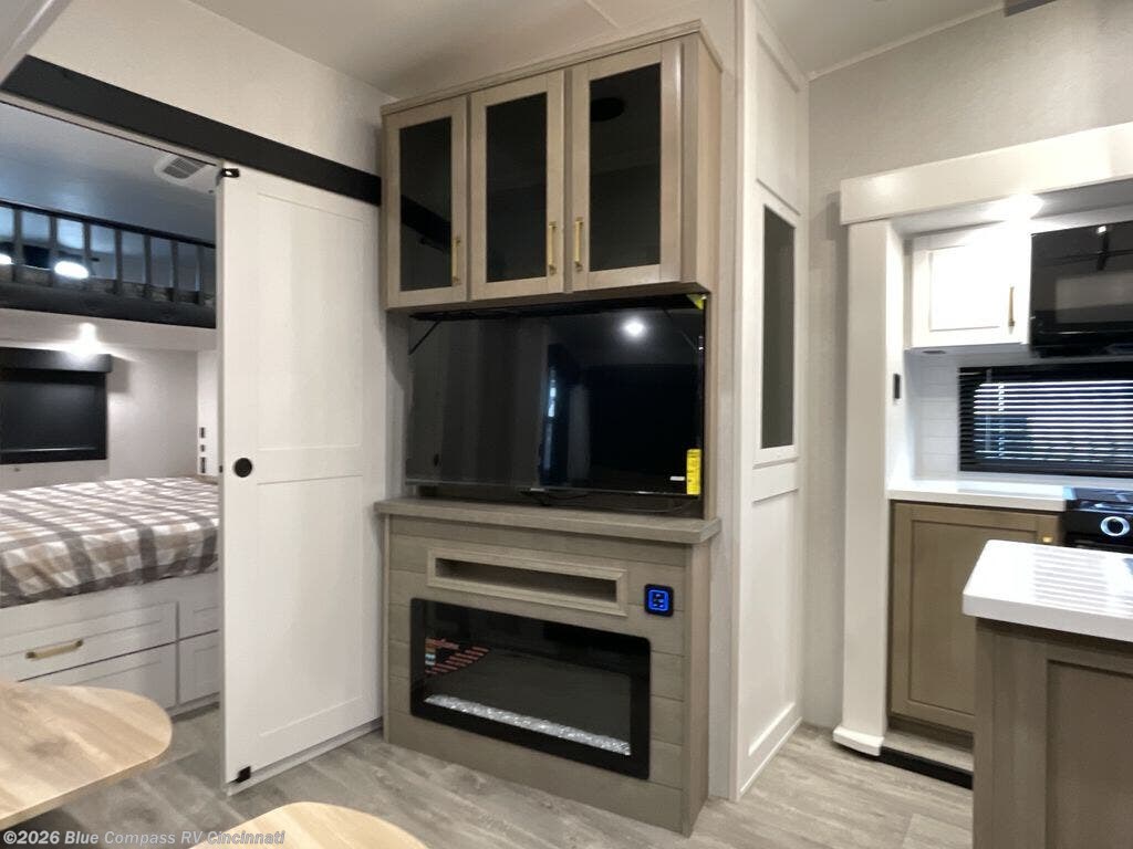 This fifth wheel is decked out in features you will love! The dual slides in the main living area create an open floorplan, and then there is a kitchen island that will make meal prepping easier. The theater seats plus table with chairs and a bench have a great view of the entertainment center and fireplace, and there is a ceiling fan here to keep the air moving. And did we mention there is an outside kitchen, complete with an outdoor refrigerator? This model also features a front private bedroom with a king bed slide out, a chest, and a front closet with convenient washer and dryer prep. There is also a rear private bunkhouse that has a 54" x 74" upper loft bed above a 66" x 80" Olympic bed with wardrobe storage drawers, as well as its very own half bathroom!