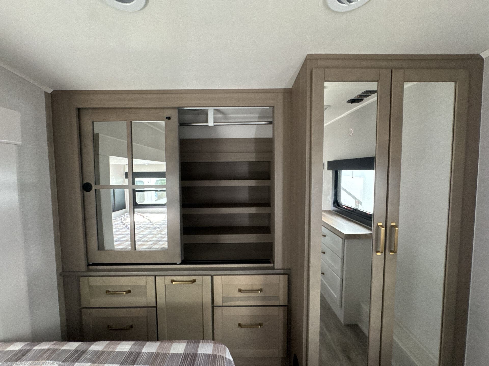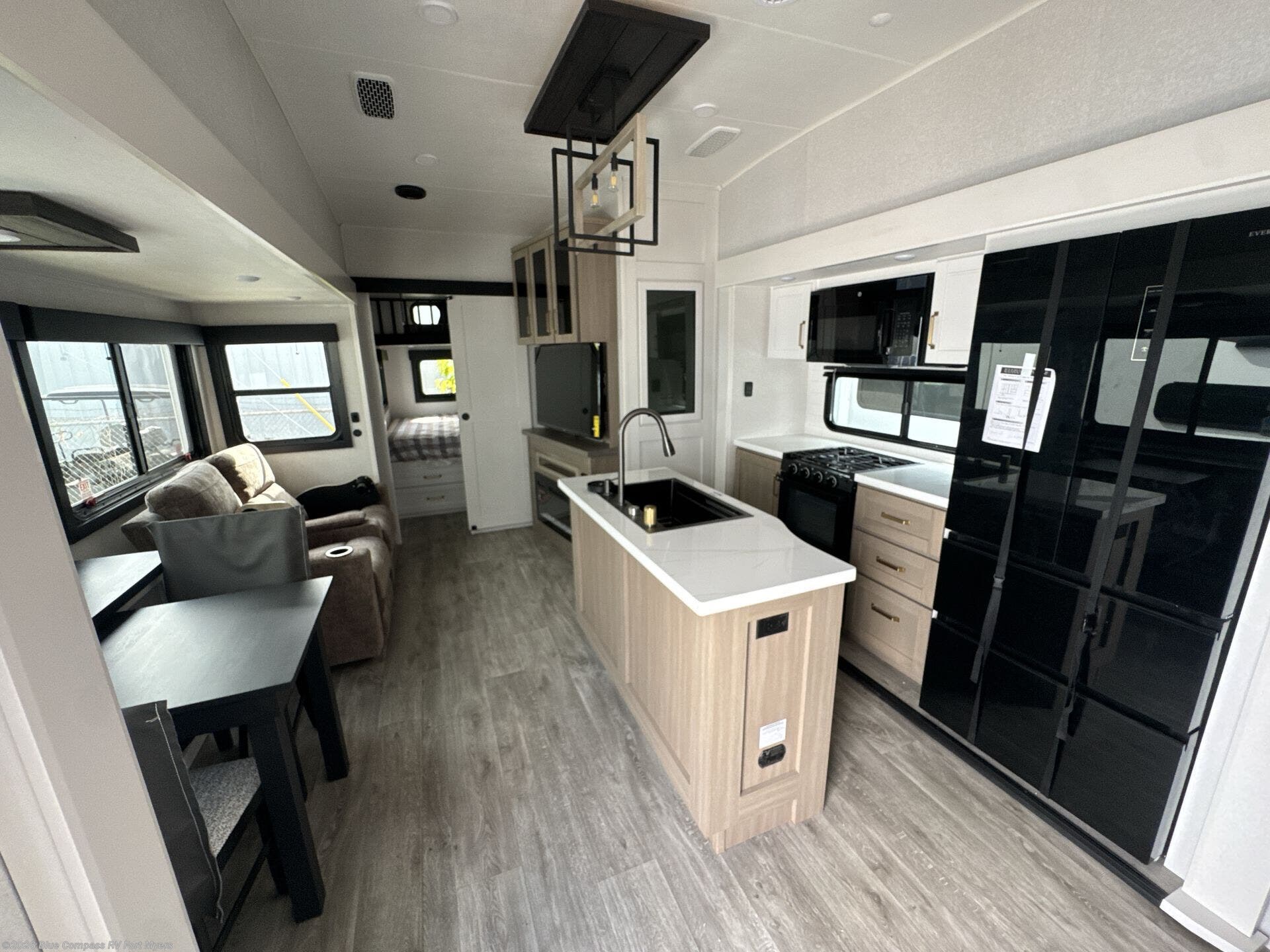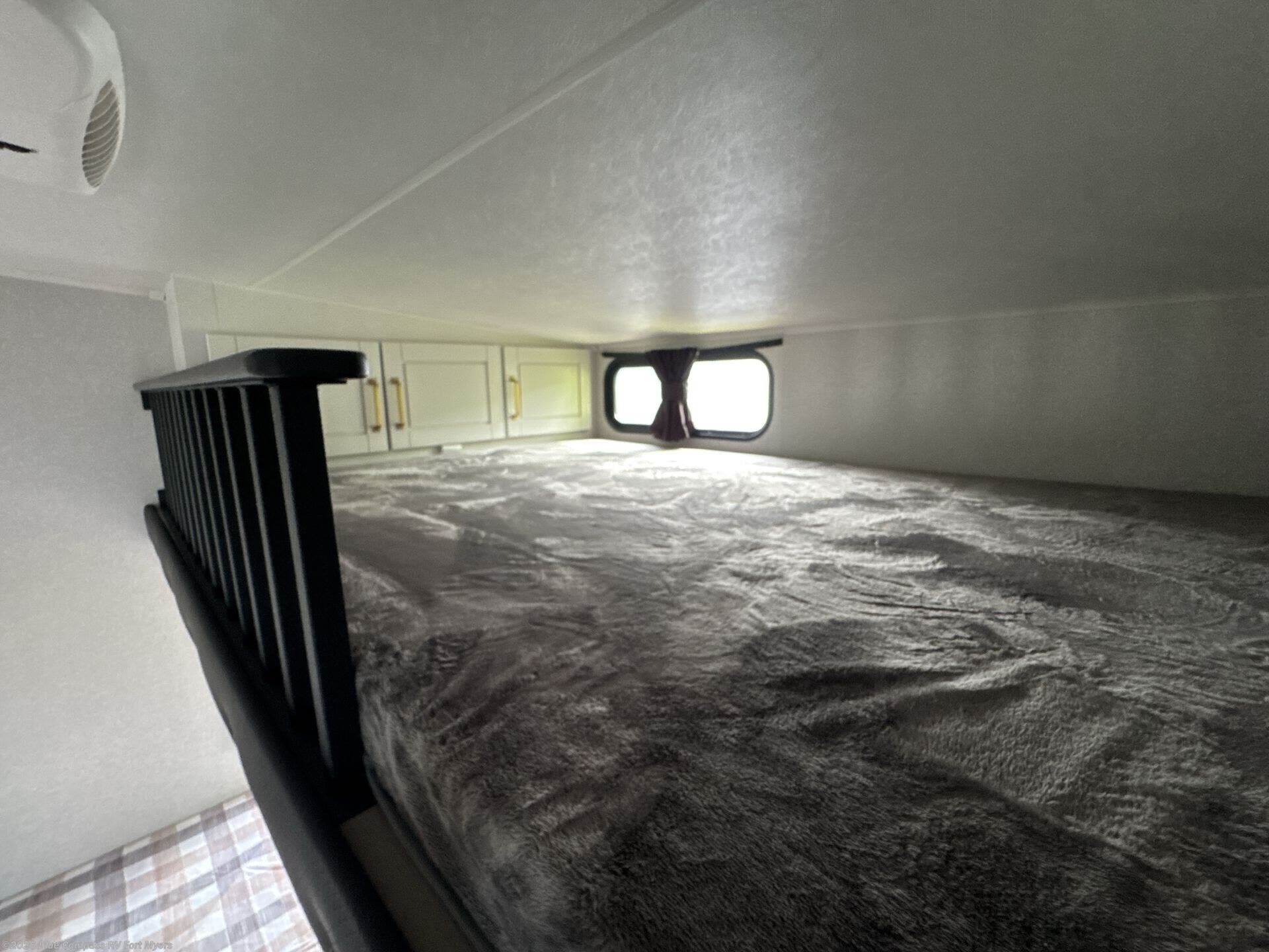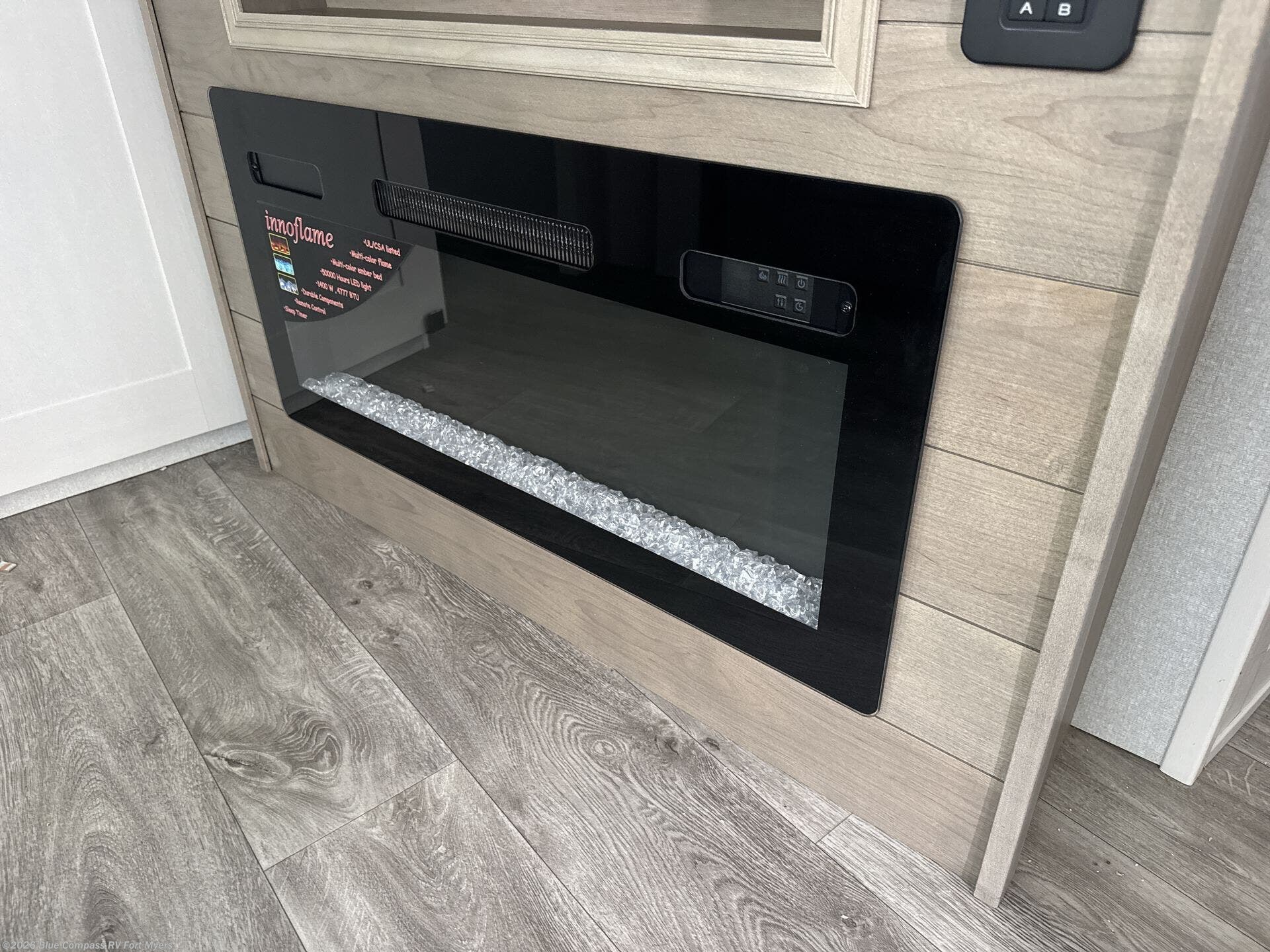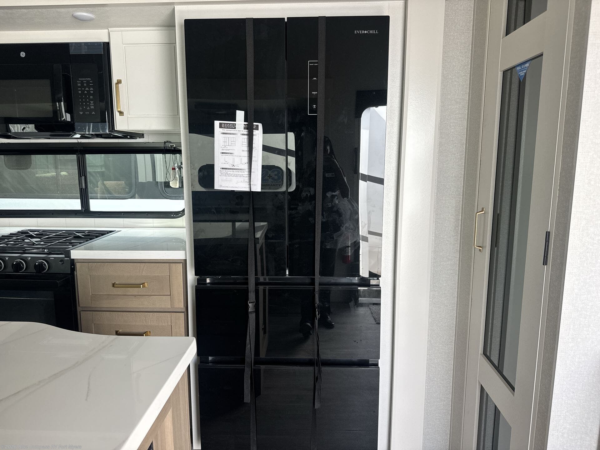This fifth wheel is decked out in features you will love! The dual slides in the main living area create an open floorplan, and then there is a kitchen island that will make meal prepping easier. The theater seats plus table with chairs and a bench have a great view of the entertainment center and fireplace, and there is a ceiling fan here to keep the air moving. And did we mention there is an outside kitchen, complete with an outdoor refrigerator? This model also features a front private bedroom with a king bed slide out, a chest, and a front closet with convenient washer and dryer prep. There is also a rear private bunkhouse that has a 54" x 74" upper loft bed above a 66" x 80" Olympic bed with wardrobe storage drawers, as well as its very own half bathroom!