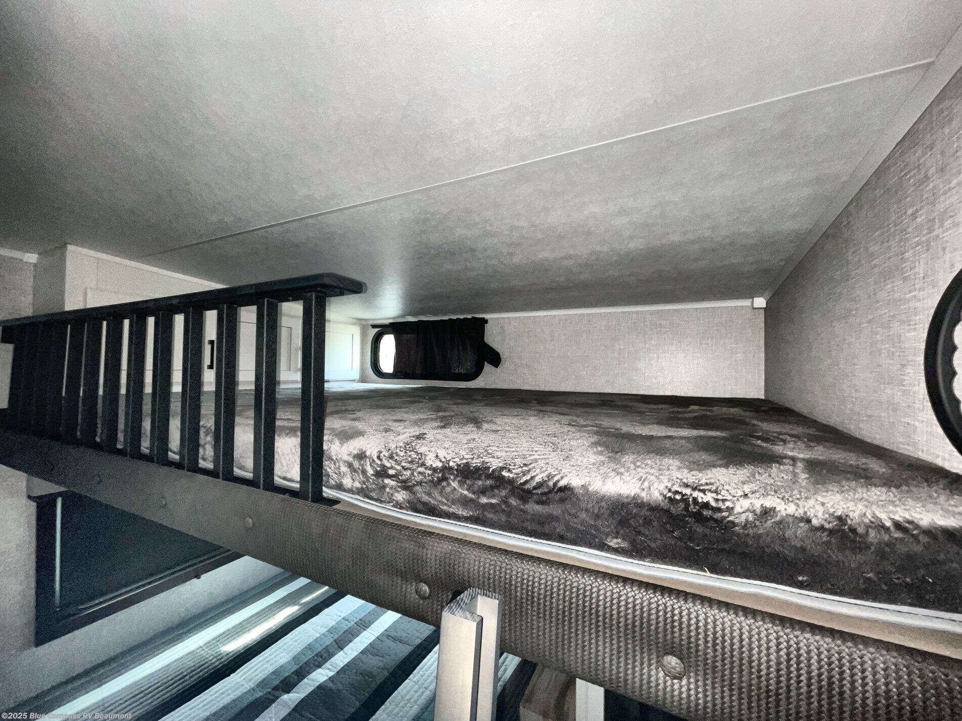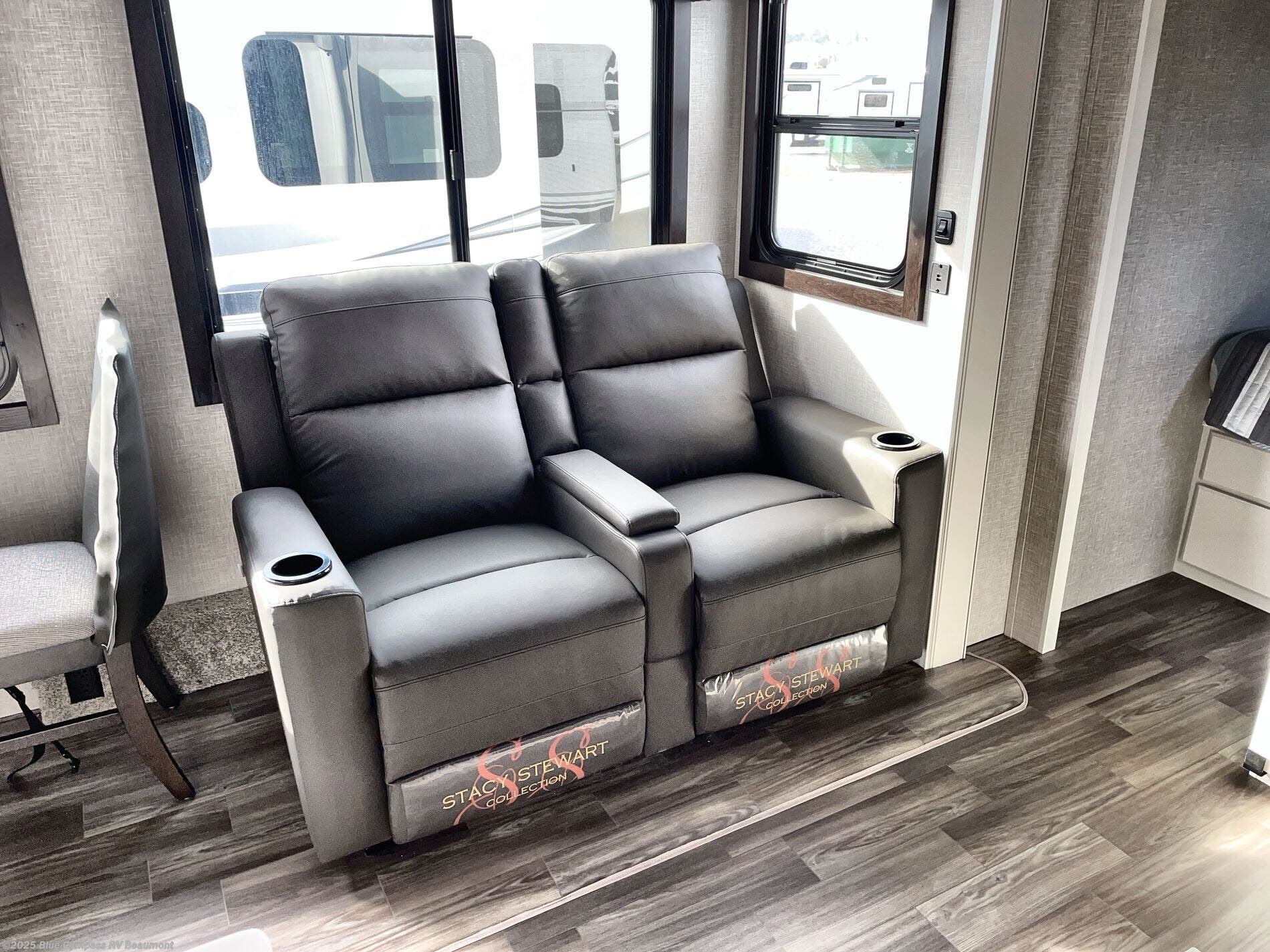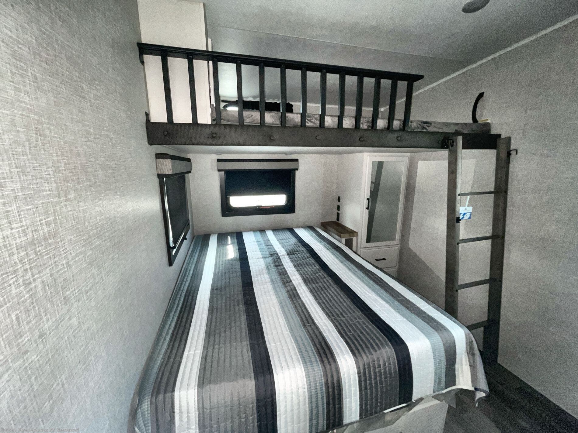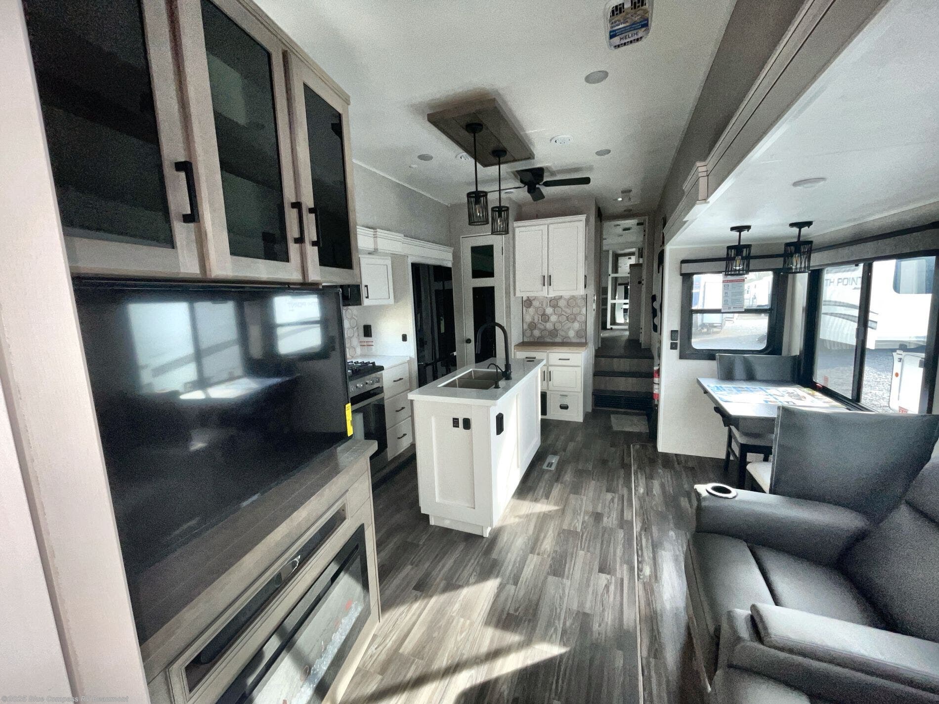This fifth wheel is decked out in features you will love! The dual slides in the main living area create an open floorplan, and then there is a kitchen island that will make meal prepping easier. The theater seats plus table with chairs and a bench have a great view of the entertainment center and fireplace, and there is a ceiling fan here to keep the air moving. And did we mention there is an outside kitchen, complete with an outdoor refrigerator? This model also features a front private bedroom with a king bed slide out, a chest, and a front closet with convenient washer and dryer prep. There is also a rear private bunkhouse that has a 54" x 74" upper loft bed above a 66" x 80" Olympic bed with wardrobe storage drawers, as well as its very own half bathroom!