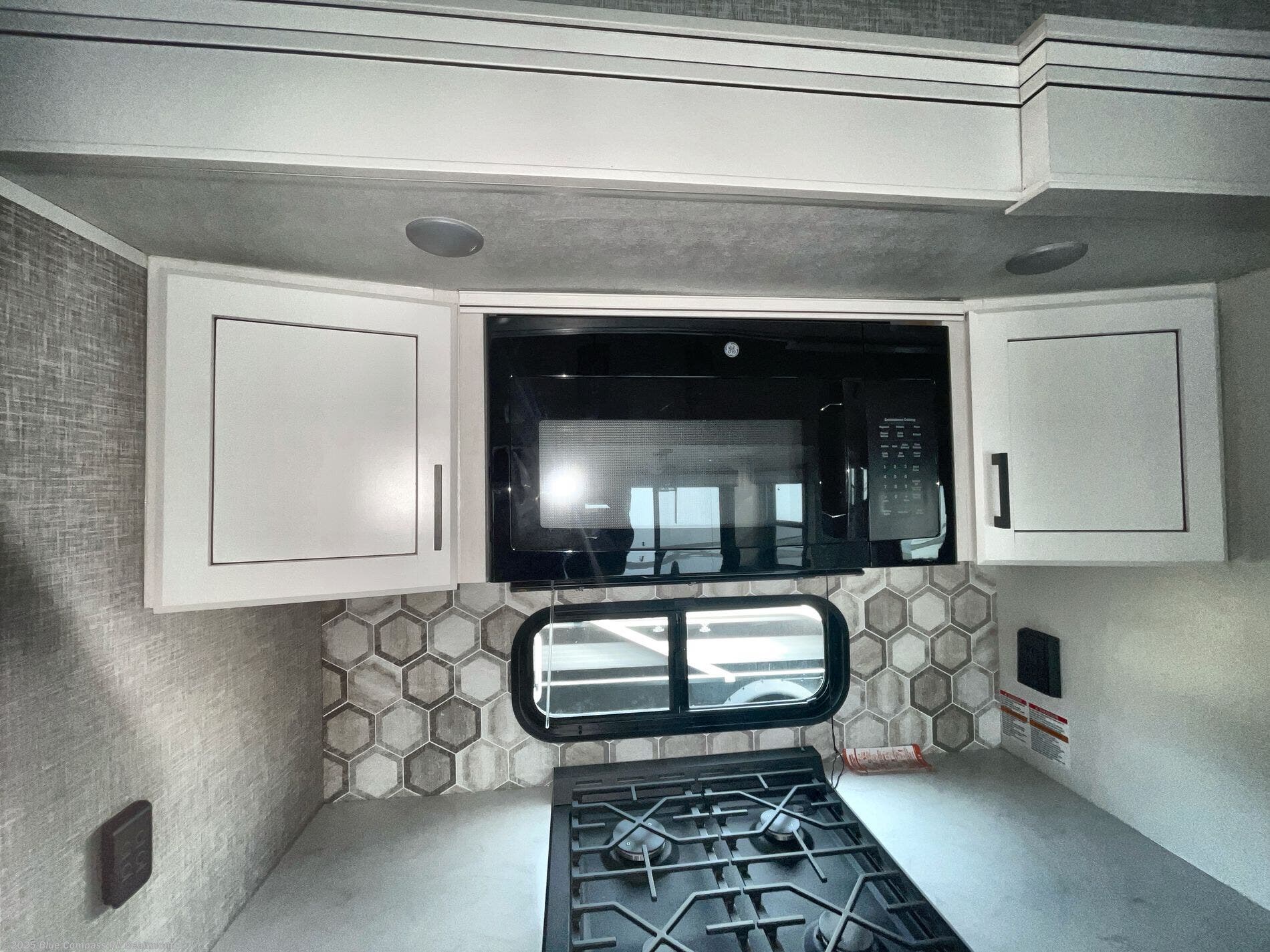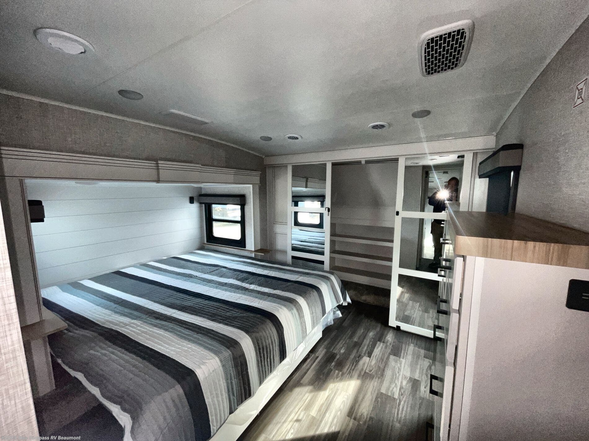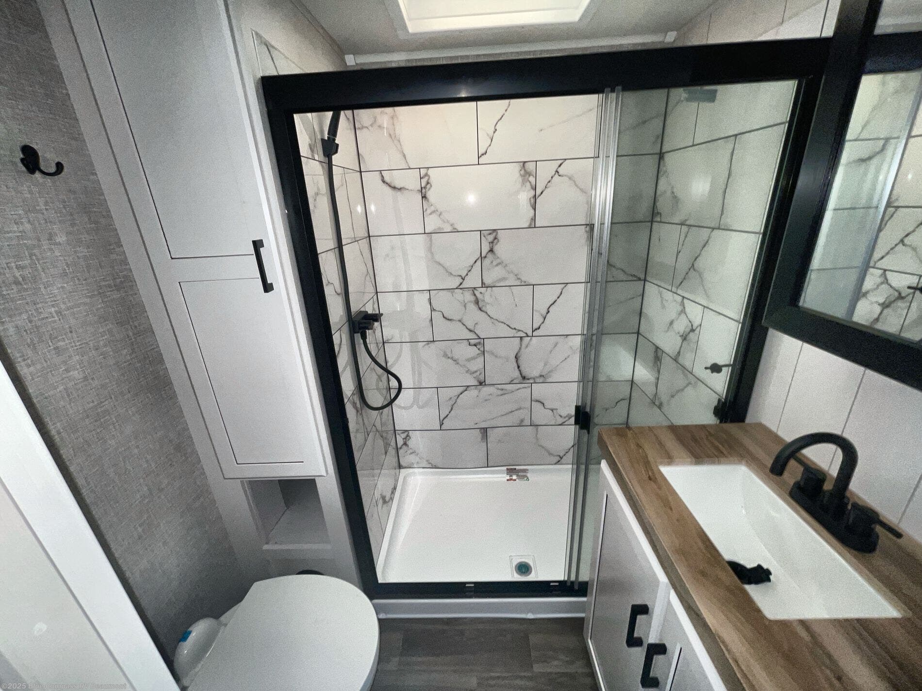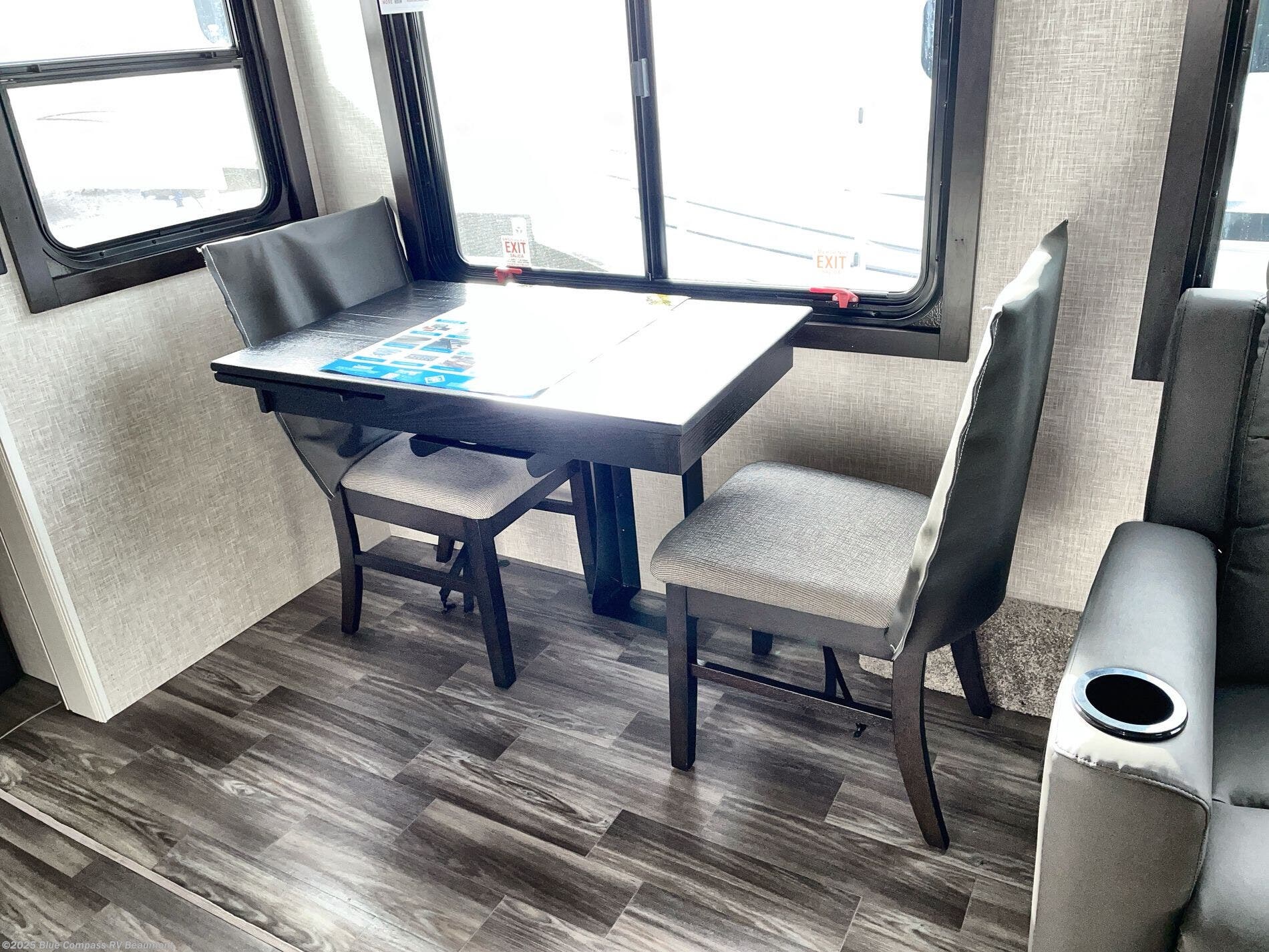 This fifth wheel is decked out in features you will love! The dual slides in the main living area create an open floorplan, and then there is a kitchen island that will make meal prepping easier. The theater seats plus table with chairs and a bench have a great view of the entertainment center and fireplace, and there is a ceiling fan here to keep the air moving. And did we mention there is an outside kitchen, complete with an outdoor refrigerator? This model also features a front private bedroom with a king bed slide out, a chest, and a front closet with convenient washer and dryer prep. There is also a rear private bunkhouse that has a 54" x 74" upper loft bed above a 66" x 80" Olympic bed with wardrobe storage drawers, as well as its very own half bathroom!