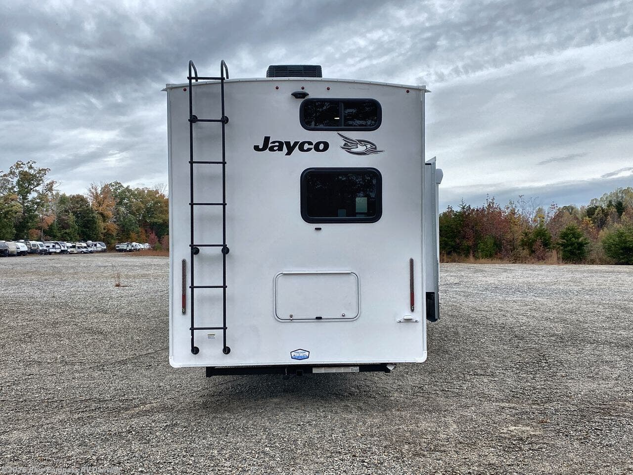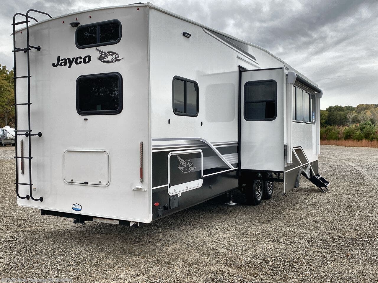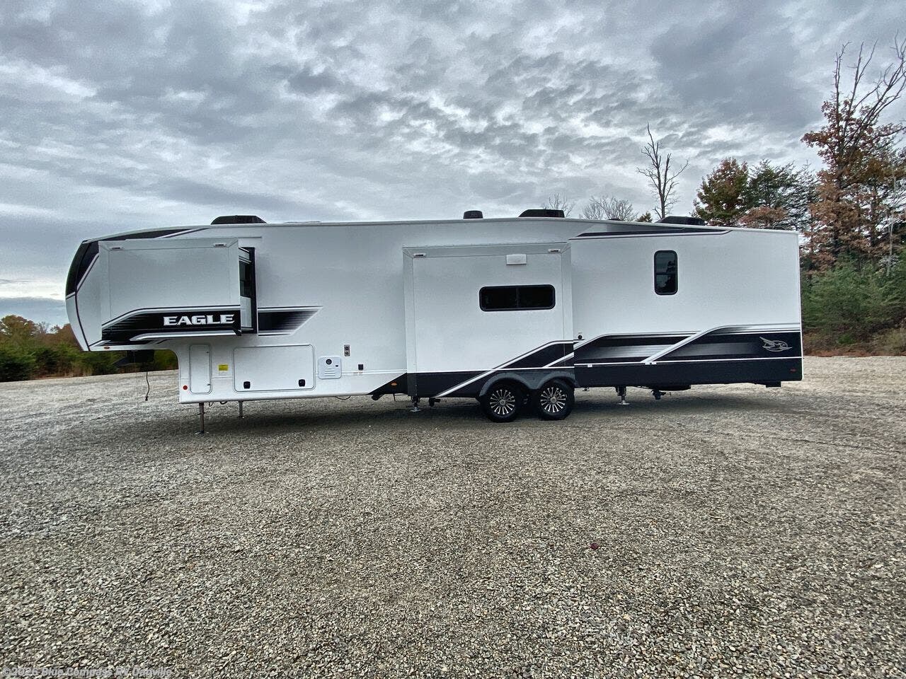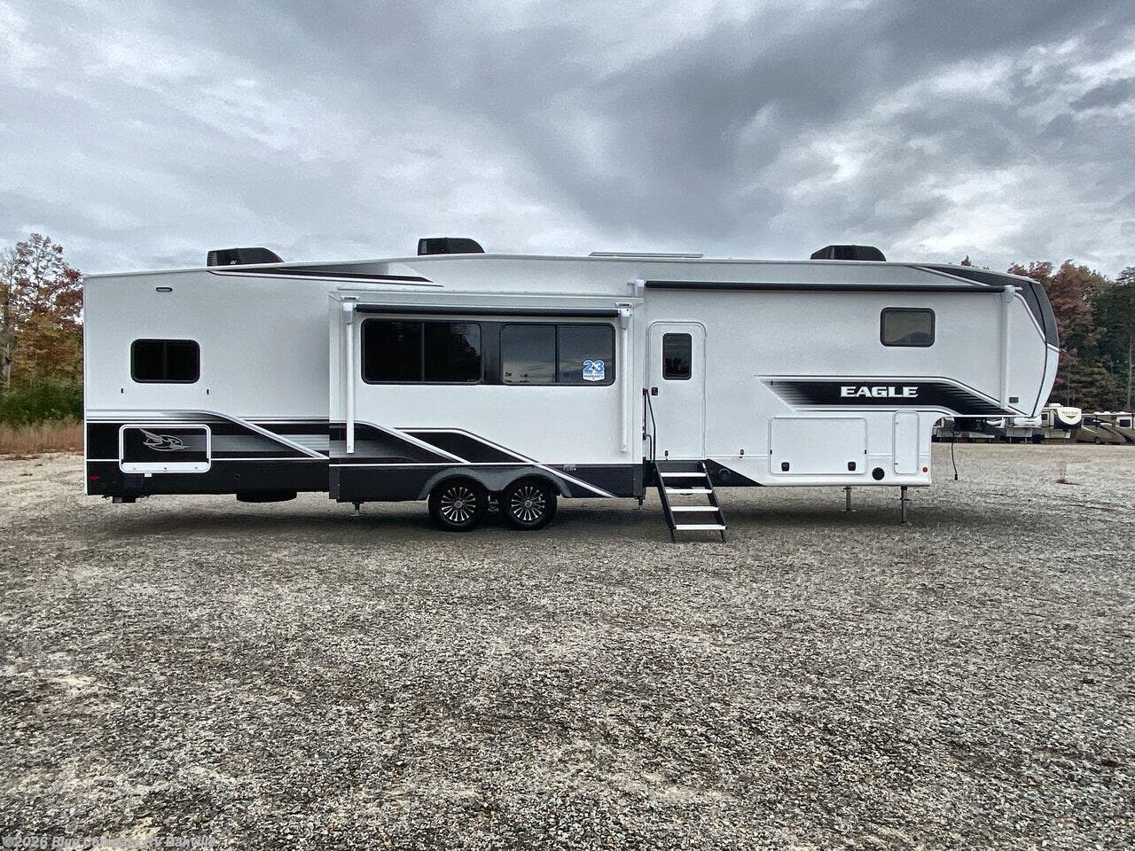 With any Eagle fifth wheel by Jayco you will appreciate durable construction materials, like the Magnum Truss Roof and the Stronghold VBL laminated walls. The JAYCOMMAND Smart RV system puts you in control of your RV's functions, and the 5 Star Handling Package will provide smooth towing from home to camp. Each model features Climate Shield zero-degree tested weather protection and the industry-exclusive HELIX cooling system that features two 15,000 BTU Whisper Quiet A/C's to keep you comfortable year around. Some of the exterior conveniences you are sure to love are the pass-through storage with Slam-Latch baggage doors and an automotive style front cap with max turn radius. The Eagle fifth wheels are designed to make you feel at home with solid hardwood slide fascia, residential vinyl flooring throughout, 100% no floor vents, and blackout roller shades with reflective side throughout for added privacy and insulation.
