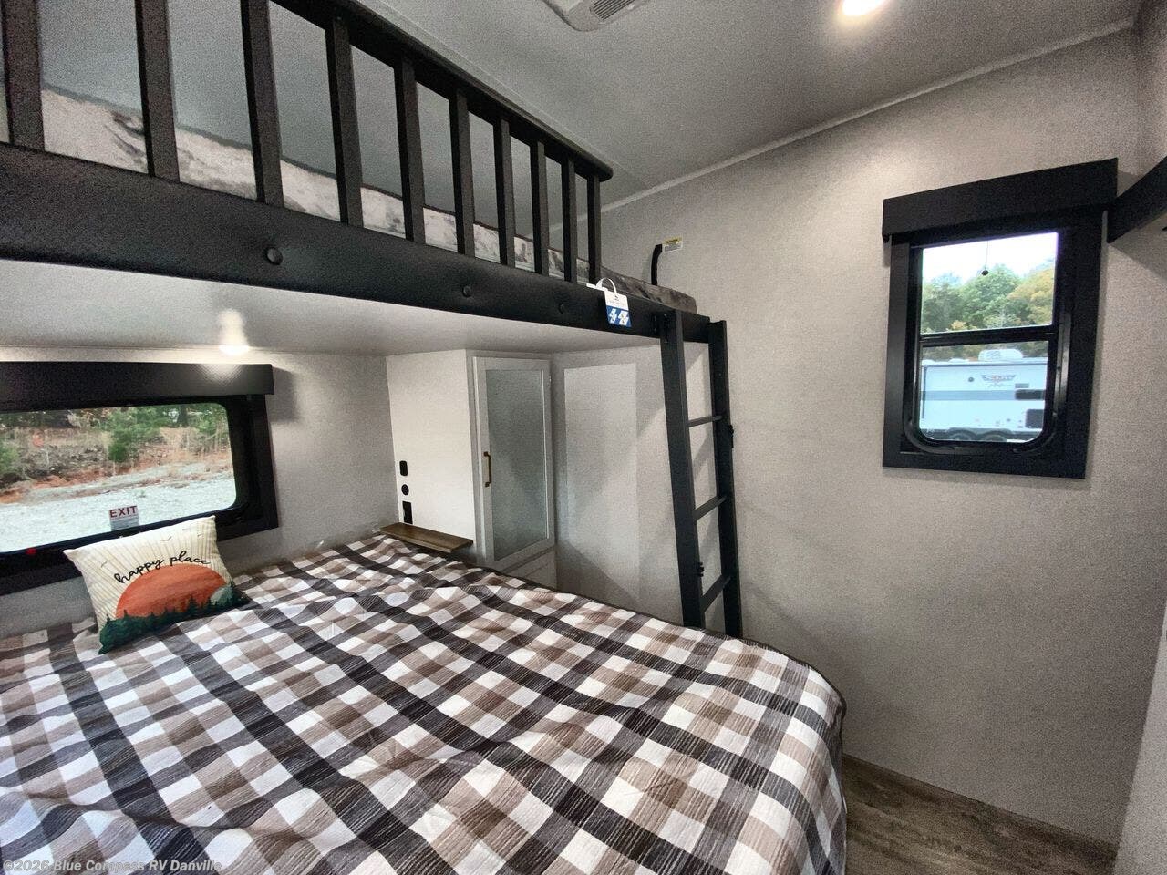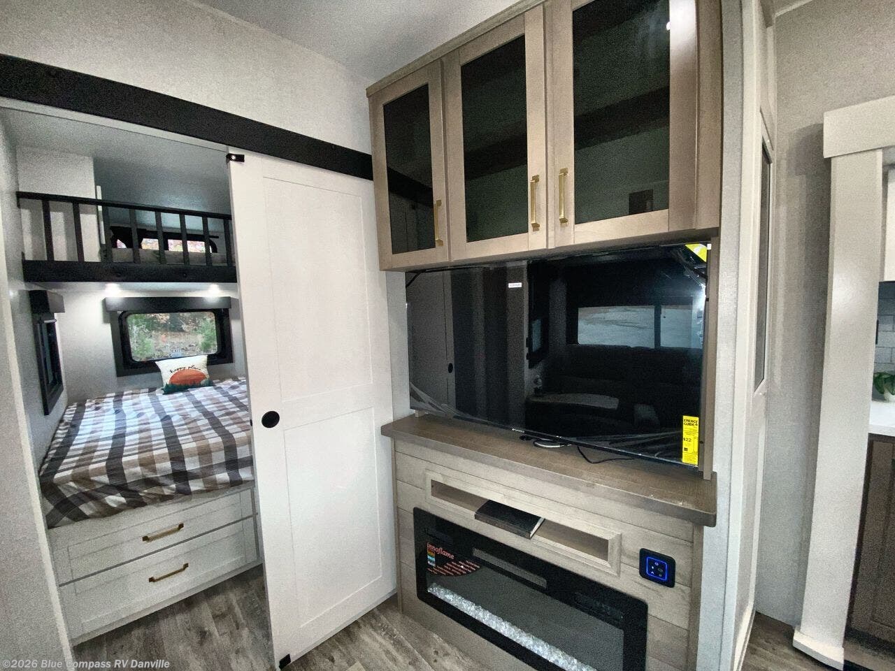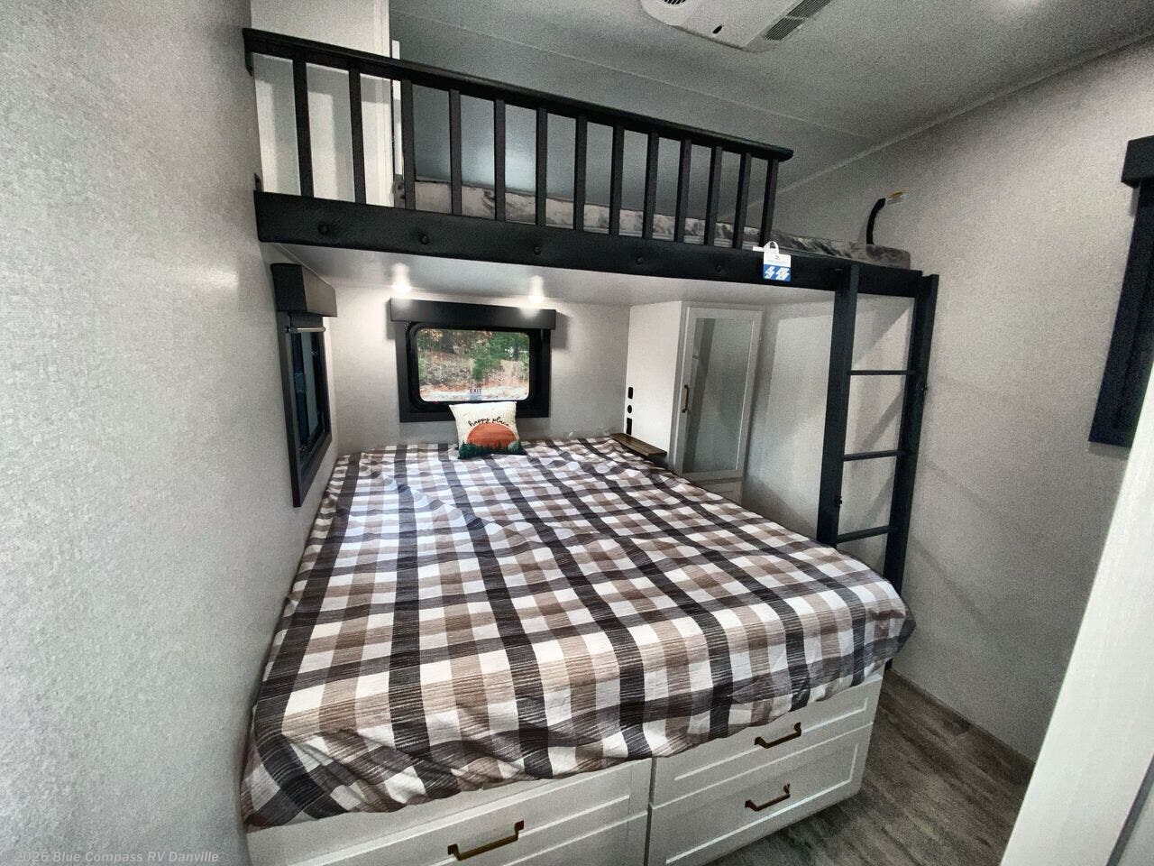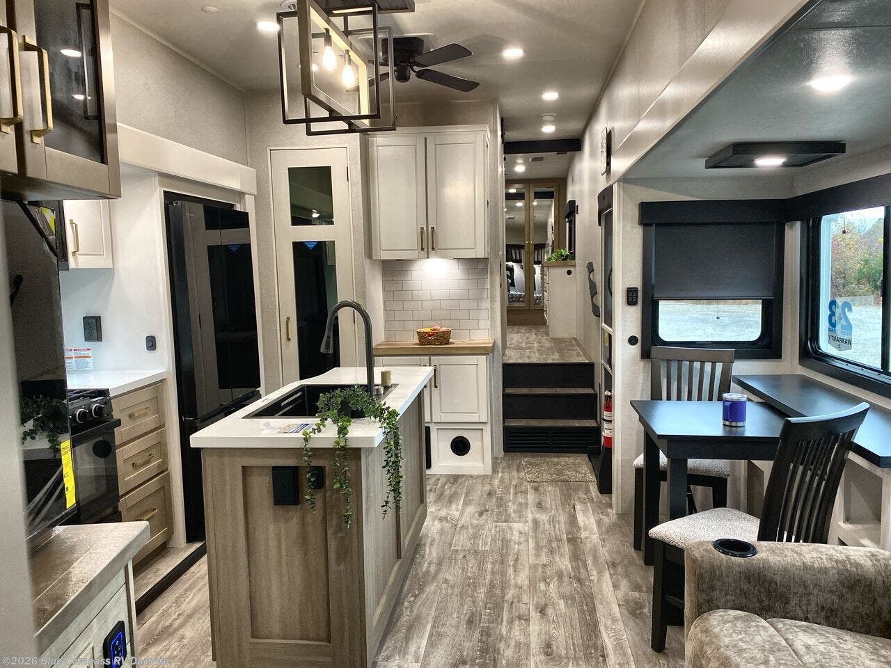 This fifth wheel is decked out in features you will love! The dual slides in the main living area create an open floorplan, and then there is a kitchen island that will make meal prepping easier. The theater seats plus table with chairs and a bench have a great view of the entertainment center and fireplace, and there is a ceiling fan here to keep the air moving. And did we mention there is an outside kitchen, complete with an outdoor refrigerator? This model also features a front private bedroom with a king bed slide out, a chest, and a front closet with convenient washer and dryer prep. There is also a rear private bunkhouse that has a 54" x 74" upper loft bed above a 66" x 80" Olympic bed with wardrobe storage drawers, as well as its very own half bathroom!