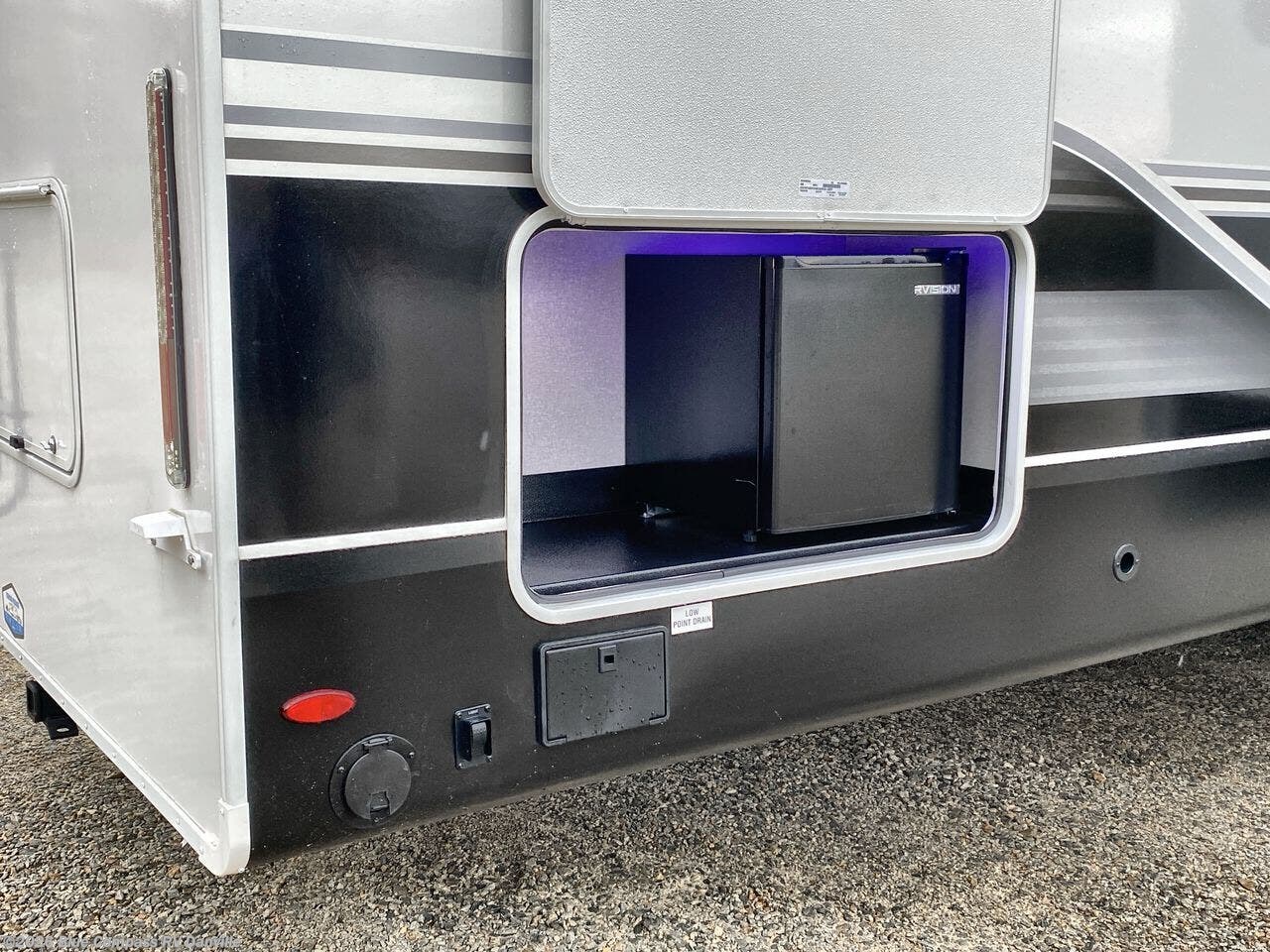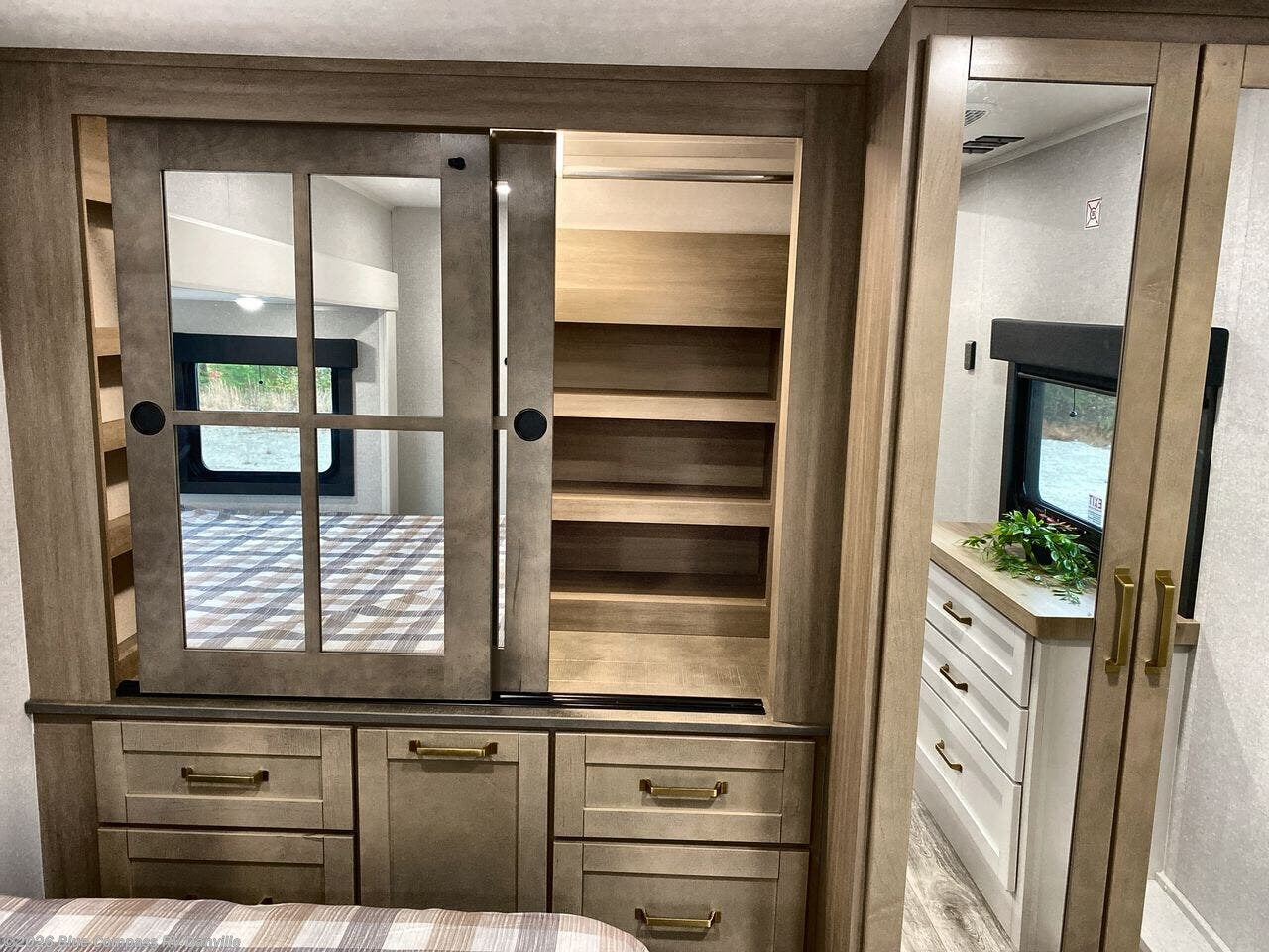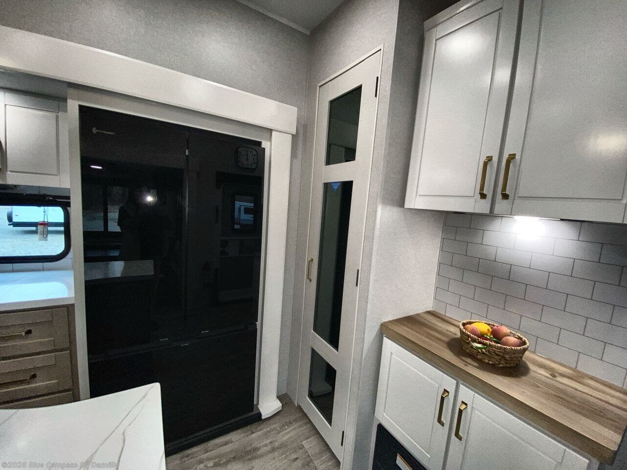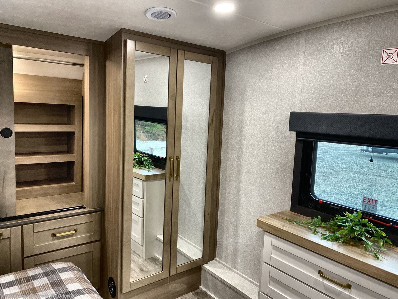 This fifth wheel is decked out in features you will love! The dual slides in the main living area create an open floorplan, and then there is a kitchen island that will make meal prepping easier. The theater seats plus table with chairs and a bench have a great view of the entertainment center and fireplace, and there is a ceiling fan here to keep the air moving. And did we mention there is an outside kitchen, complete with an outdoor refrigerator? This model also features a front private bedroom with a king bed slide out, a chest, and a front closet with convenient washer and dryer prep. There is also a rear private bunkhouse that has a 54" x 74" upper loft bed above a 66" x 80" Olympic bed with wardrobe storage drawers, as well as its very own half bathroom!