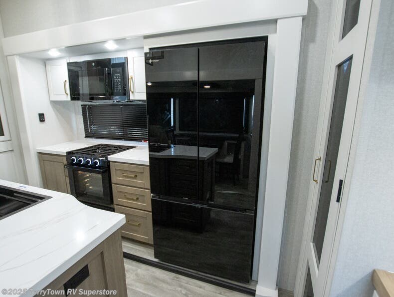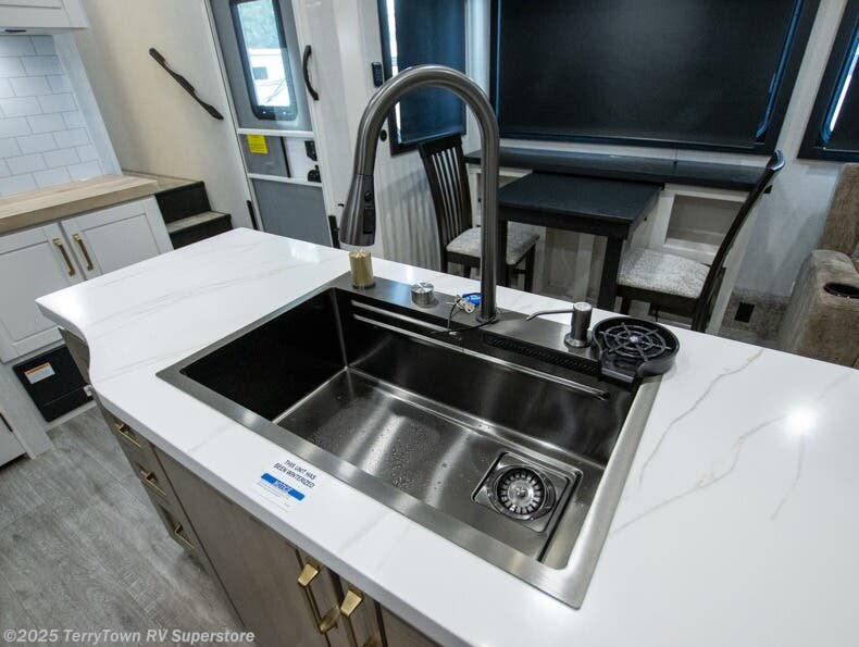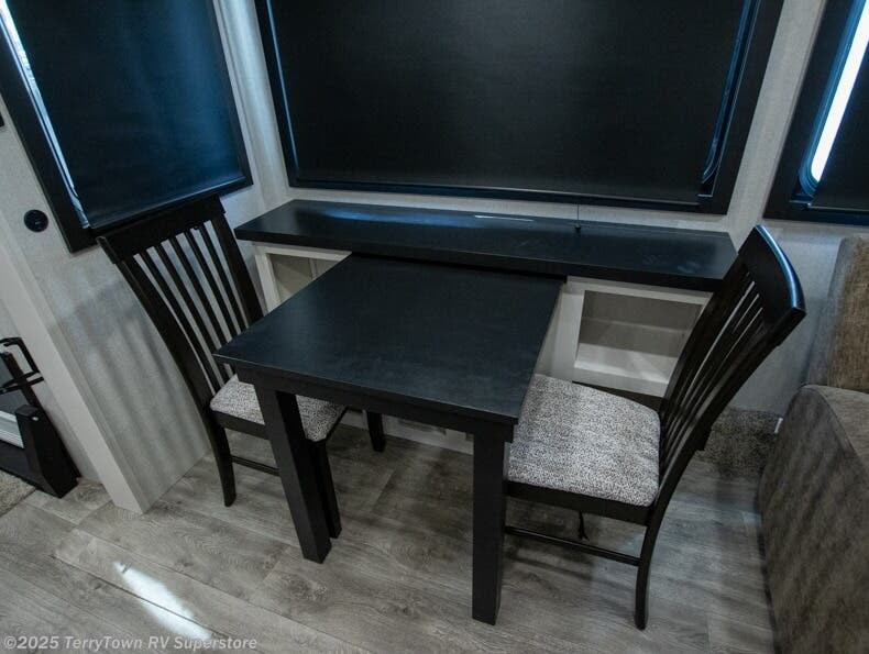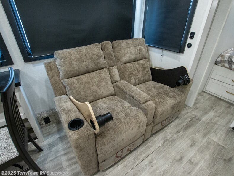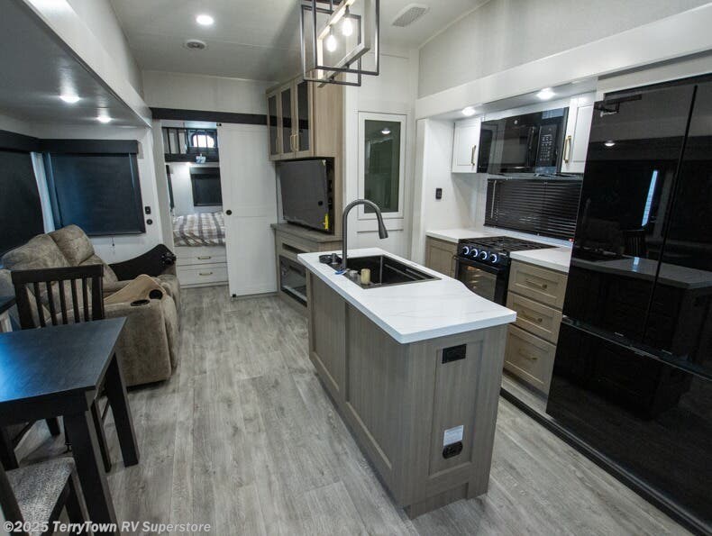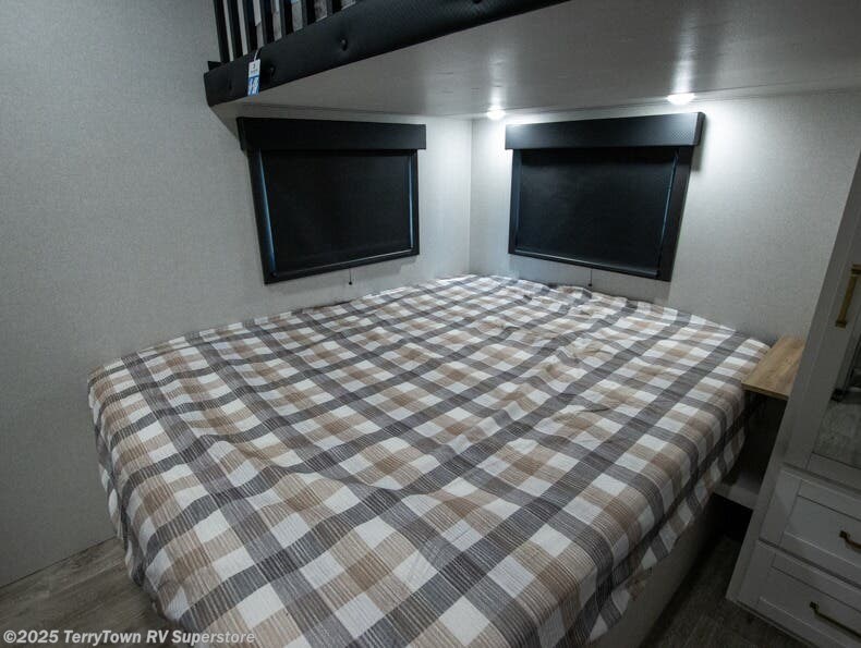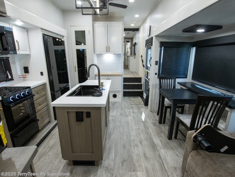 This fifth wheel is decked out in features you will love! The dual slides in the main living area create an open floorplan, and then there is a kitchen island that will make meal prepping easier. The theater seats plus table with chairs and a bench have a great view of the entertainment center and fireplace, and there is a ceiling fan here to keep the air moving. And did we mention there is an outside kitchen, complete with an outdoor refrigerator? This model also features a front private bedroom with a king bed slide out, a chest, and a front closet with convenient washer and dryer prep. There is also a rear private bunkhouse that has a 54" x 74" upper loft bed above a 66" x 80" Olympic bed with wardrobe storage drawers, as well as its very own half bathroom!