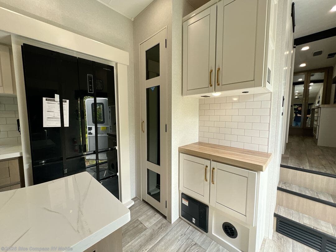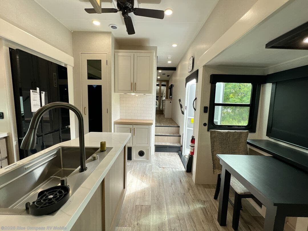 This fifth wheel is decked out in features you will love! The dual slides in the main living area create an open floorplan, and then there is a kitchen island that will make meal prepping easier. The theater seats plus table with chairs and a bench have a great view of the entertainment center and fireplace, and there is a ceiling fan here to keep the air moving. And did we mention there is an outside kitchen, complete with an outdoor refrigerator? This model also features a front private bedroom with a king bed slide out, a chest, and a front closet with convenient washer and dryer prep. There is also a rear private bunkhouse that has a 54" x 74" upper loft bed above a 66" x 80" Olympic bed with wardrobe storage drawers, as well as its very own half bathroom!