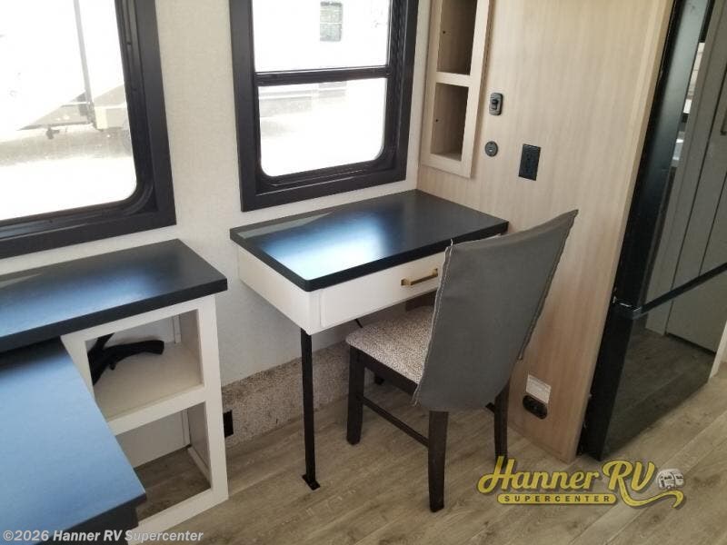 It will be so easy to enjoy time in this spacious fifth wheel! The chef of your group is sure to love the rear kitchen with a U-shaped counter and plenty of storage for food and dishes. The middle living area includes an entertainment center with a fireplace across from the L-shaped sofa for movie nights. There is also a desk to get some work done and a roll-top dinette with two chairs to dine at. Heading up front, you'll find the spacious bathroom that includes a shower with a seat, and the front private bedroom with a king bed slide out. There is also a chest with a TV, front shelves with drawers, plus washer and dryer prep!