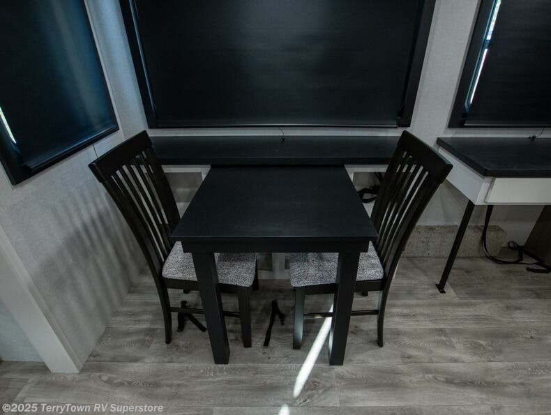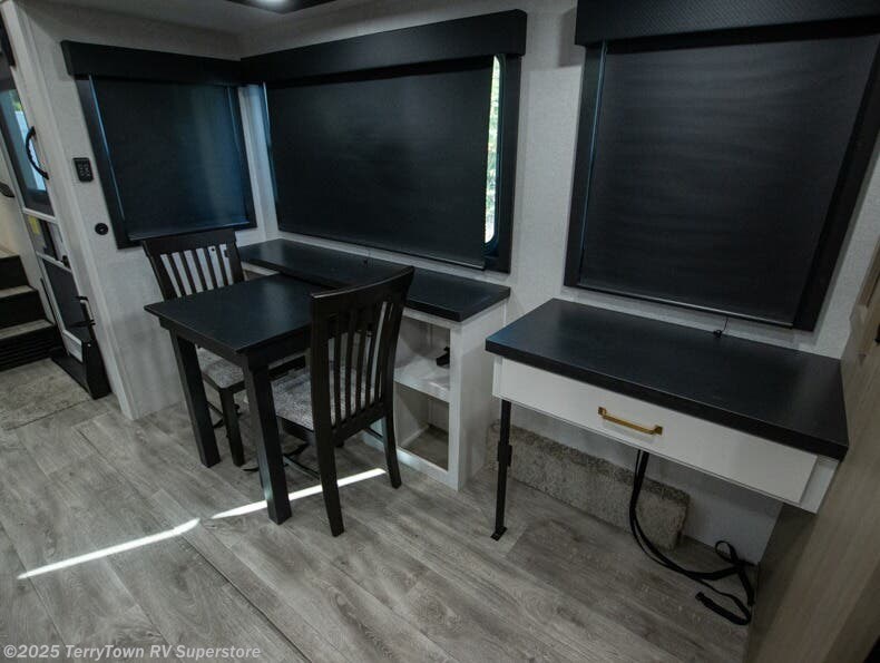 It will be so easy to enjoy time in this spacious fifth wheel! The chef of your group is sure to love the rear kitchen with a U-shaped counter and plenty of storage for food and dishes. The middle living area includes an entertainment center with a fireplace across from the L-shaped sofa for movie nights. There is also a desk to get some work done and a roll-top dinette with two chairs to dine at. Heading up front, you'll find the spacious bathroom that includes a shower with a seat, and the front private bedroom with a king bed slide out. There is also a chest with a TV, front shelves with drawers, plus washer and dryer prep!
