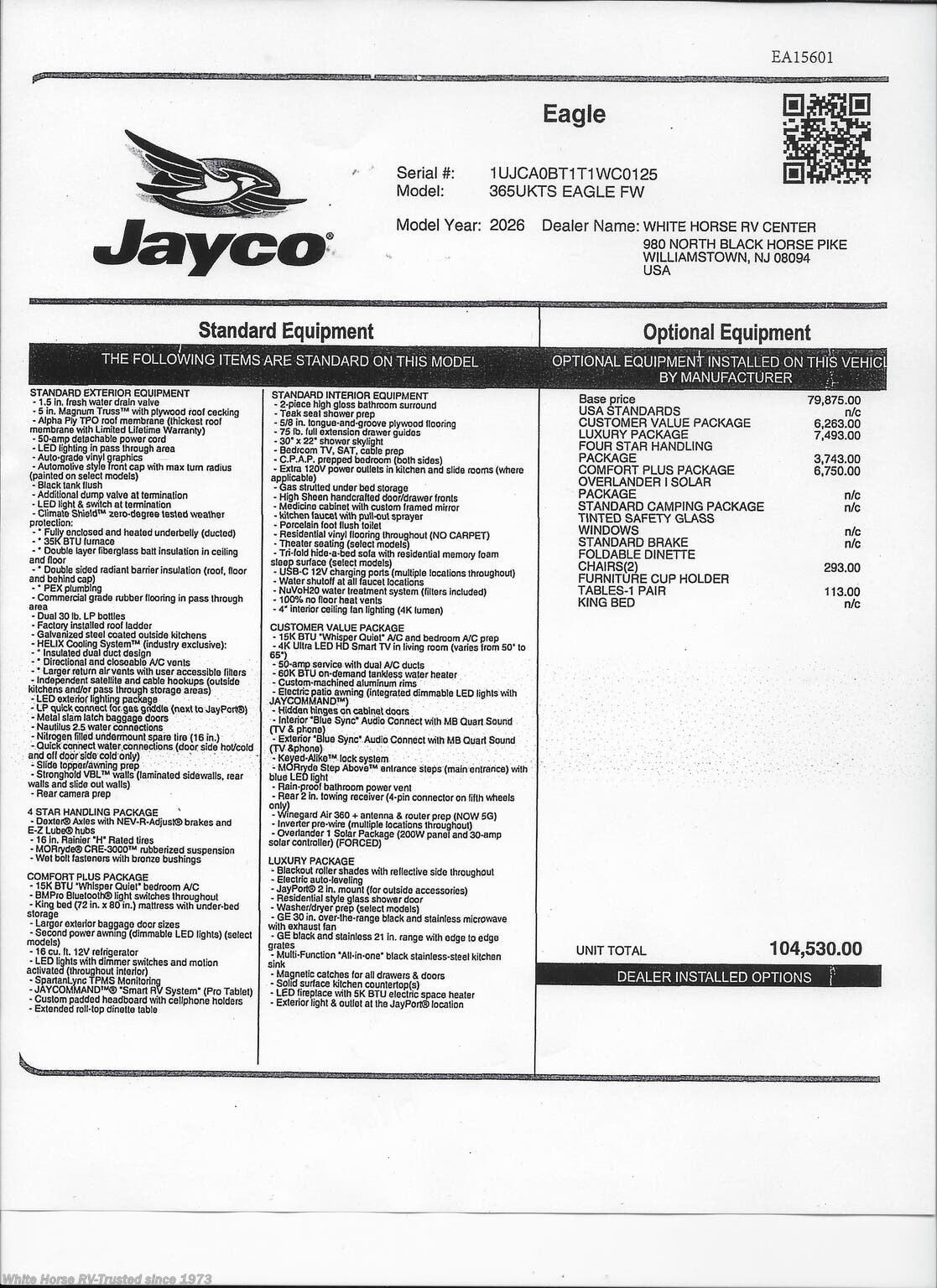 This Stock# EA15601 also has the following factory options included: Interior Decor Calli Linen, Foldable Dinette Chairs (2) & Furniture Cup Holder Tables - 1 pair ...all backed by Jayco's exclusive 2 + 3 year warranty!! MSRP $104,530.