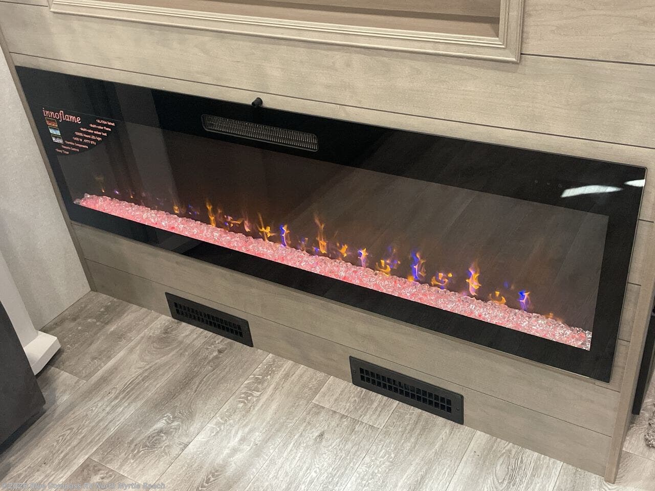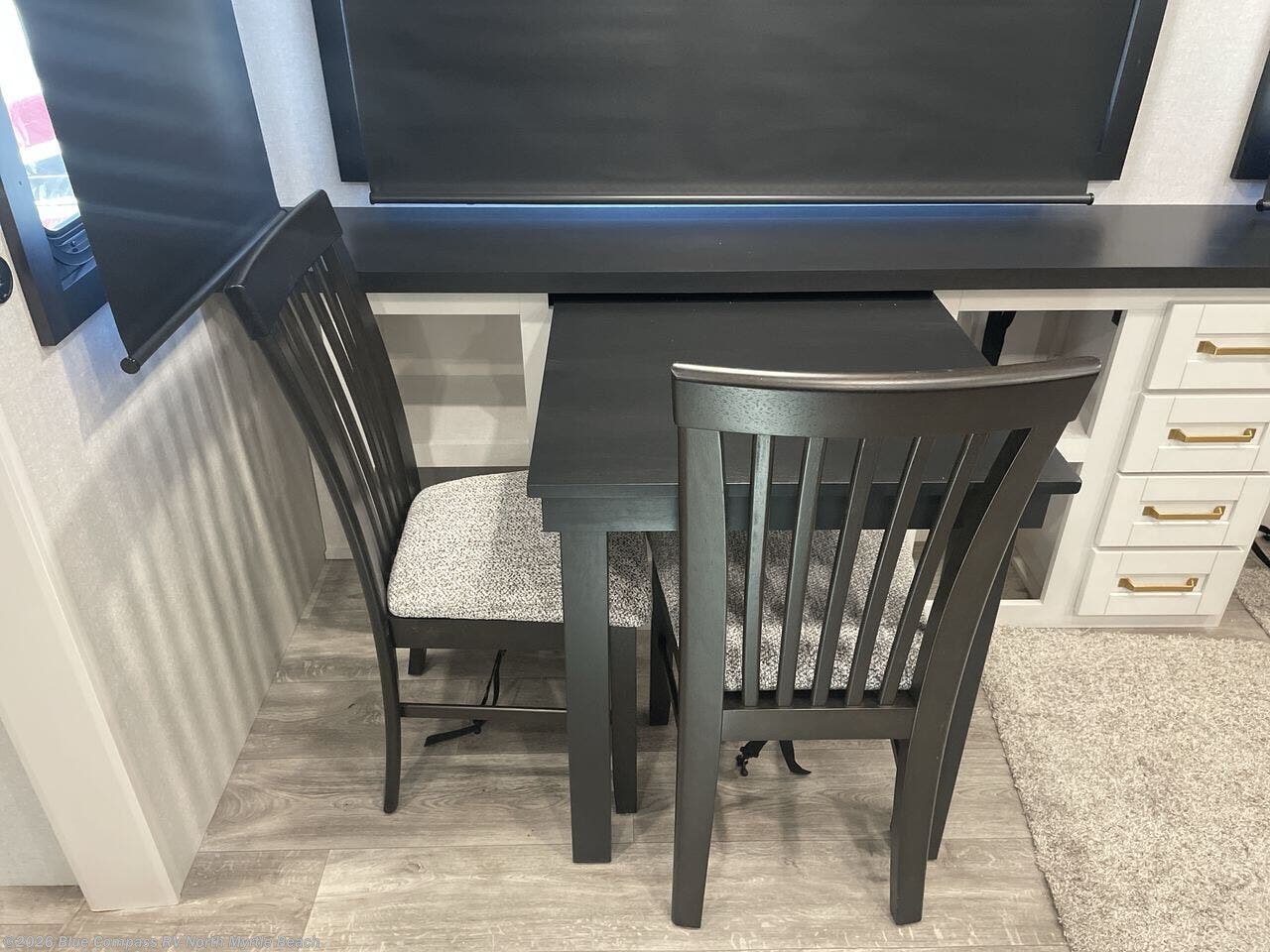 It will be so easy to enjoy time in this spacious fifth wheel! The chef of your group is sure to love the rear kitchen with a U-shaped counter and plenty of storage for food and dishes. The middle living area includes an entertainment center with a fireplace across from the L-shaped sofa for movie nights. There is also a desk to get some work done and a roll-top dinette with two chairs to dine at. Heading up front, you'll find the spacious bathroom that includes a shower with a seat, and the front private bedroom with a king bed slide out. There is also a chest with a TV, front shelves with drawers, plus washer and dryer prep!