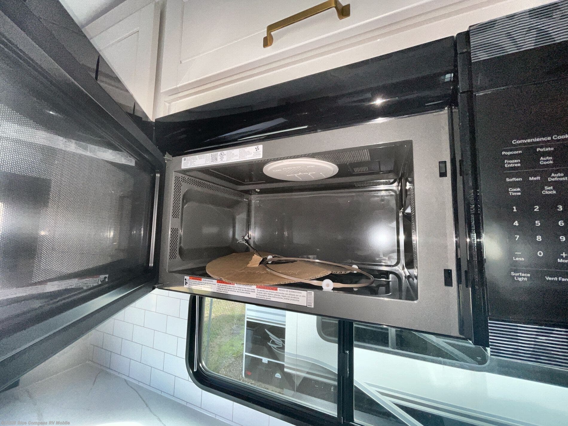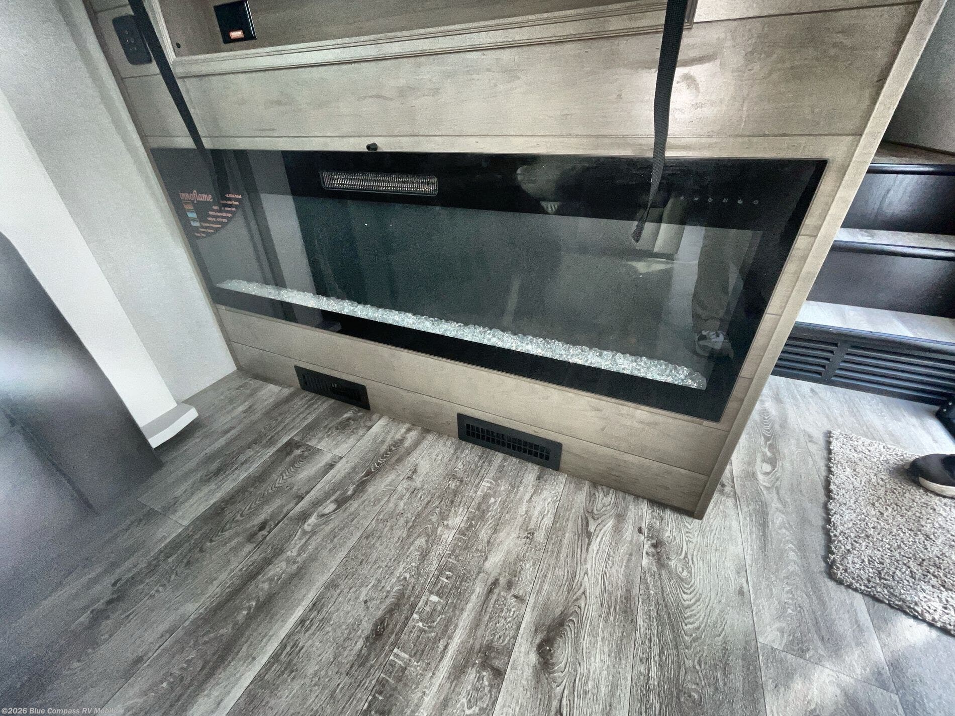 It will be so easy to enjoy time in this spacious fifth wheel! The chef of your group is sure to love the rear kitchen with a U-shaped counter and plenty of storage for food and dishes. The middle living area includes an entertainment center with a fireplace across from the L-shaped sofa for movie nights. There is also a desk to get some work done and a roll-top dinette with two chairs to dine at. Heading up front, you'll find the spacious bathroom that includes a shower with a seat, and the front private bedroom with a king bed slide out. There is also a chest with a TV, front shelves with drawers, plus washer and dryer prep!