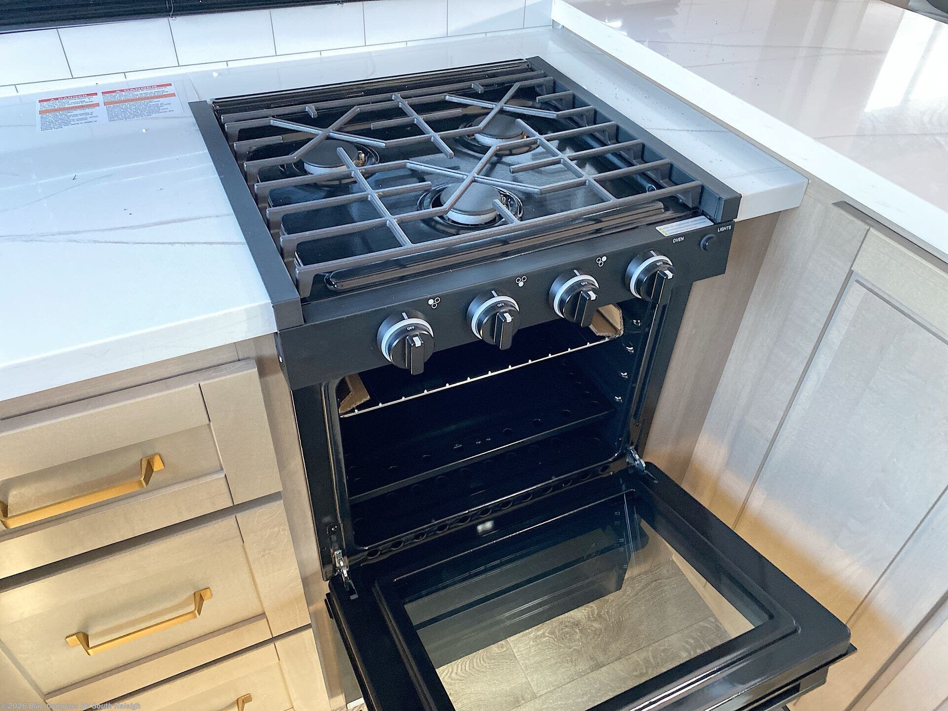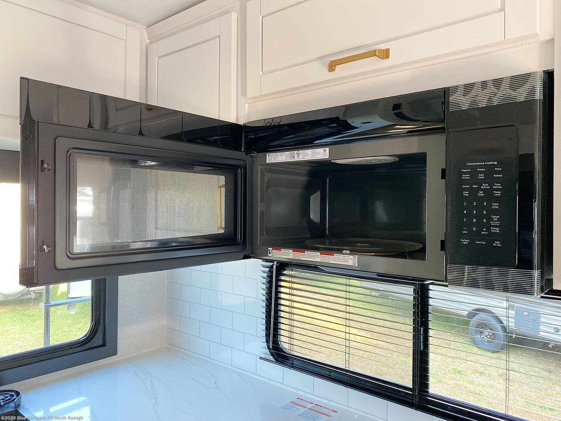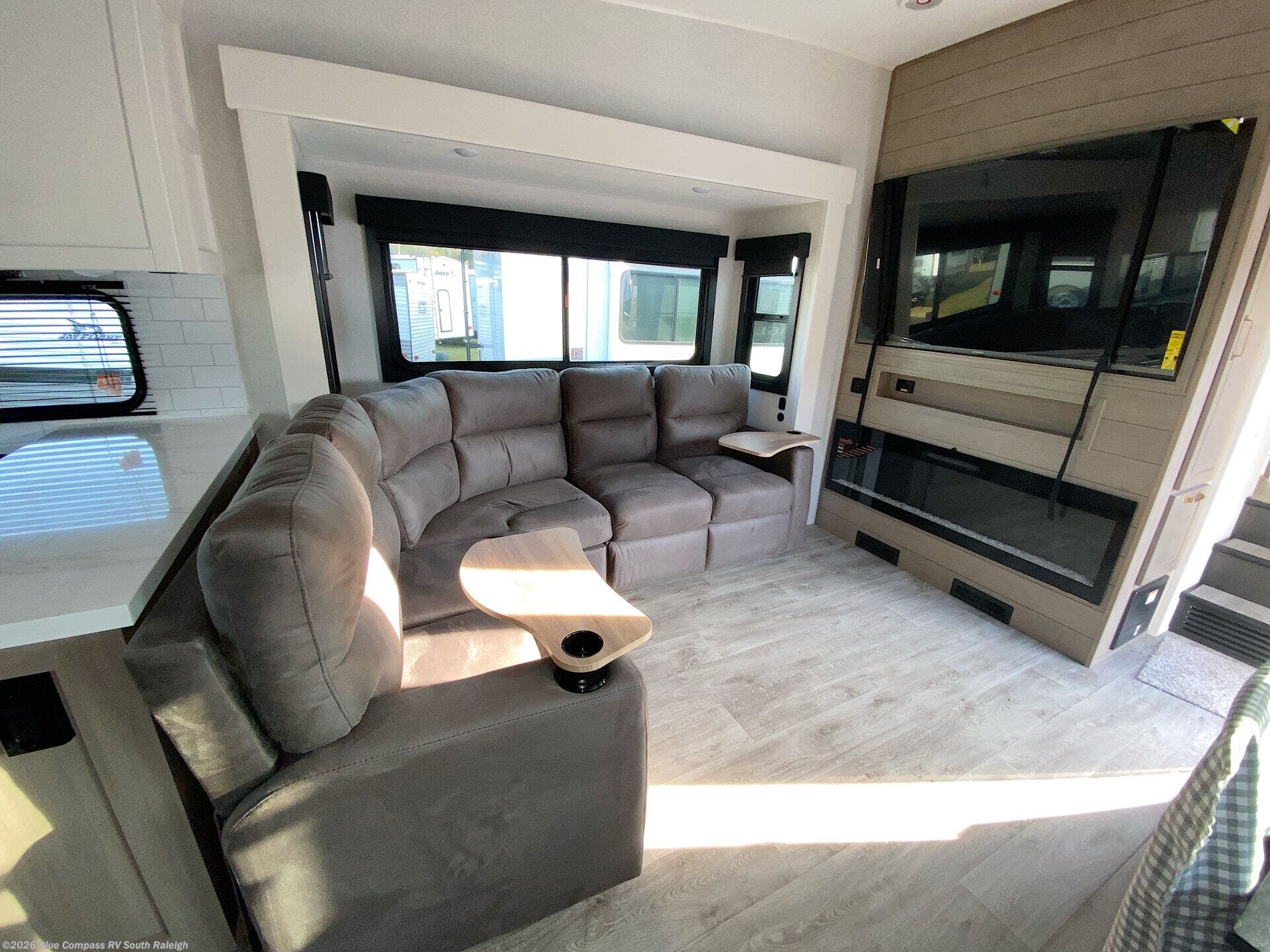 It will be so easy to enjoy time in this spacious fifth wheel! The chef of your group is sure to love the rear kitchen with a U-shaped counter and plenty of storage for food and dishes. The middle living area includes an entertainment center with a fireplace across from the L-shaped sofa for movie nights. There is also a desk to get some work done and a roll-top dinette with two chairs to dine at. Heading up front, you'll find the spacious bathroom that includes a shower with a seat, and the front private bedroom with a king bed slide out. There is also a chest with a TV, front shelves with drawers, plus washer and dryer prep!