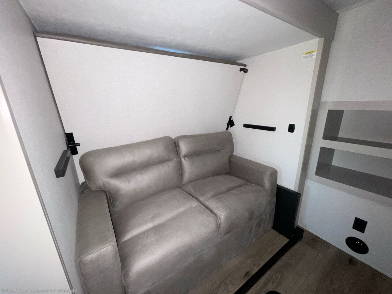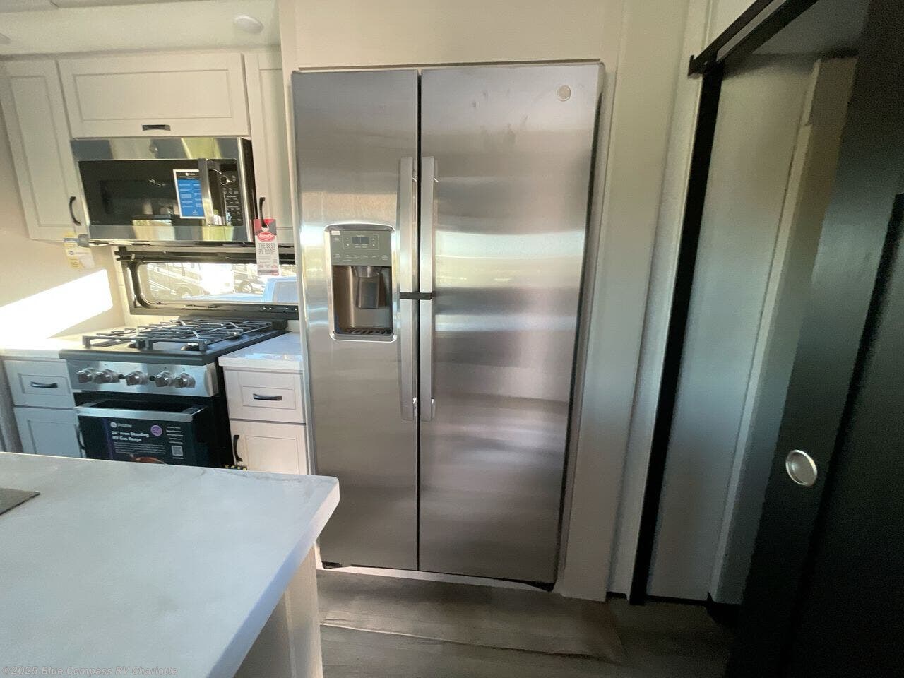 It will be so easy to enjoy time in this spacious fifth wheel! The chef of your group is sure to love the rear kitchen with a U-shaped counter and plenty of storage for food and dishes. The middle living area includes an entertainment center with a fireplace across from the L-shaped sofa for movie nights. There is also a desk to get some work done and a roll-top dinette with two chairs to dine at. Heading up front, you'll find the spacious bathroom that includes a shower with a seat, and the front private bedroom with a king bed slide out. There is also a chest with a TV, front shelves with drawers, plus washer and dryer prep!