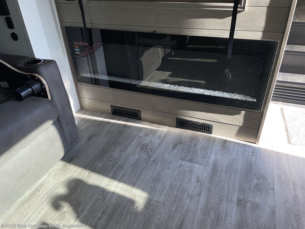 It will be so easy to enjoy time in this spacious fifth wheel! The chef of your group is sure to love the rear kitchen with a U-shaped counter and plenty of storage for food and dishes. The middle living area includes an entertainment center with a fireplace across from the L-shaped sofa for movie nights. There is also a desk to get some work done and a roll-top dinette with two chairs to dine at. Heading up front, you'll find the spacious bathroom that includes a shower with a seat, and the front private bedroom with a king bed slide out. There is also a chest with a TV, front shelves with drawers, plus washer and dryer prep!