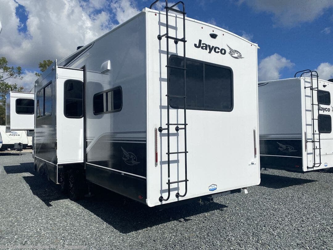 With any Eagle fifth wheel by Jayco you will appreciate durable construction materials, like the Magnum Truss Roof and the Stronghold VBL laminated walls. The JAYCOMMAND Smart RV system puts you in control of your RV's functions, and the 5 Star Handling Package will provide smooth towing from home to camp. Each model features Climate Shield zero-degree tested weather protection and the industry-exclusive HELIX cooling system that features two 15,000 BTU Whisper Quiet A/C's to keep you comfortable year around. Some of the exterior conveniences you are sure to love are the pass-through storage with Slam-Latch baggage doors and an automotive style front cap with max turn radius. The Eagle fifth wheels are designed to make you feel at home with solid hardwood slide fascia, residential vinyl flooring throughout, 100% no floor vents, and blackout roller shades with reflective side throughout for added privacy and insulation.