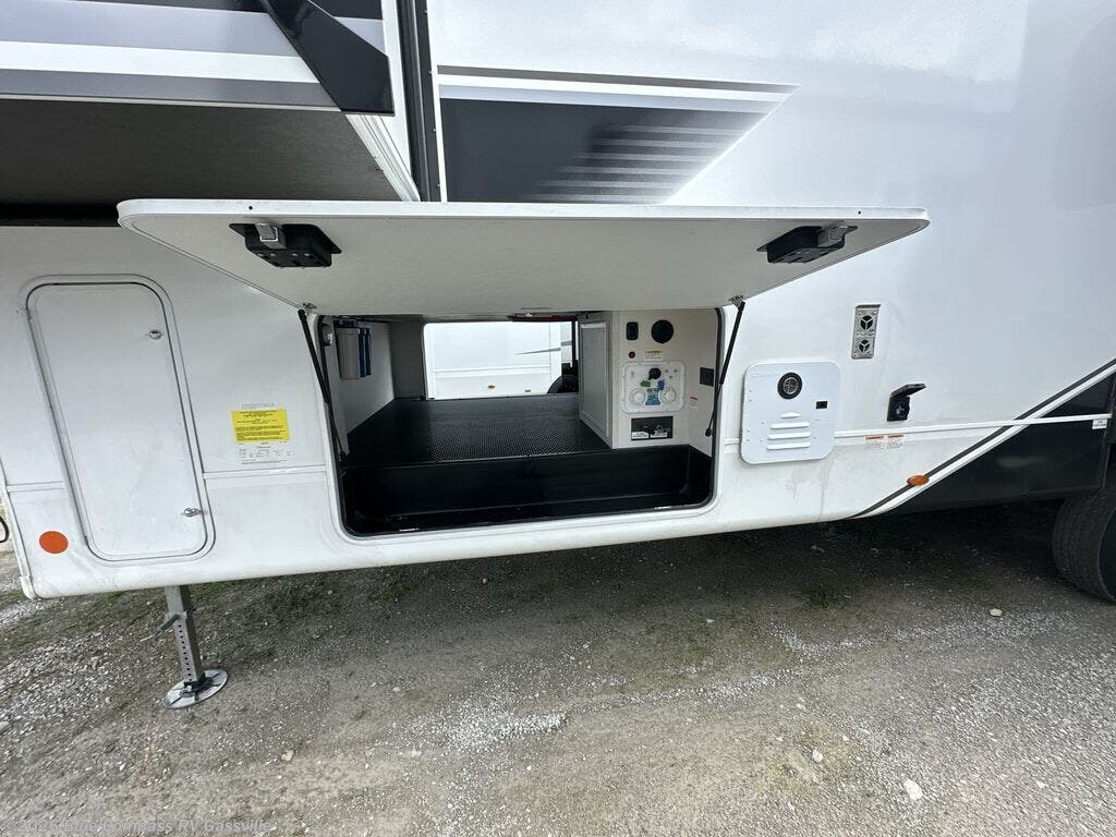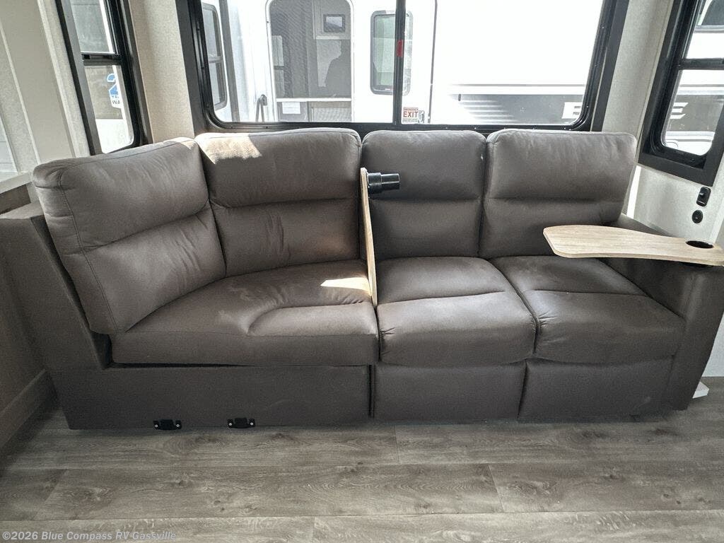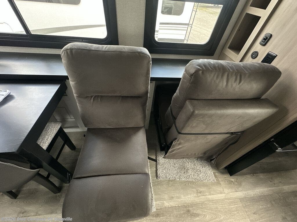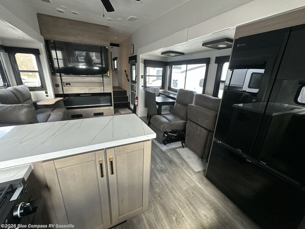 It will be so easy to enjoy time in this spacious fifth wheel! The chef of your group is sure to love the rear kitchen with a U-shaped counter and plenty of storage for food and dishes. The middle living area includes an entertainment center with a fireplace across from the L-shaped sofa for movie nights. There is also a desk to get some work done and a roll-top dinette with two chairs to dine at. Heading up front, you'll find the spacious bathroom that includes a shower skylight, and the front private bedroom with a king bed slide out. There is also a chest with a TV, front shelves with drawers, plus washer and dryer prep!