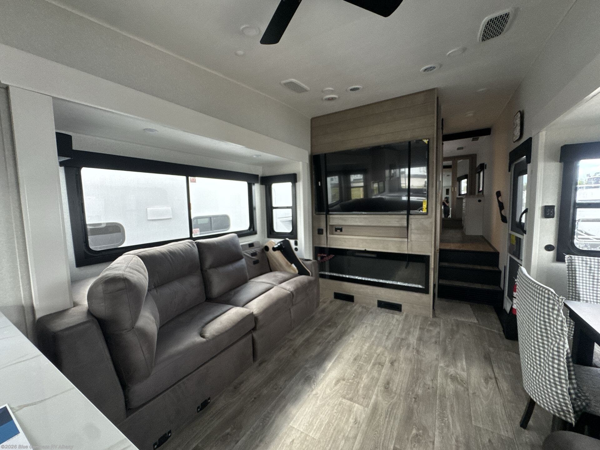 It will be so easy to enjoy time in this spacious fifth wheel! The chef of your group is sure to love the rear kitchen with a U-shaped counter and plenty of storage for food and dishes. The middle living area includes an entertainment center with a fireplace across from the L-shaped sofa for movie nights. There is also a desk to get some work done and a roll-top dinette with two chairs to dine at. Heading up front, you'll find the spacious bathroom that includes a shower skylight, and the front private bedroom with a king bed slide out. There is also a chest with a TV, front shelves with drawers, plus washer and dryer prep!