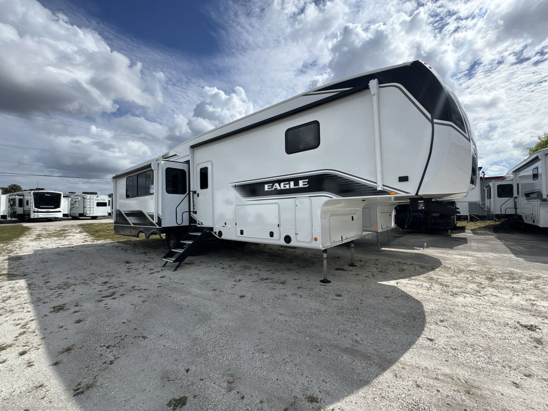 With any Eagle fifth wheel by Jayco you will appreciate durable construction materials, like the Magnum Truss Roof and the Stronghold VBL laminated walls. The JAYCOMMAND Smart RV system puts you in control of your RV's functions, and the 4 Star Handling Package will provide smooth towing from home to camp. Each model features Climate Shield zero-degree tested weather protection and the industry-exclusive HELIX cooling system that features two 15,000 BTU Whisper Quiet A/C's to keep you comfortable during those colder months. Some of the exterior conveniences you are sure to love are the pass-through storage with Slam-Latch baggage doors and an automotive style front cap with max turn radius. The Eagle fifth wheels are designed to make you feel at home with solid surface countertops, residential vinyl flooring throughout, 100% no floor vents, and blackout roller shades with reflective side throughout for added privacy and insulation.