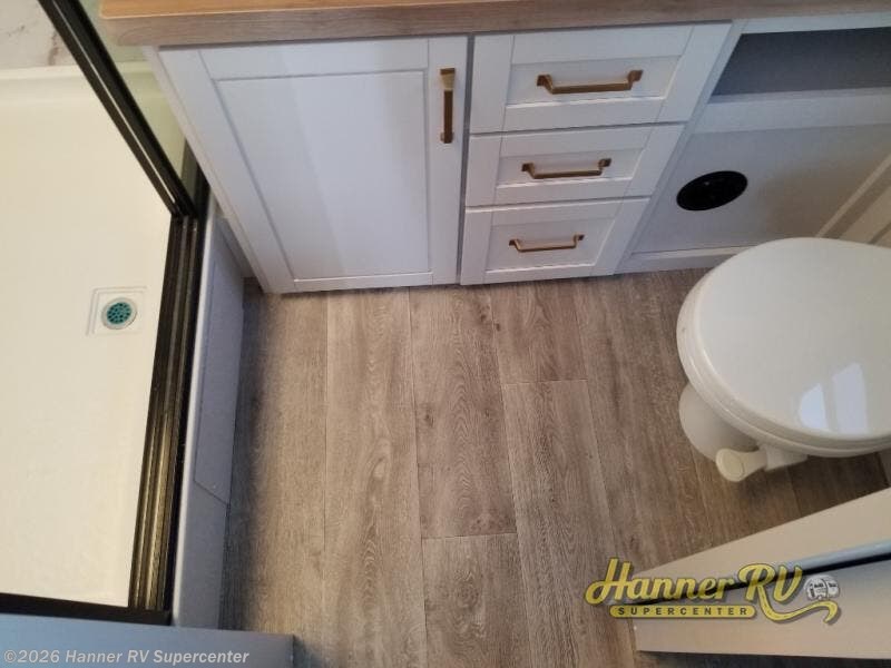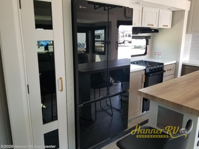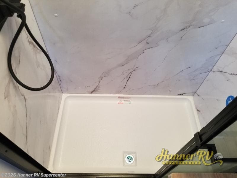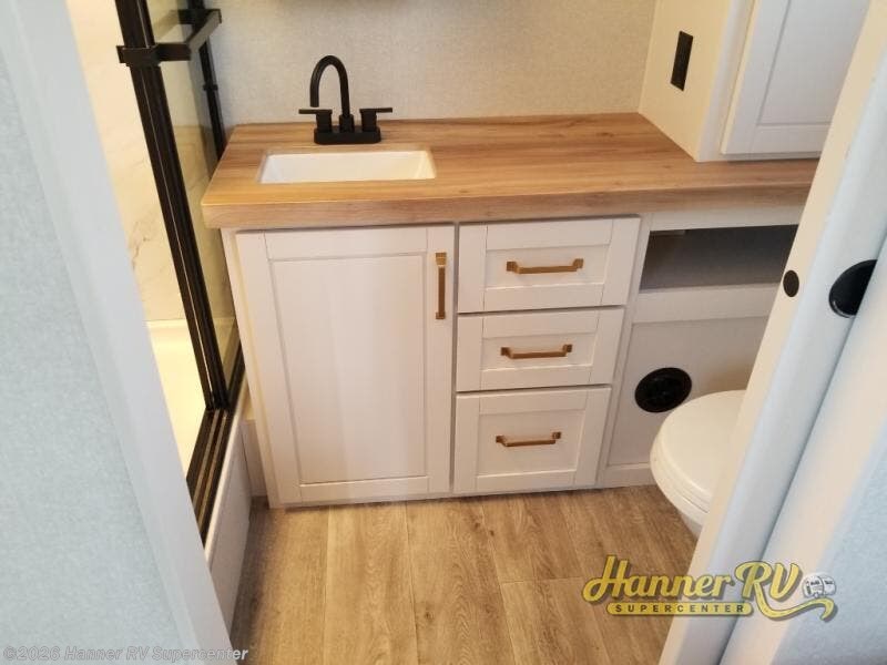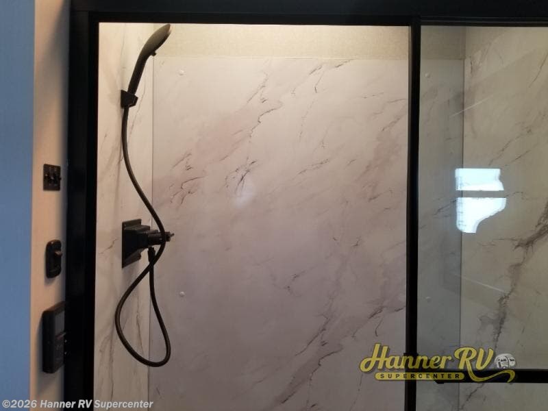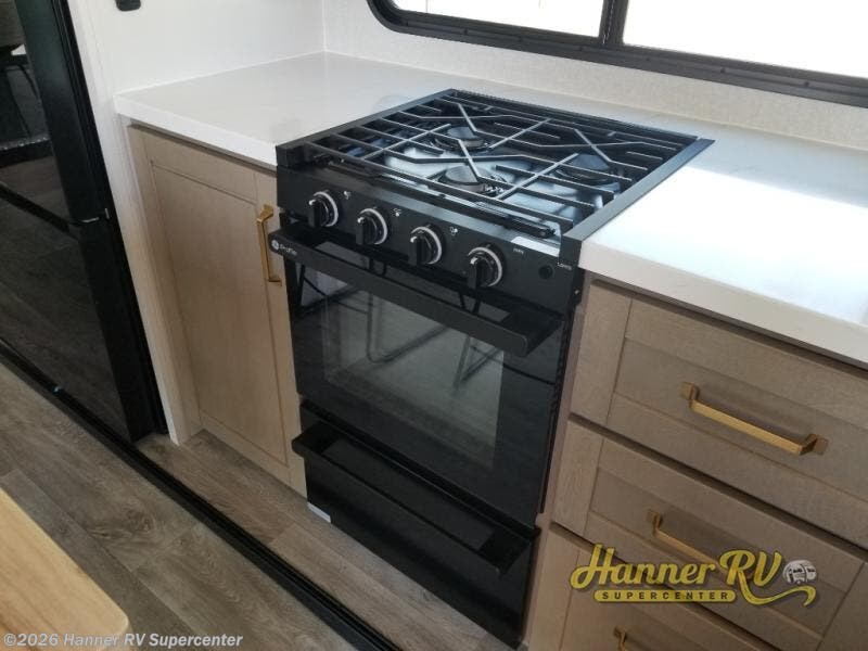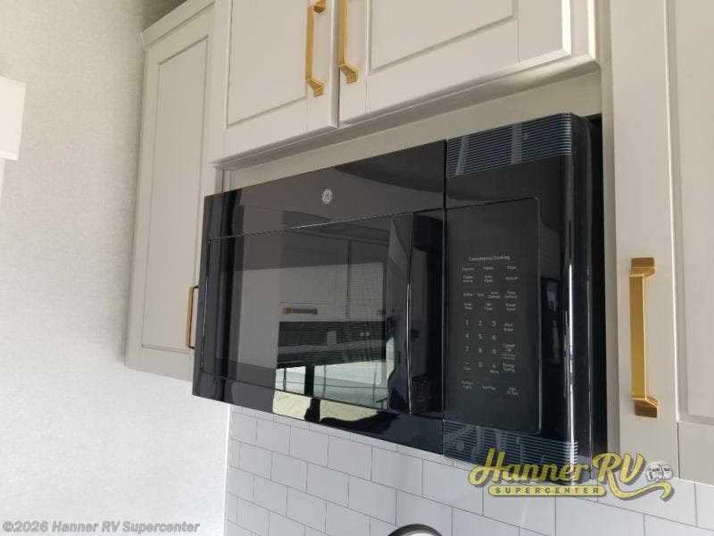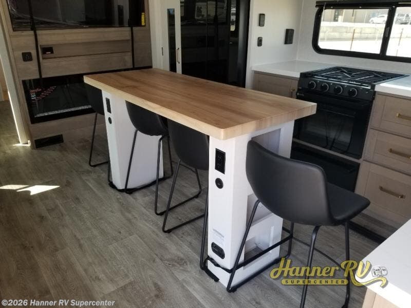 At the front of the unit, you’ll find one of the two bedrooms, featuring dual 34" x 76" twin beds that easily convert into an expansive 92" x 76" sleeping area with a fold-down bed ideal for guests or family. This space also includes a fold-down desk for work or study, along with a wardrobe with washer/dryer prep. Just down the hall, a convenient half bath adds extra functionality for guests. In the middle, the living area and kitchen shine with dual opposing slide-outs that create an open, residential feel. One slide houses a spacious pantry, a 16 cu. ft. refrigerator, and a 21" range with edge-to-edge grates, complemented by abundant overhead cabinetry, while the adjacent area features a 30" over-the-range black and stainless microwave and sink. The central kitchen island dinette provides the perfect gathering spot for meals or game nights. Across the way, a 93" theater sofa with cup holders and end tables offers a cozy place to relax. At the rear, the second bedroom delivers true comfort with a 72" x 80" king bed, a wardrobe and dresser for storage, and a private full bathroom complete with generous counter space and a 30" x 48" shower—creating a luxurious retreat at the end of the day.