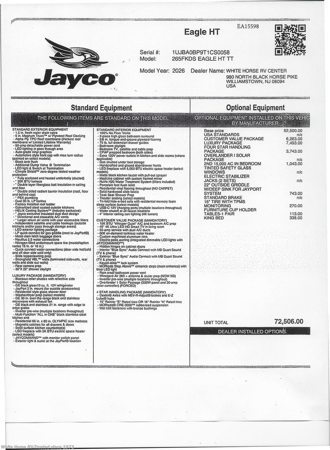 This Stock #EA15598 will also have the following factory options included: ... Calli Linen Interior Décor, 2nd 15,000 AC in Bedroom, 22’ Outside Griddle w/ Deep sink for Jayport System, 15’ Tire with TPMS Monitoring, Furniture cup holder table 1- pair, & King Bed ...all backed by Jayco’s 2+3-year warranty! MSRP $72,506.00.