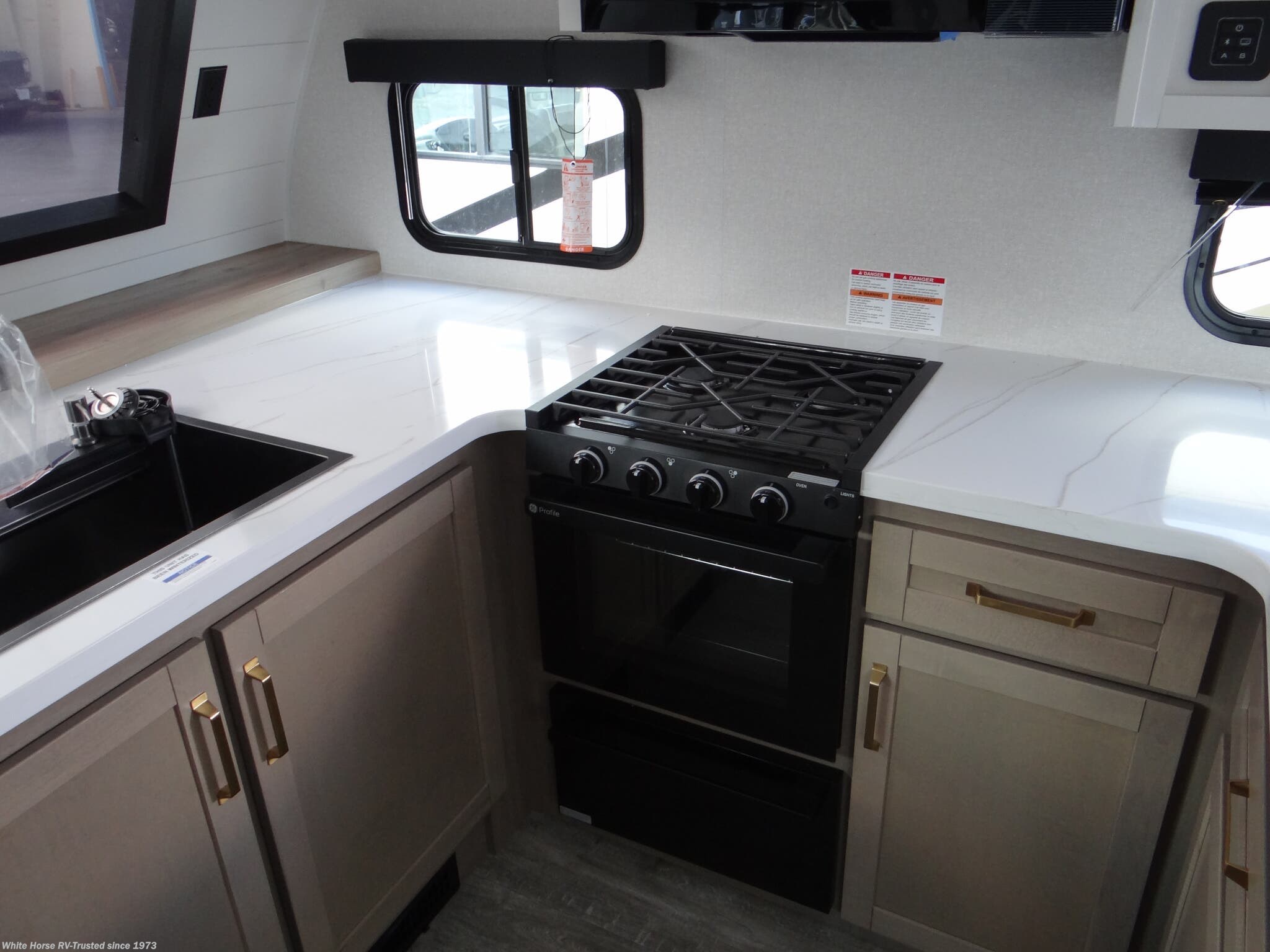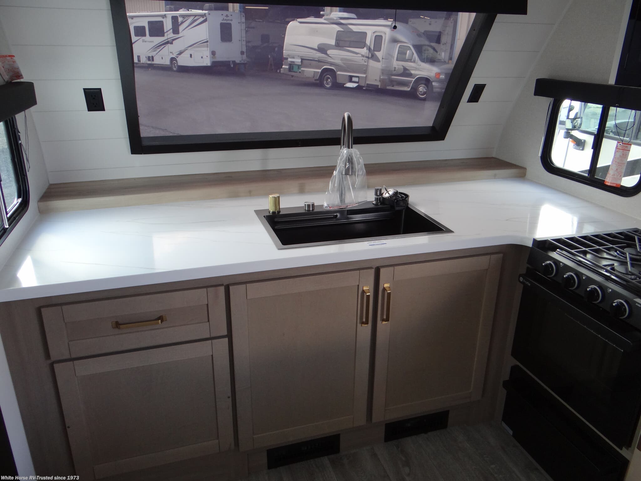 Luxury Package: : Blackout Roller Shades with Reflective Side Throughout, GE Black Glass 10 Cu.Ft. 12V Refrigerator , Jayport 2" Mount for Outside Accessories, Residential Style Glass Shower Door, Washer/Dryer Prep (Select Models), GE 30" OTR Black and Stainless Microwave with Exhaust Fan, GE Black and Stainless 21" Range with Edge to Edge Grates, Inverter Prewire (Multiple Locations), Multi-Function "All In One" Black Stainless Steel Kitchen Sink, Olympic 66"x80" Residential Mattress, Magnetic Catches For All Doors & Drawers, Solid Surface Kitchen Countertop(s), LED Fireplace with 5K BTU Elect Space Heater (Select Models), Jay Command with Monitor Switch Panel, Exterior Light & Outlet at Jayport Location.
