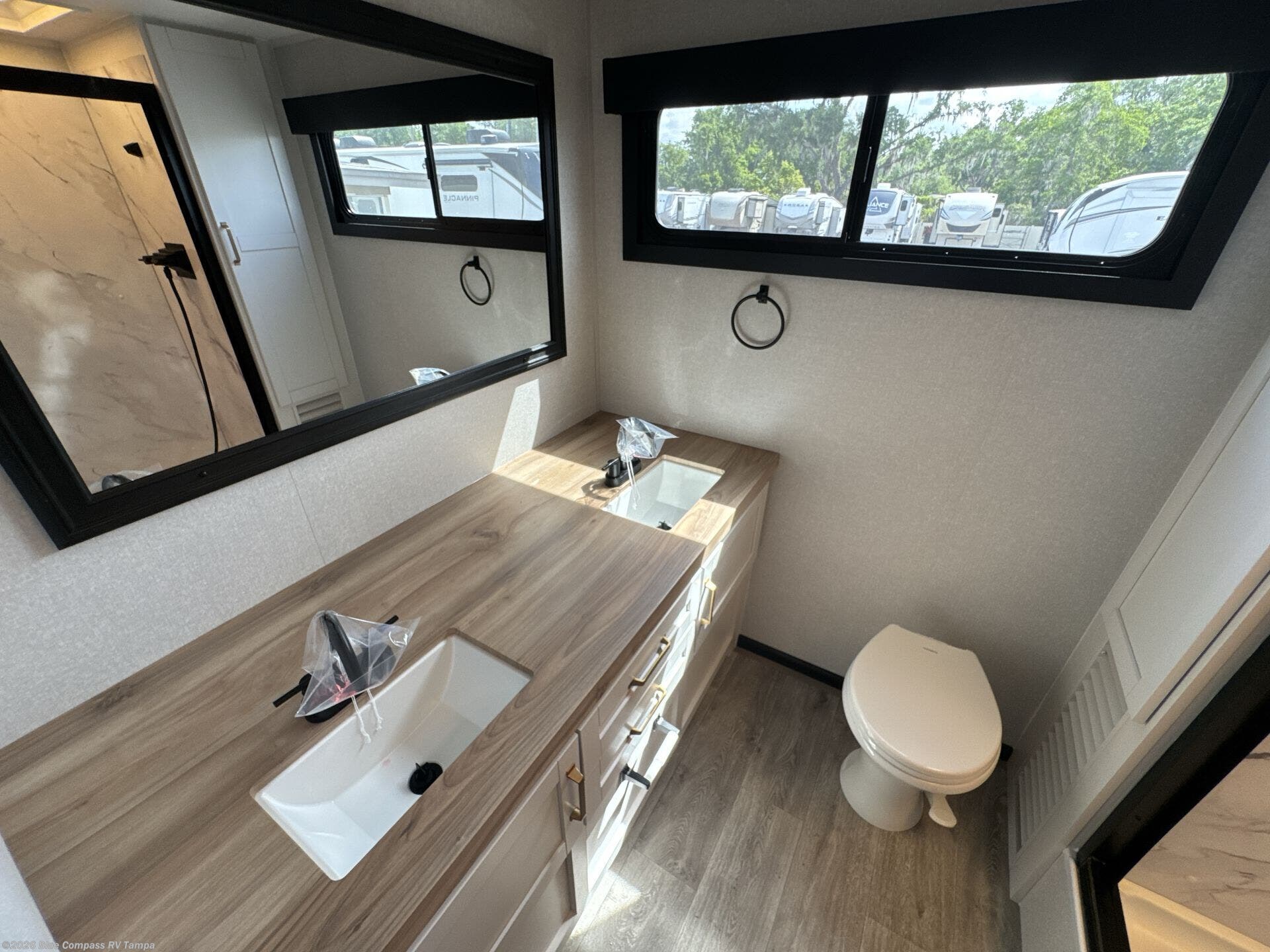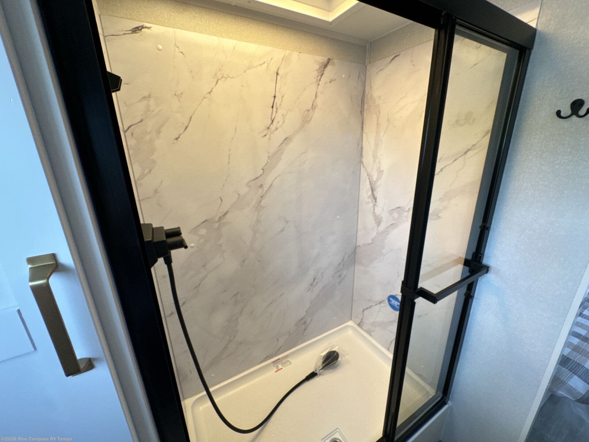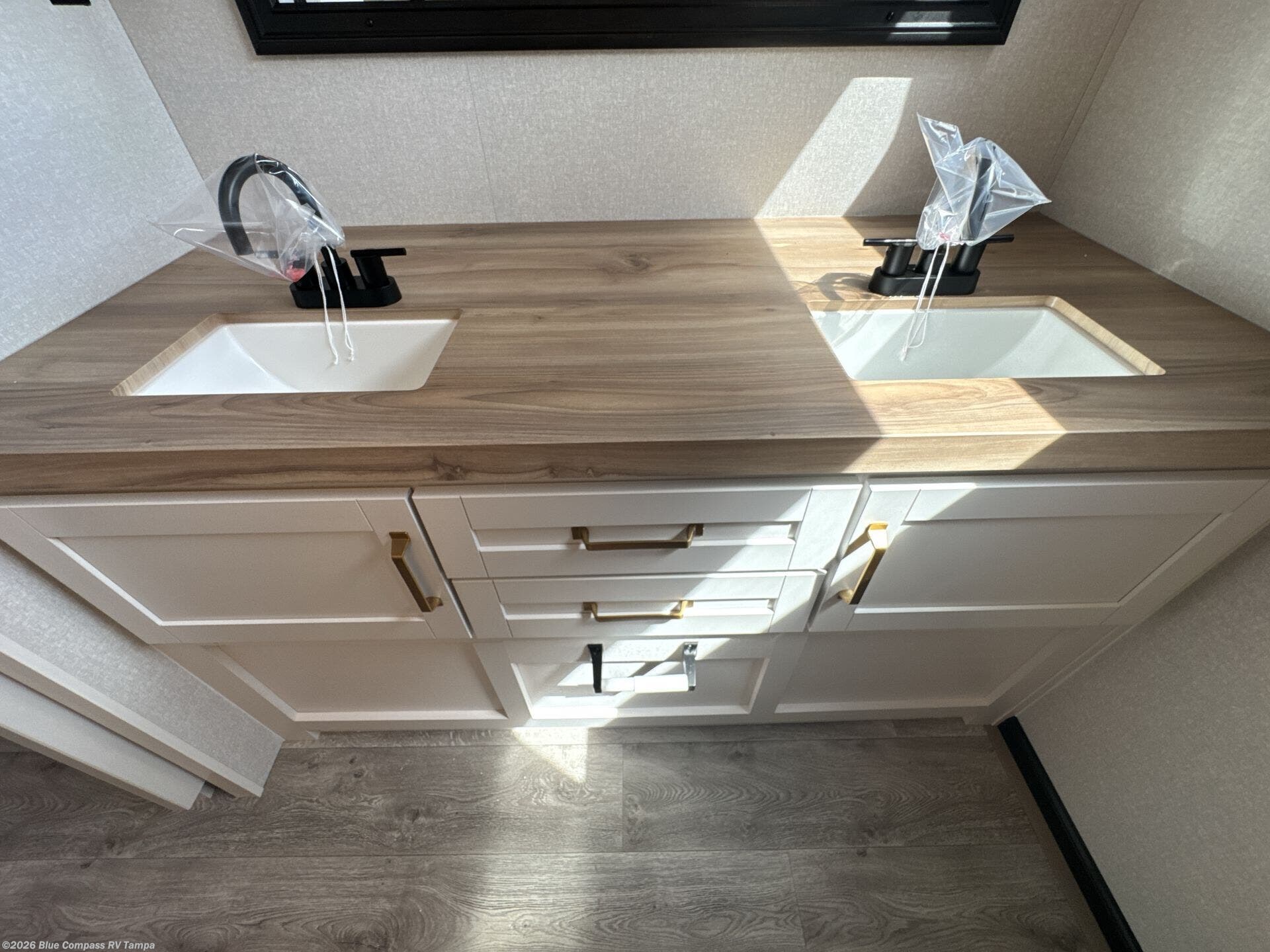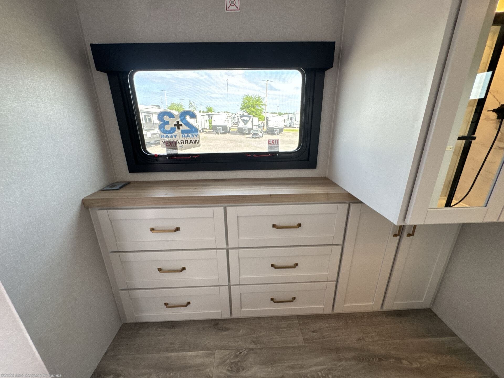 This is the perfect travel trailer for the couple who loves comfort at the campground! The front kitchen features ample counter space, including a bartop with barstool chairs and all the appliances to make your best meals. If you'd rather be outside, there is an outdoor kitchen and a power awning where you can spend your evenings. The master bedroom includes an Olympic-size queen bed slide out, a dresser, plus a wardrobe with washer and dryer prep. And don't overlook the full rear bath, complete with a 30" x 48" shower, a linen closet, and dual bath sinks so you both can get ready at the same time!