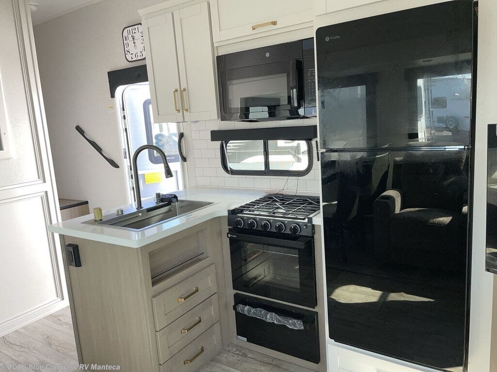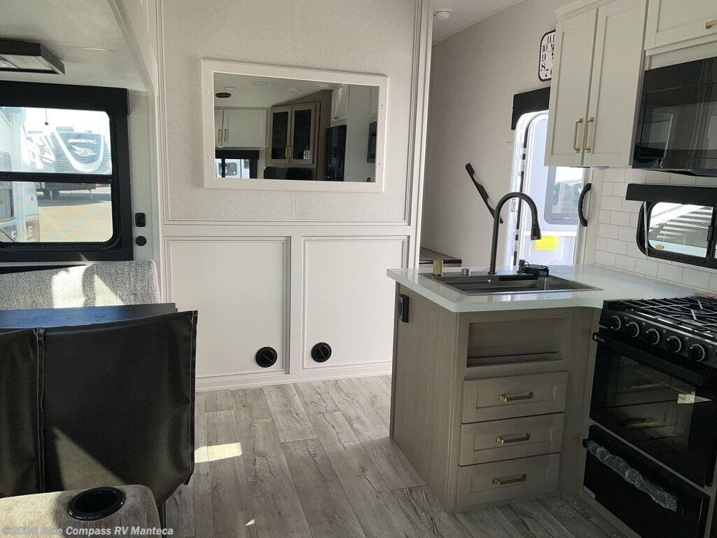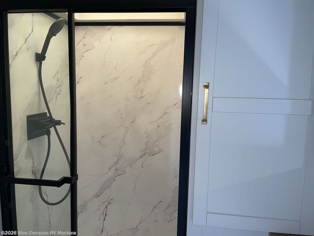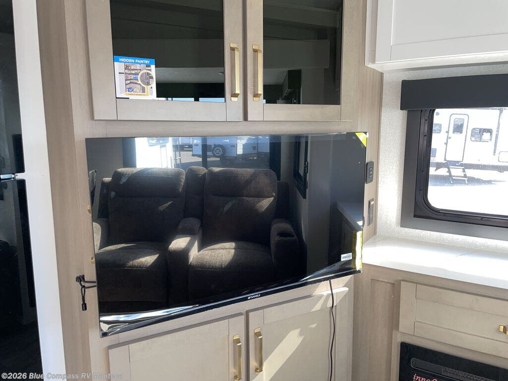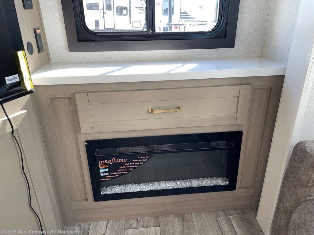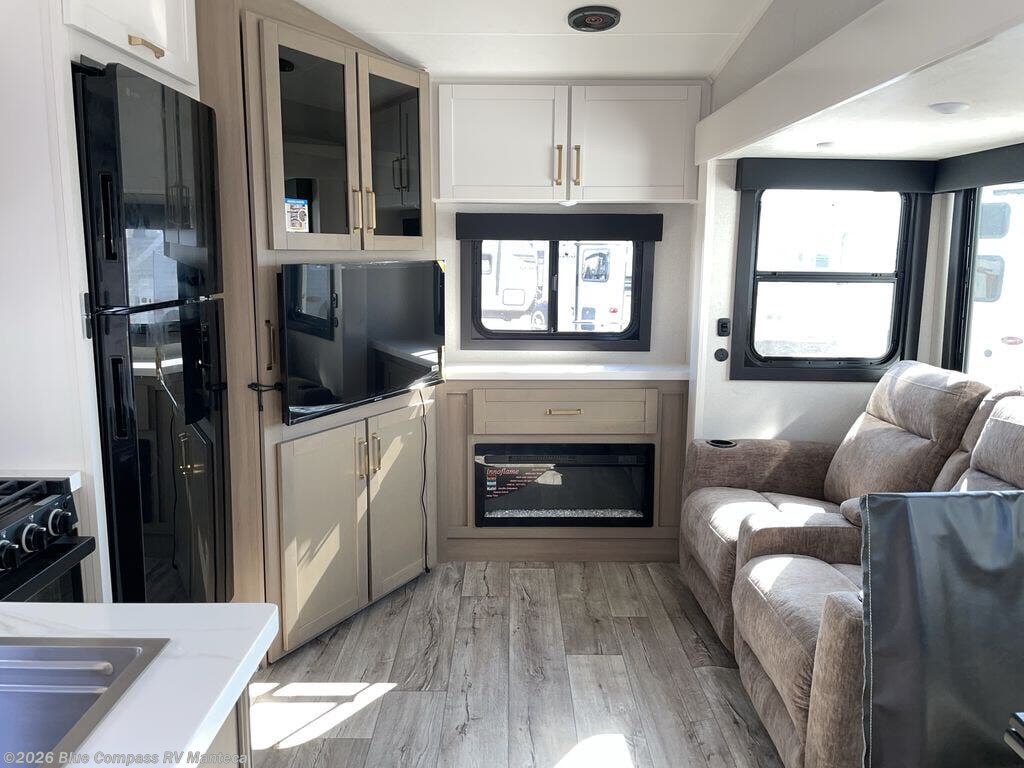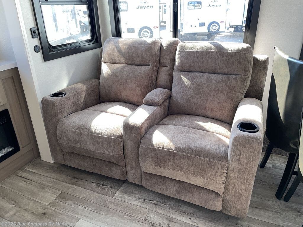 This is the perfect couple's fifth wheel since it features sleeping space for two up front! You can use the dual bedroom wardrobes to store your clothes in, and the full bath is close by so you can get ready each morning. After you've whipped up breakfast in the kitchen, you can dine at the table and chairs with bench seating, then relax with your coffee on the theater seat. There is an entertainment center across from the sofa for convenience, plus a hidden walk-in pantry behind the TV. You might even like to add the fireplace option to make it feel more like home!