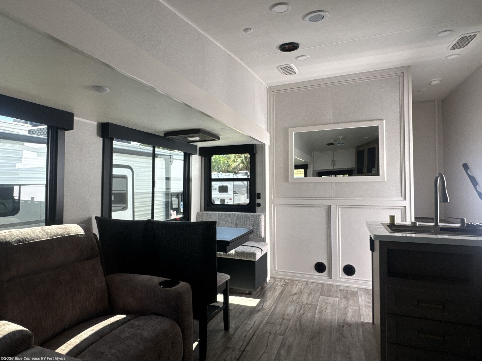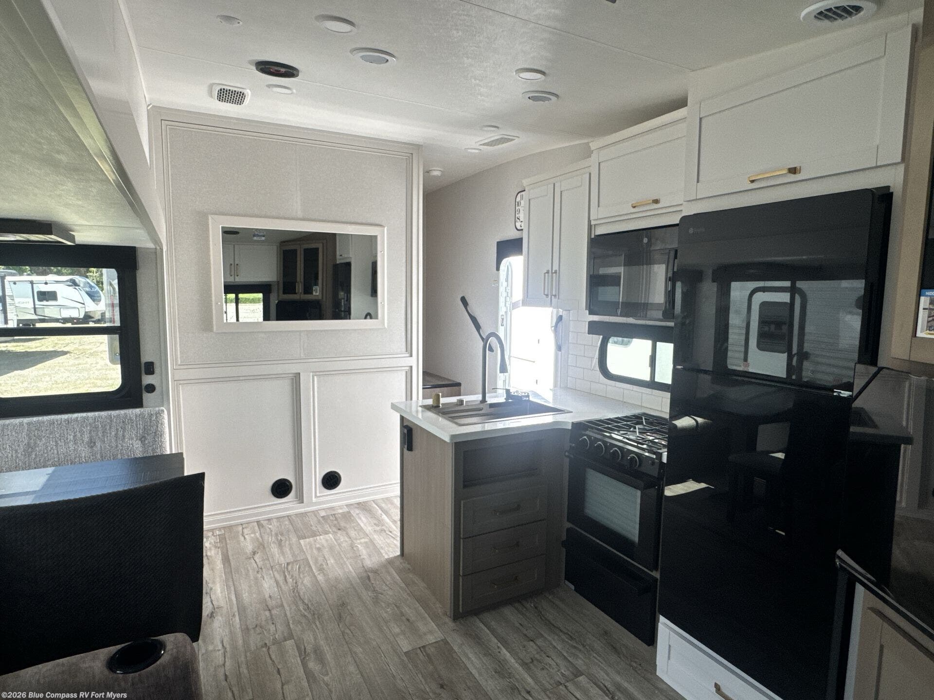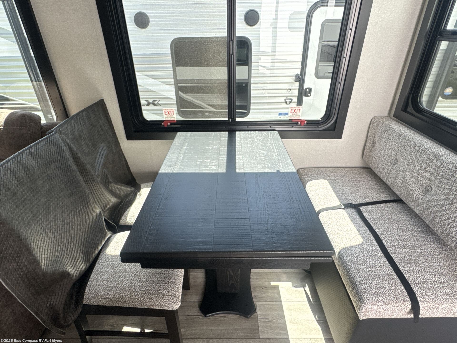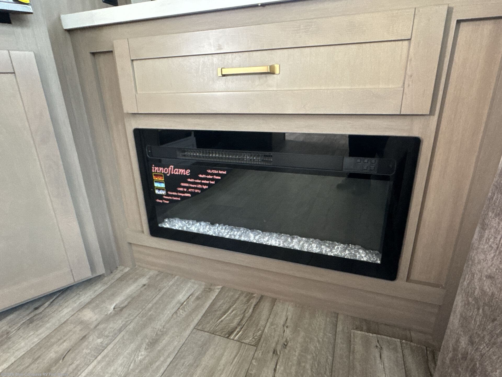 This is the perfect couple's fifth wheel since it features sleeping space for two up front! You can use the dual bedroom wardrobes to store your clothes in, and the full bath is close by so you can get ready each morning. After you've whipped up breakfast in the kitchen, you can dine at the table and chairs with bench seating, then relax with your coffee on the theater seat. There is an entertainment center across from the sofa for convenience, plus a hidden walk-in pantry behind the TV. You might even like to add the fireplace option to make it feel more like home!