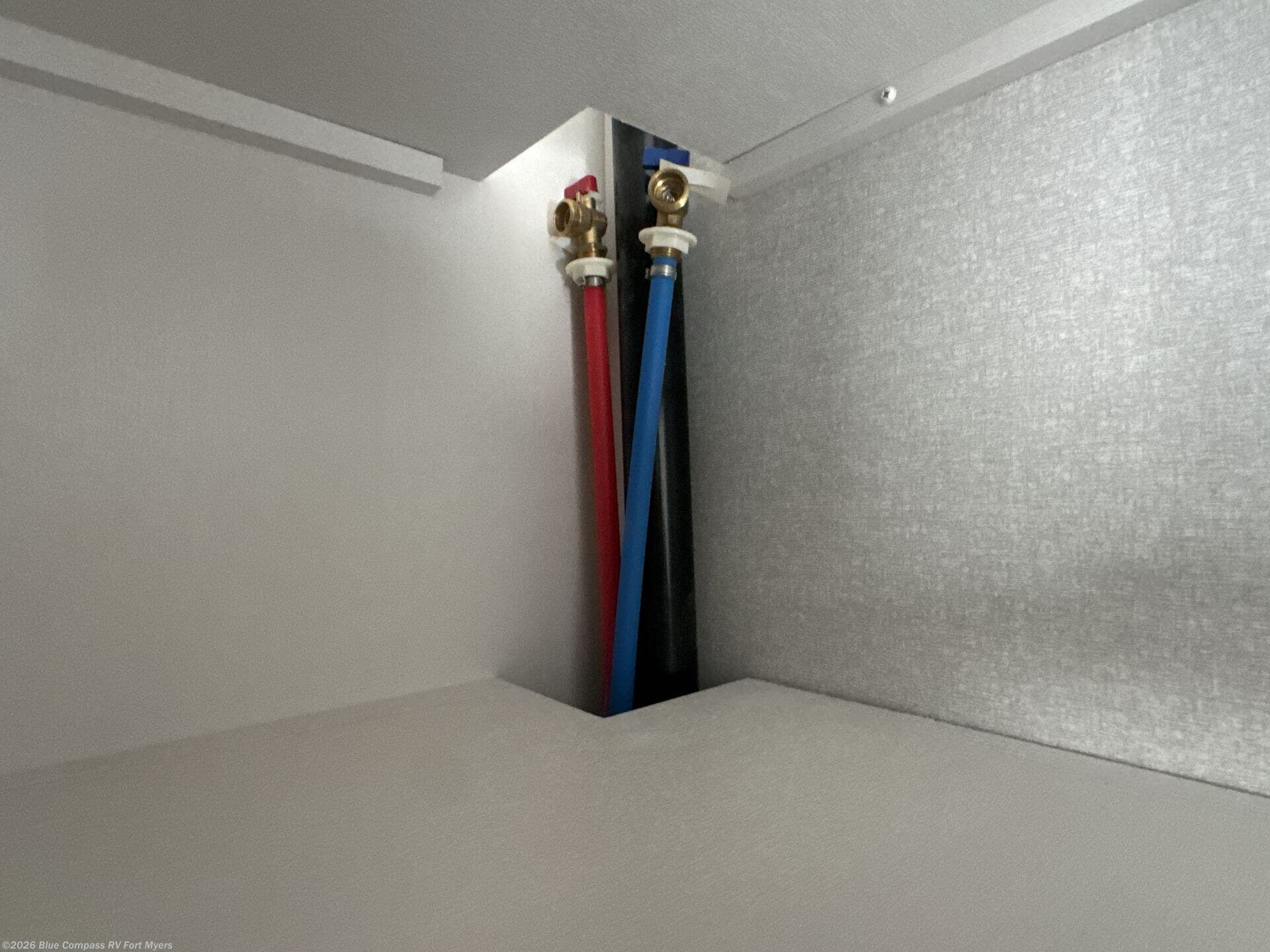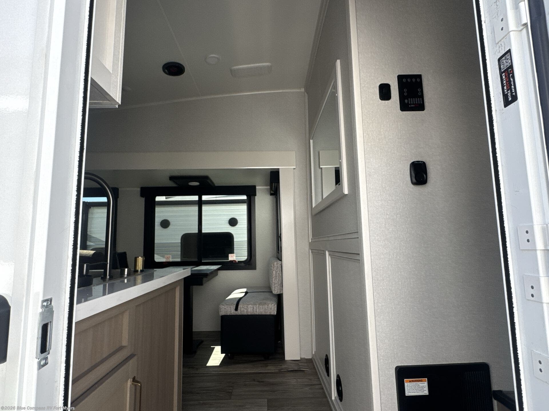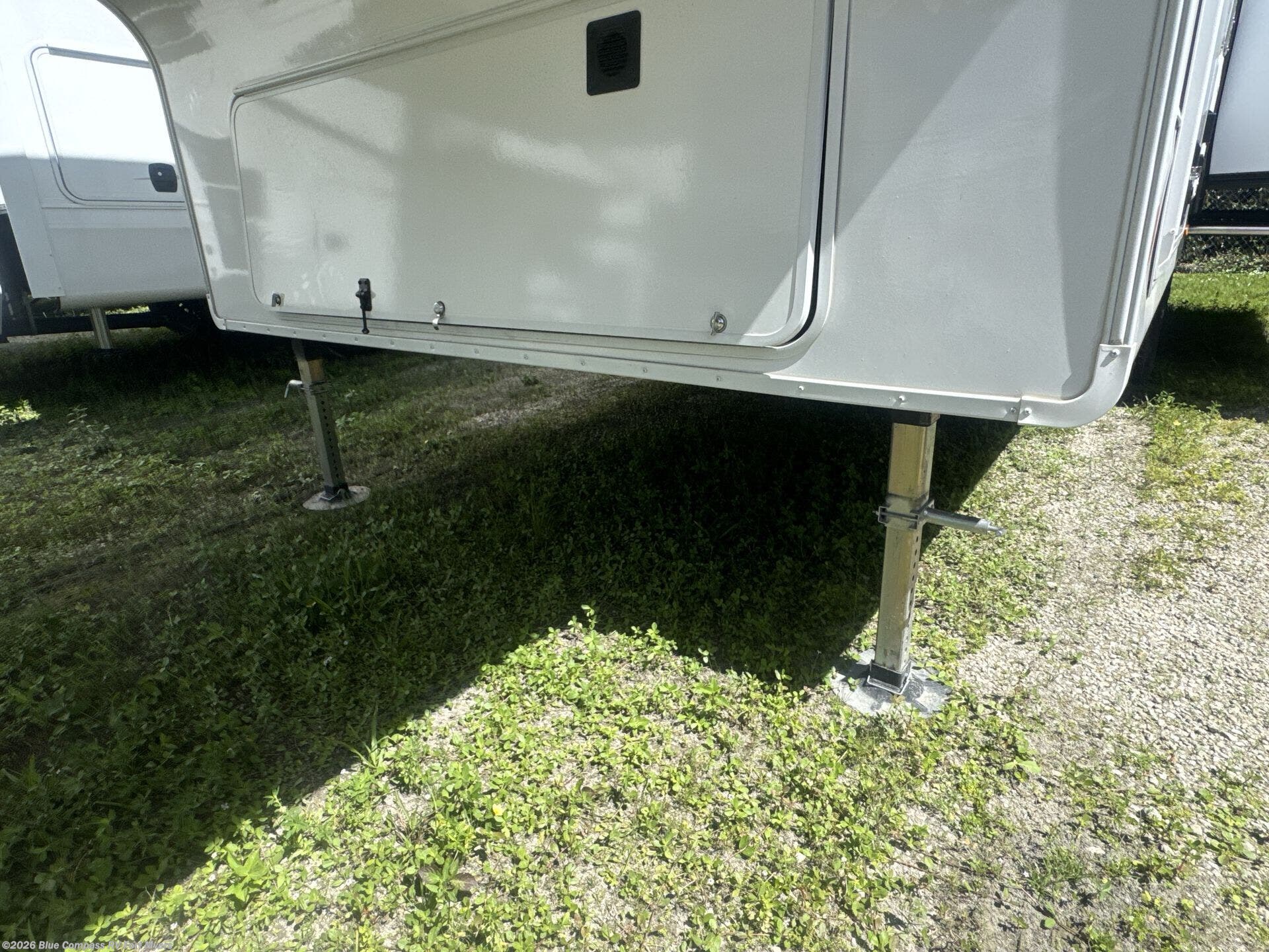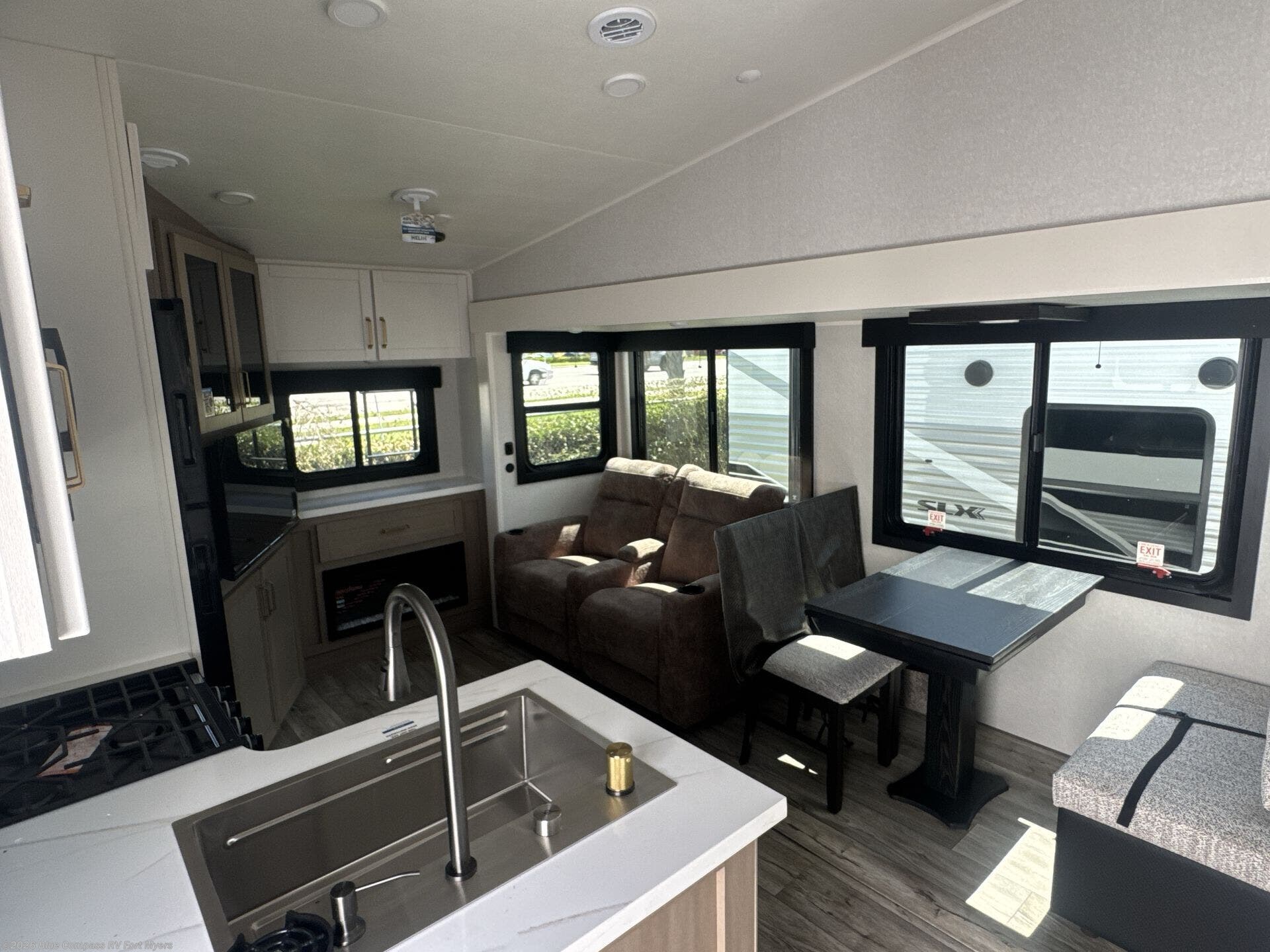 This is the perfect couple's fifth wheel since it features sleeping space for two up front! You can use the dual bedroom wardrobes to store your clothes in, and the full bath is close by so you can get ready each morning. After you've whipped up breakfast in the kitchen, you can dine at the table and chairs with bench seating, then relax with your coffee on the theater seat. There is an entertainment center across from the sofa for convenience, plus a hidden walk-in pantry behind the TV. You might even like to add the fireplace option to make it feel more like home!