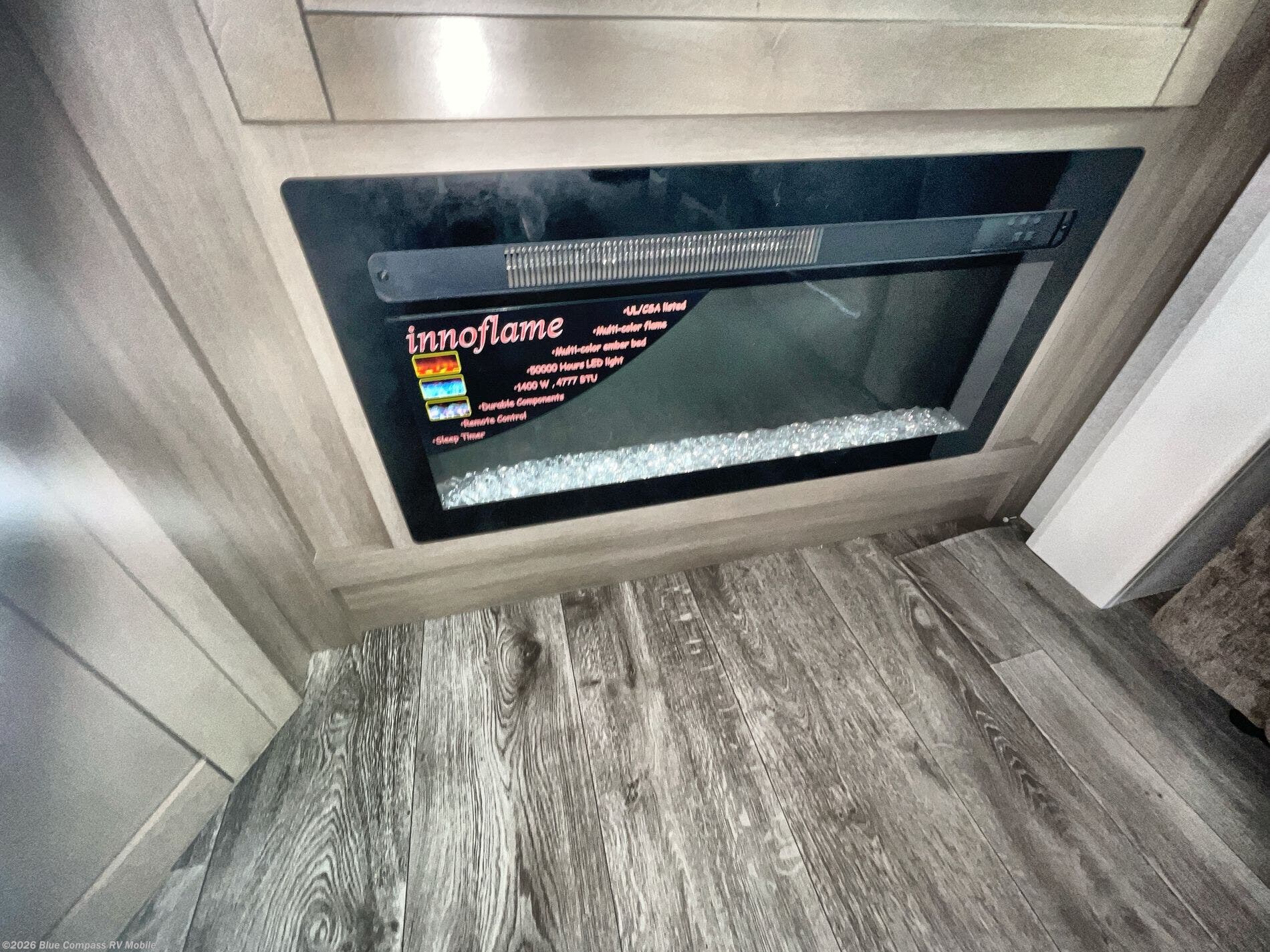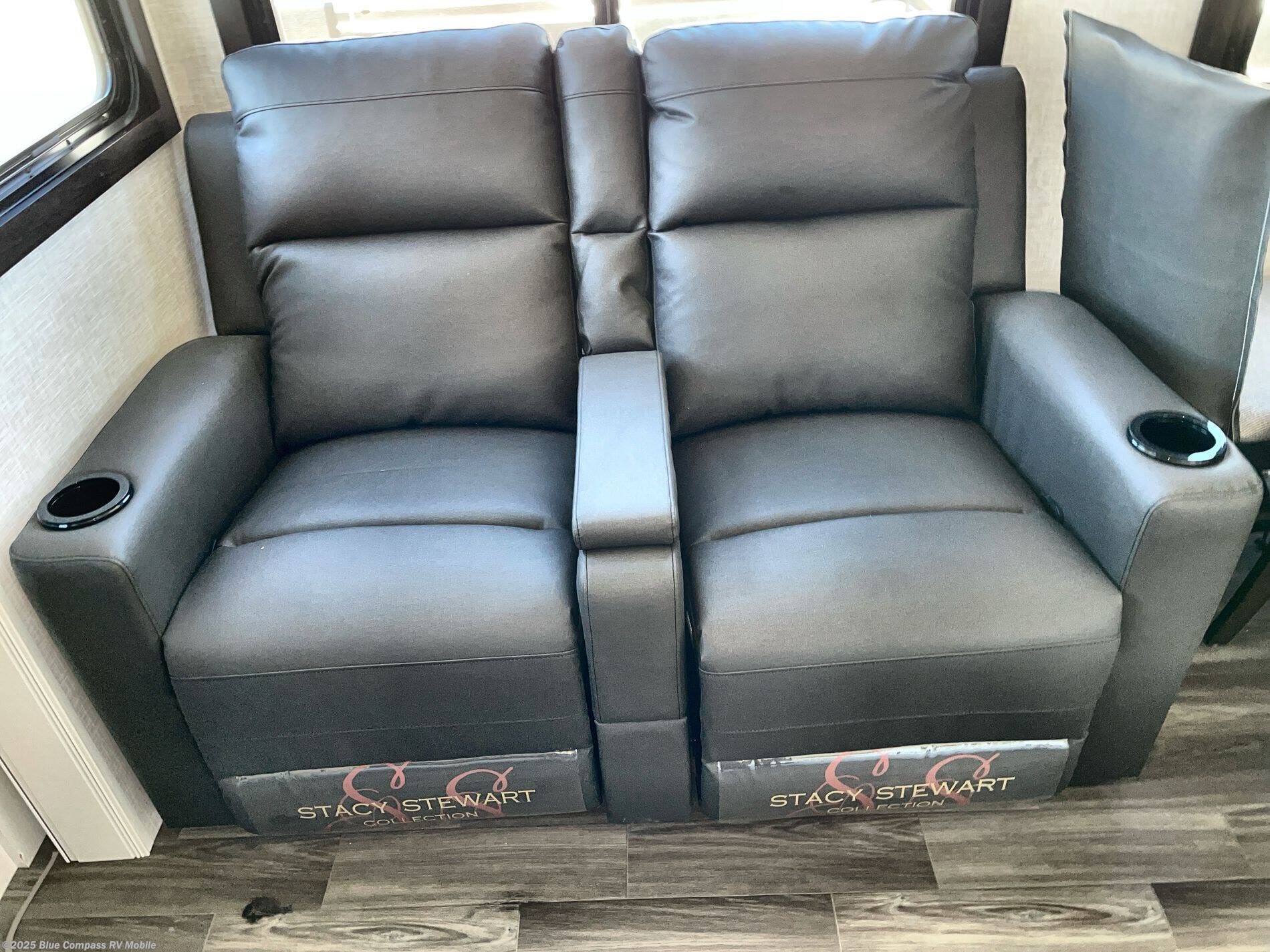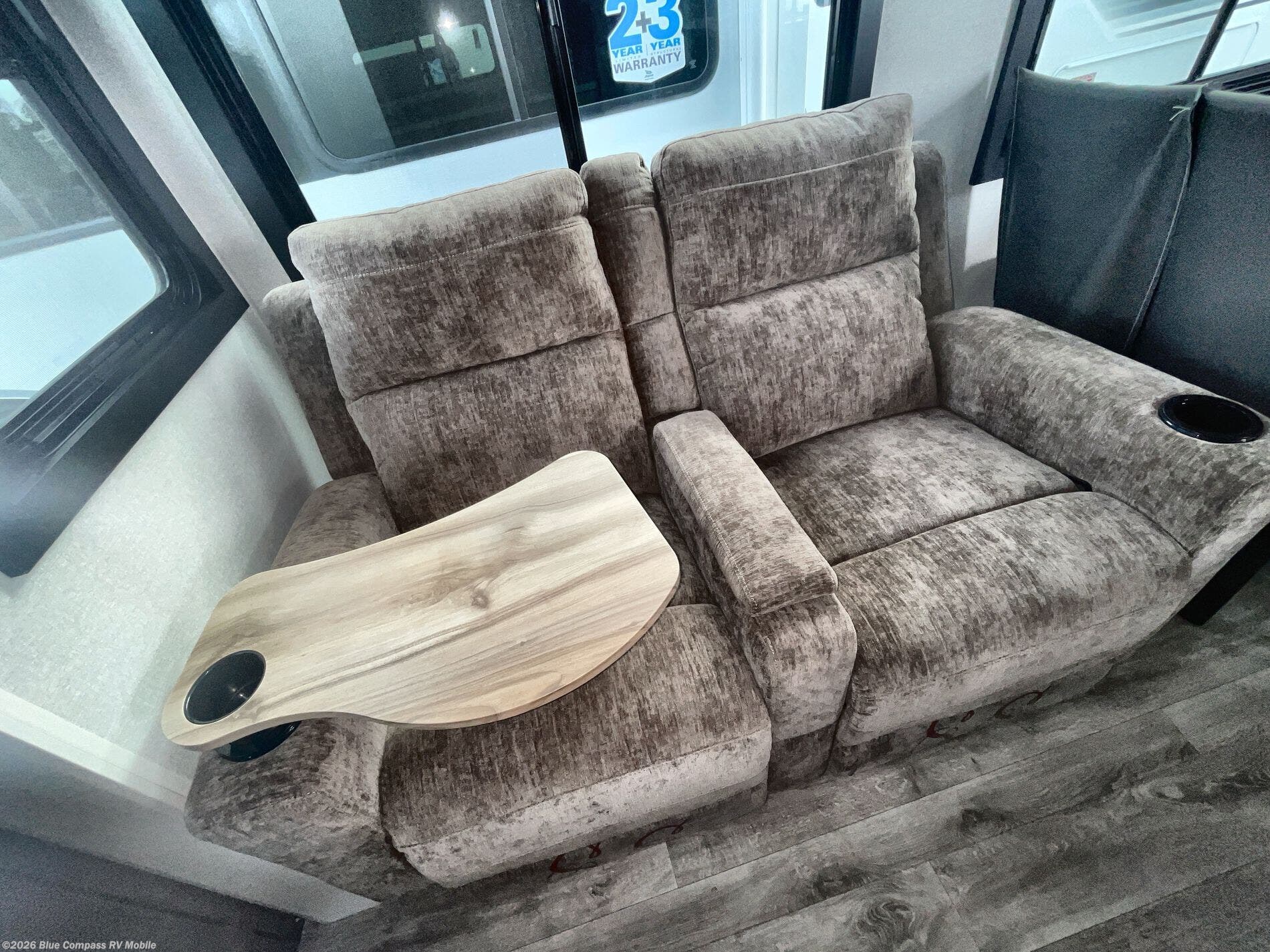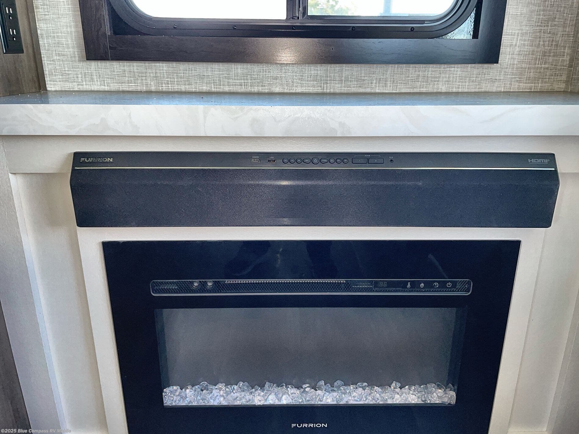 This is the perfect couple's fifth wheel since it features sleeping space for two up front! You can use the dual bedroom wardrobes to store your clothes in, and the full bath is close by so you can get ready each morning. After you've whipped up breakfast in the kitchen, you can dine at the table and chairs with bench seating, then relax with your coffee on the theater seat. There is an entertainment center across from the sofa for convenience, plus a hidden walk-in pantry behind the TV. You'll also love the fireplace, making it feel more like home!
