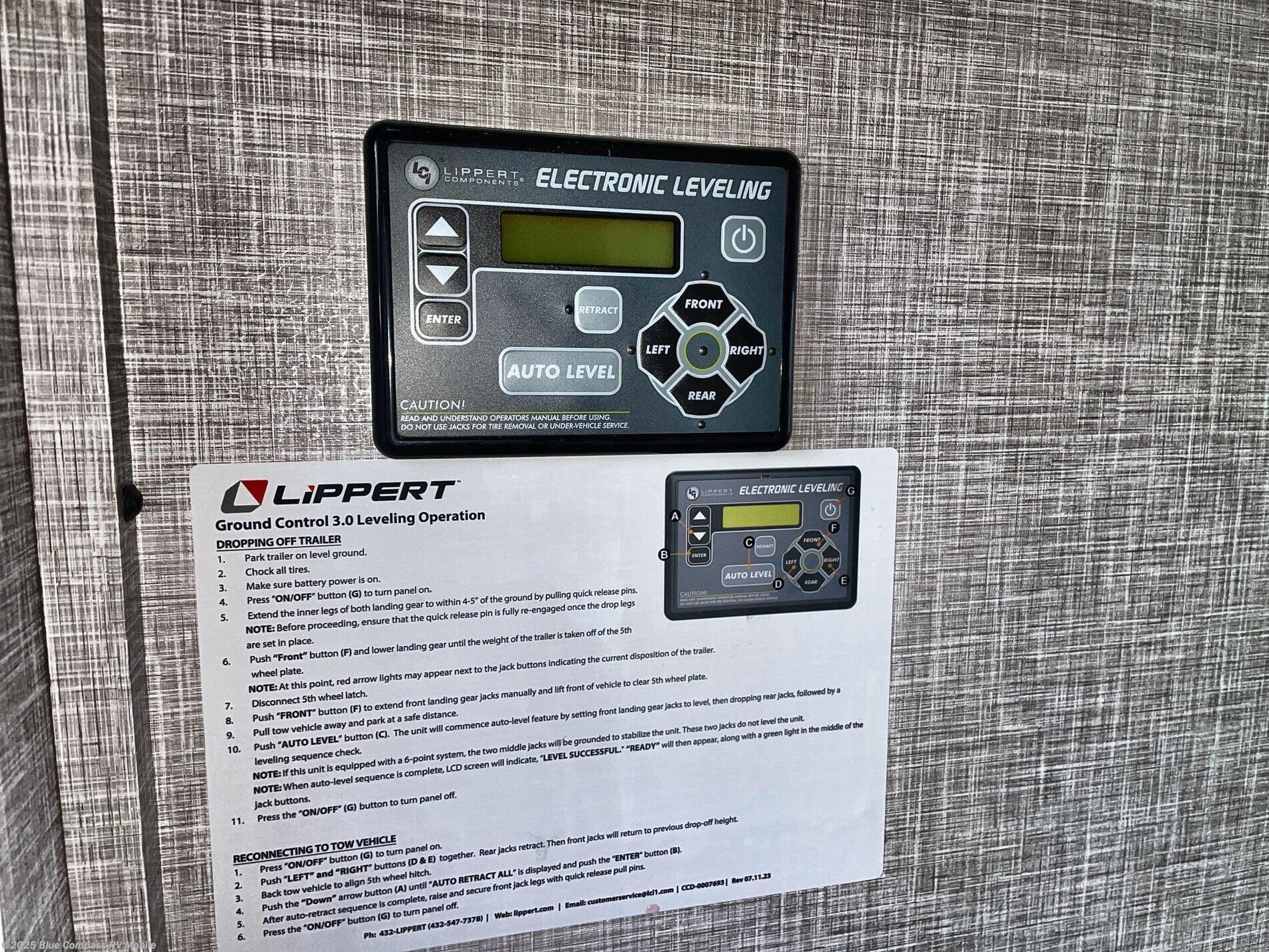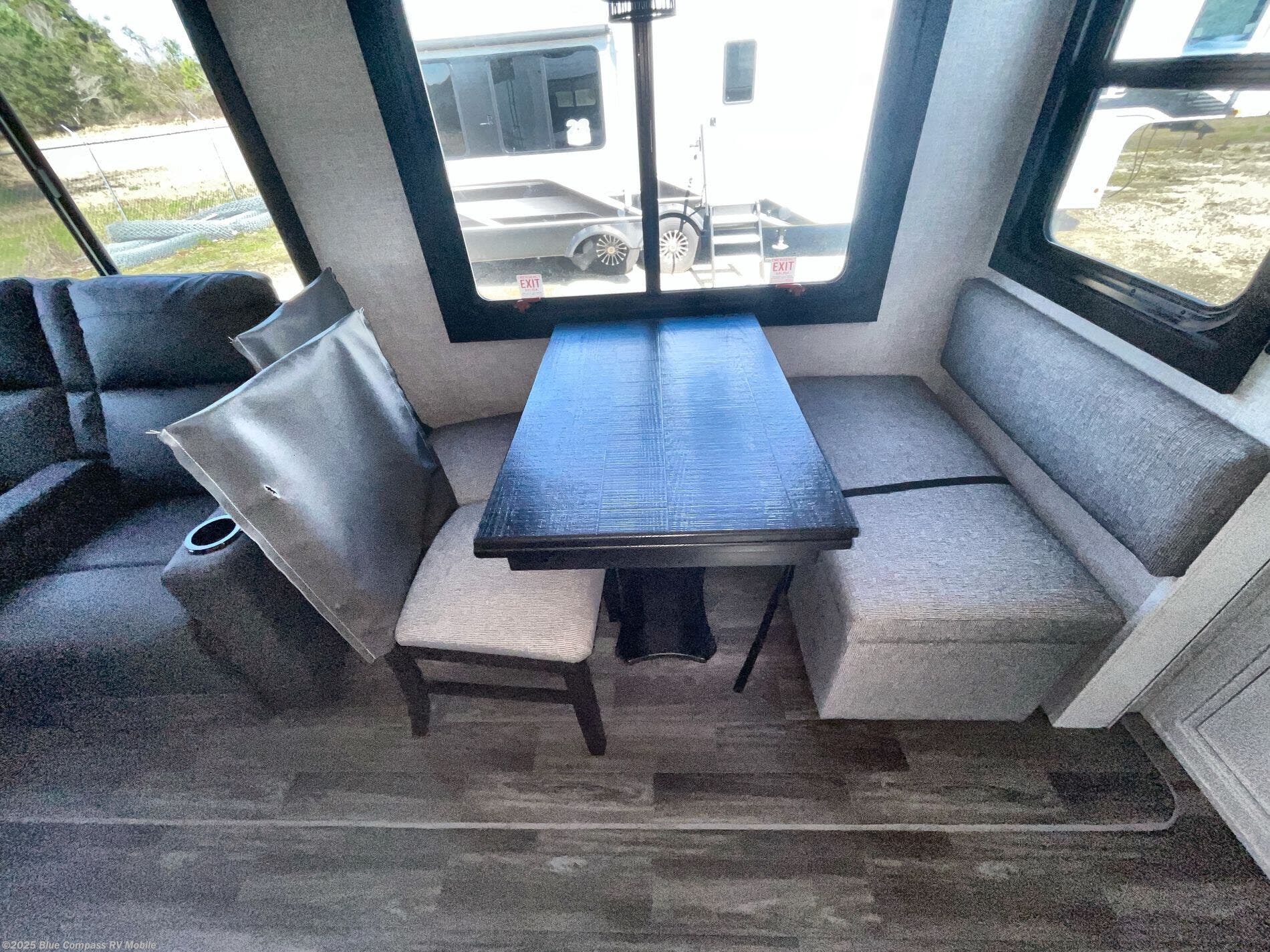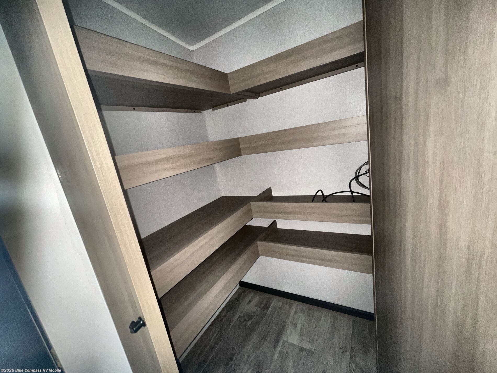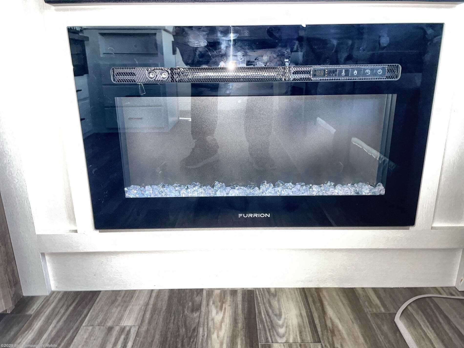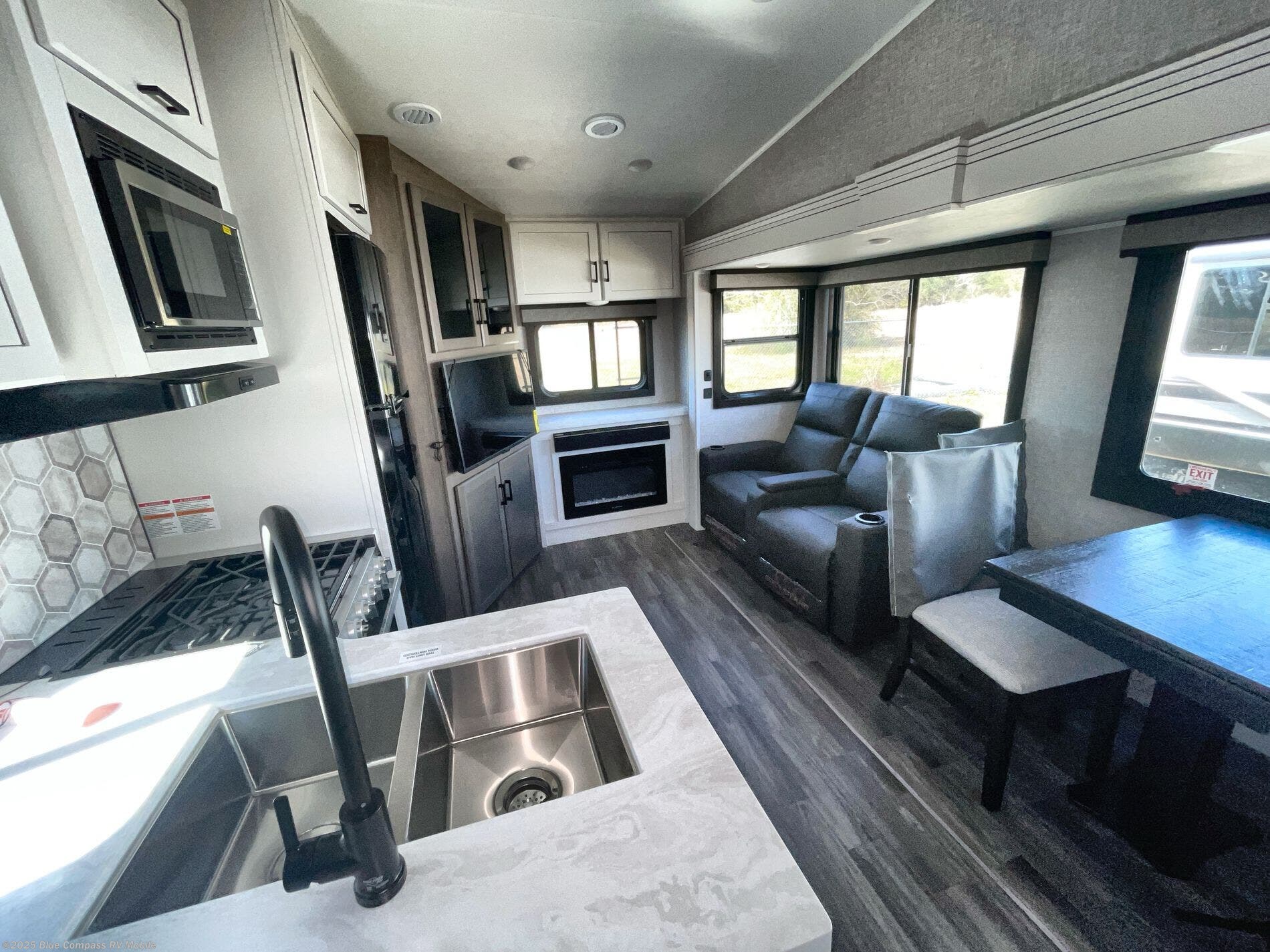 This is the perfect couple's fifth wheel since it features sleeping space for two up front! You can use the dual bedroom wardrobes to store your clothes in, and the full bath is close by so you can get ready each morning. After you've whipped up breakfast in the kitchen, you can dine at the table and chairs with bench seating, then relax with your coffee on the theater seat. There is an entertainment center across from the sofa for convenience, plus a hidden walk-in pantry behind the TV. You'll also love the fireplace, making it feel more like home!