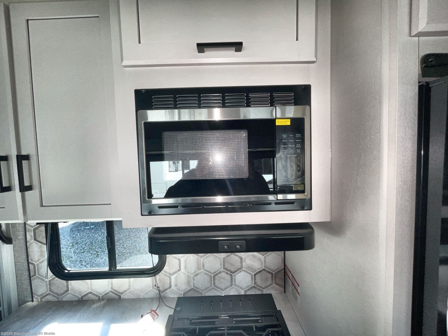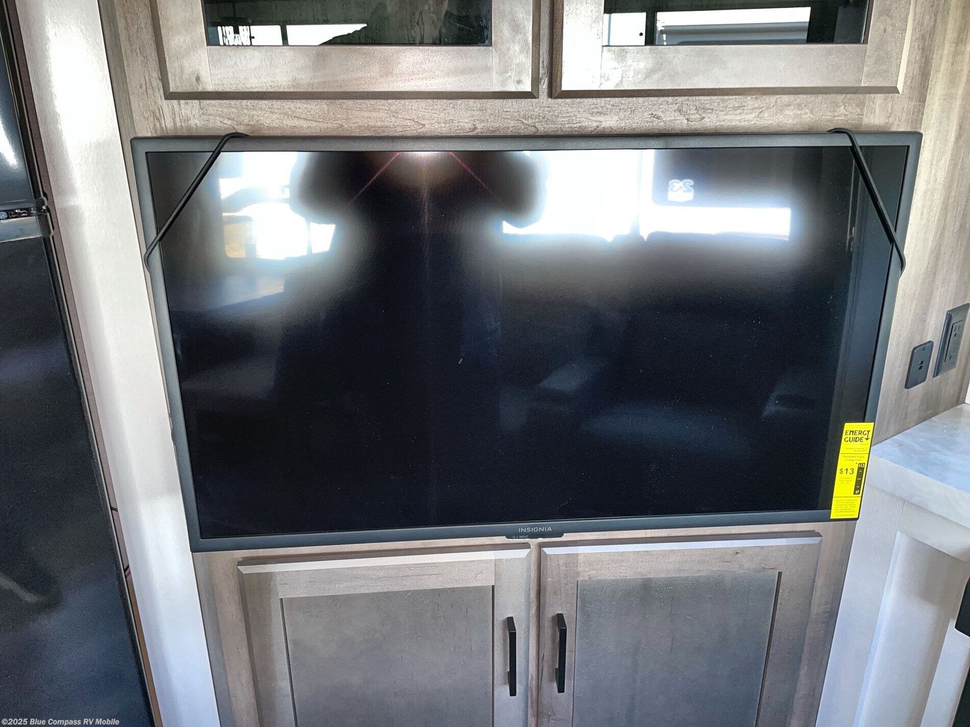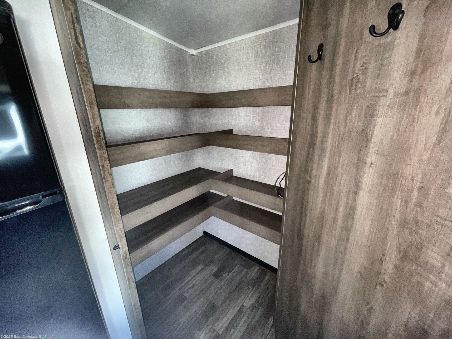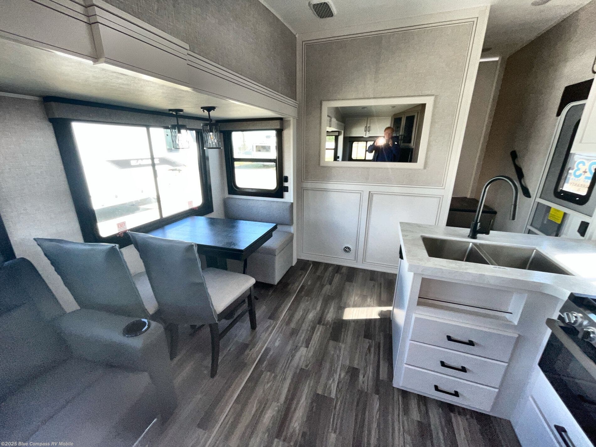 This is the perfect couple's fifth wheel since it features sleeping space for two up front! You can use the dual bedroom wardrobes to store your clothes in, and the full bath is close by so you can get ready each morning. After you've whipped up breakfast in the kitchen, you can dine at the table and chairs with bench seating, then relax with your coffee on the theater seat. There is an entertainment center across from the sofa for convenience, plus a hidden walk-in pantry behind the TV. You'll also love the fireplace, making it feel more like home!