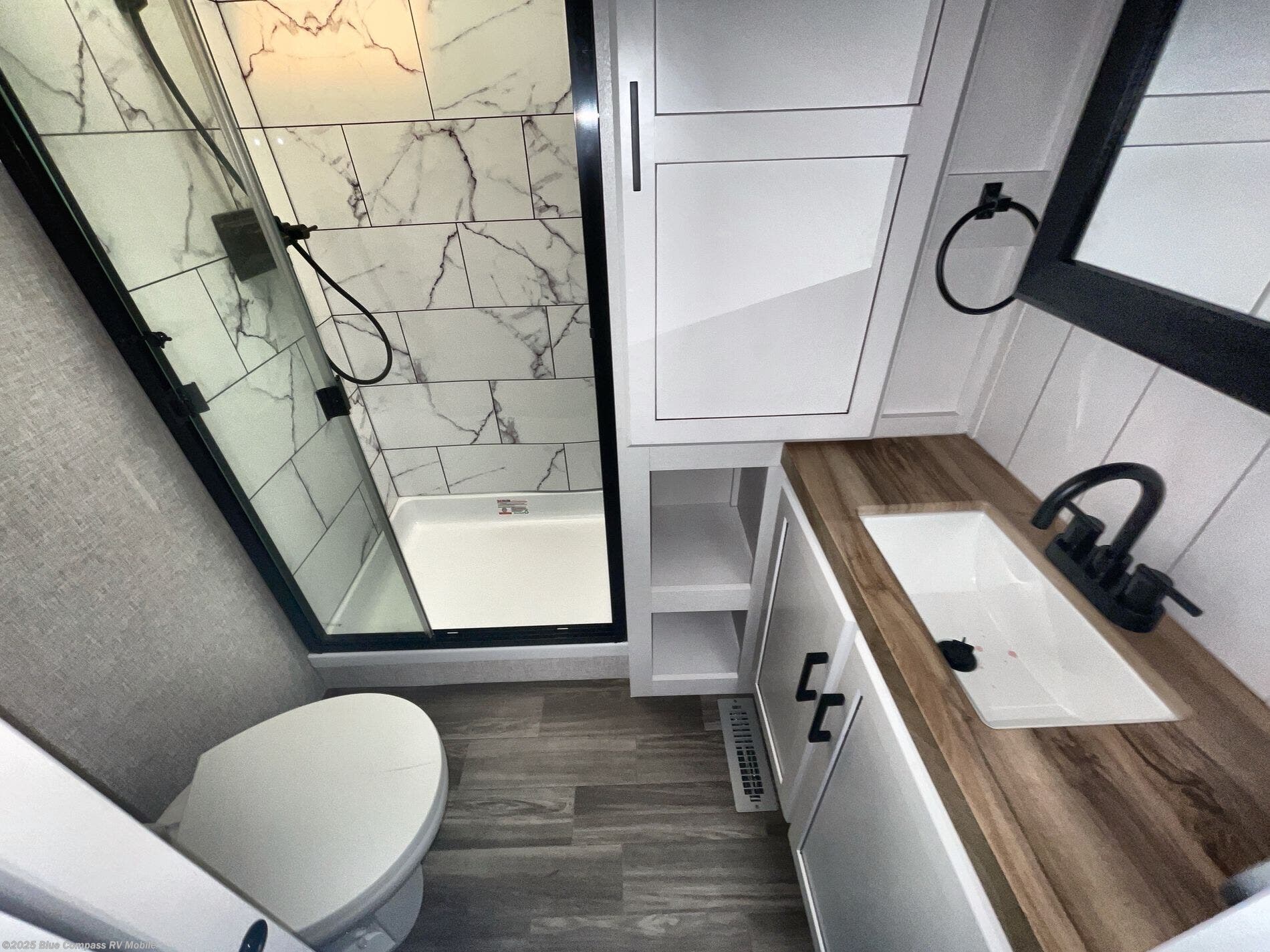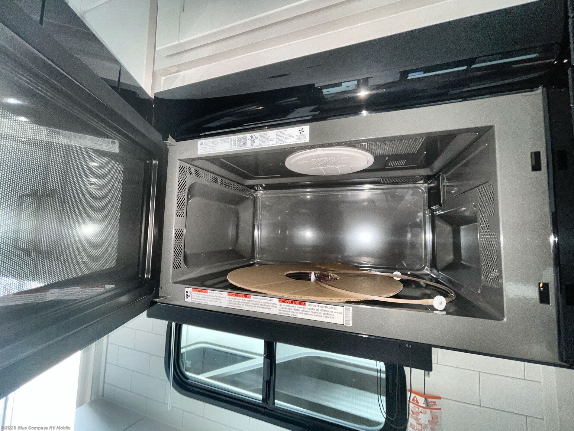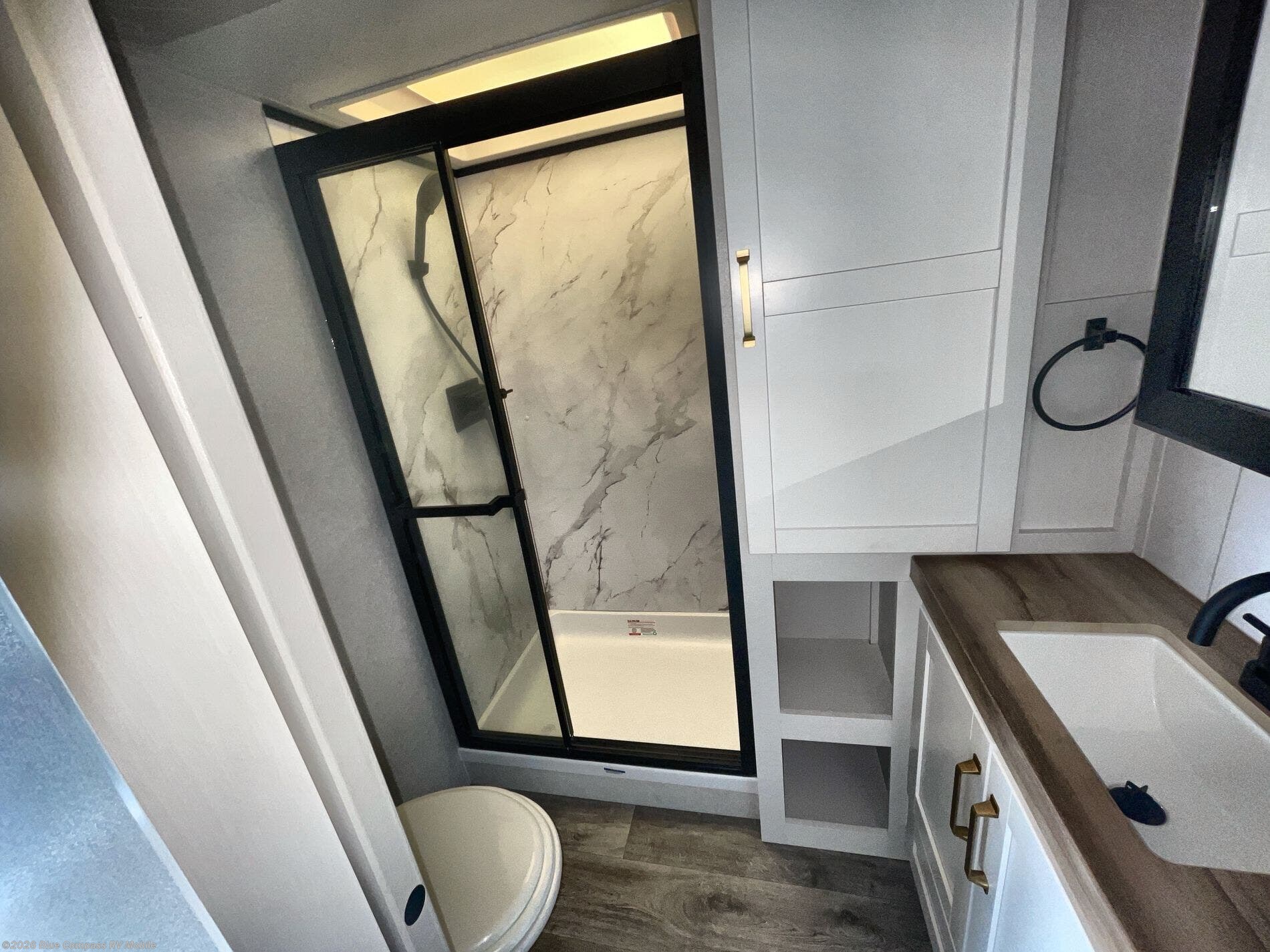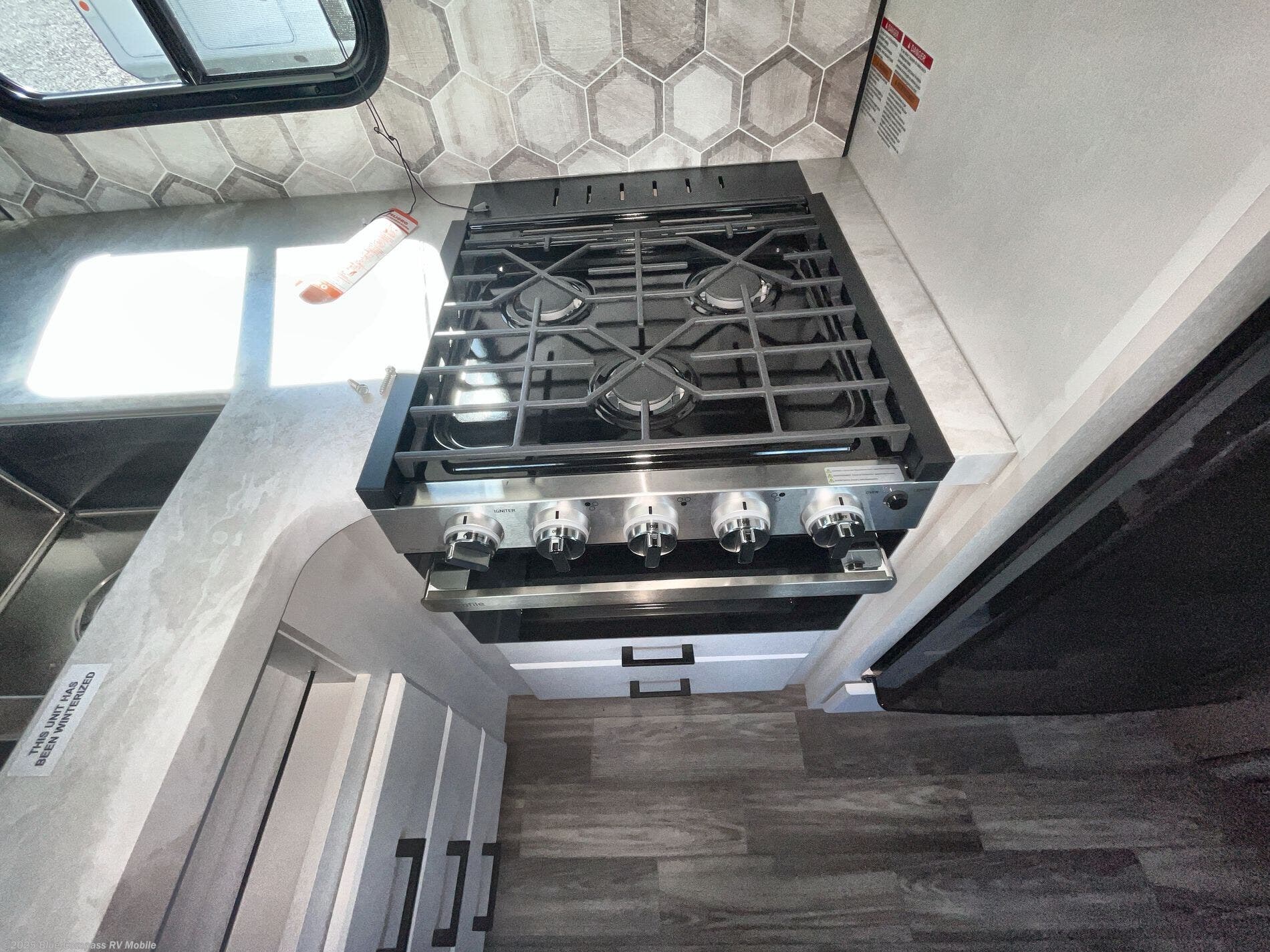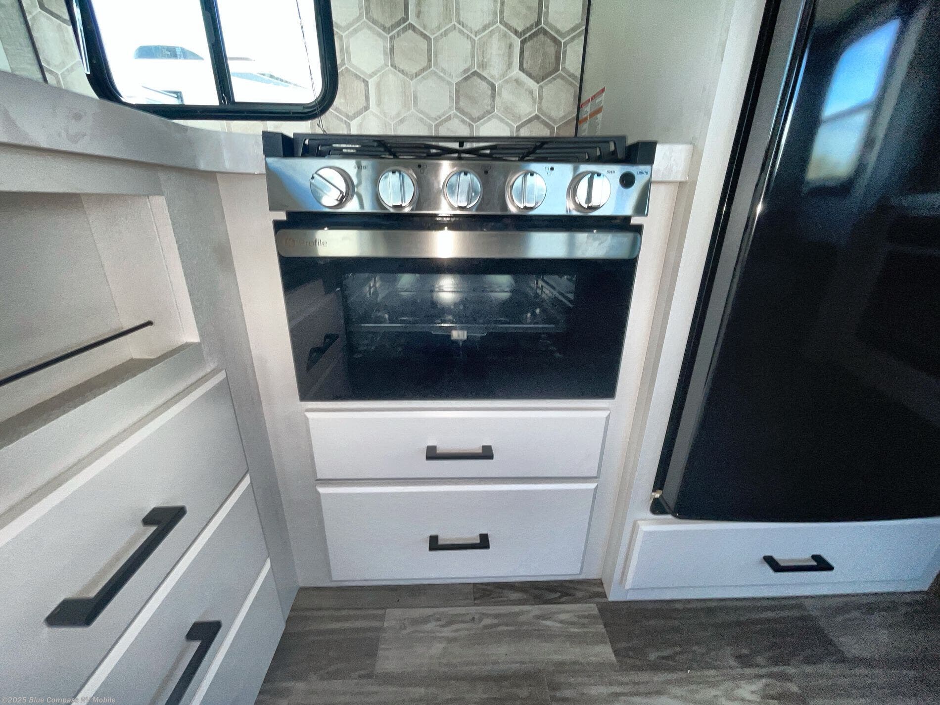 This is the perfect couple's fifth wheel since it features sleeping space for two up front! You can use the dual bedroom wardrobes to store your clothes in, and the full bath is close by so you can get ready each morning. After you've whipped up breakfast in the kitchen, you can dine at the table and chairs with bench seating, then relax with your coffee on the theater seat. There is an entertainment center across from the sofa for convenience, plus a hidden walk-in pantry behind the TV. You'll also love the fireplace, making it feel more like home!