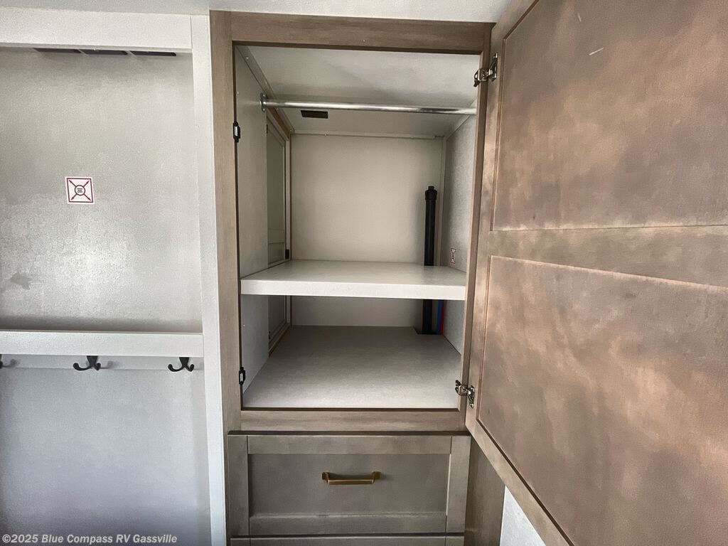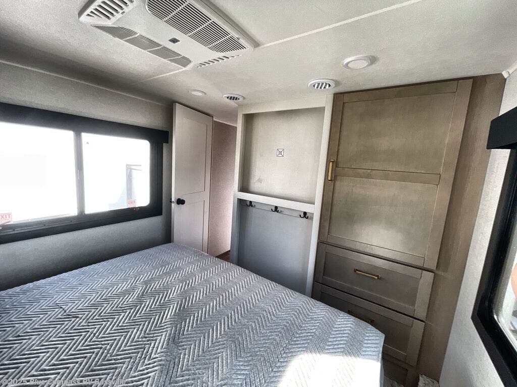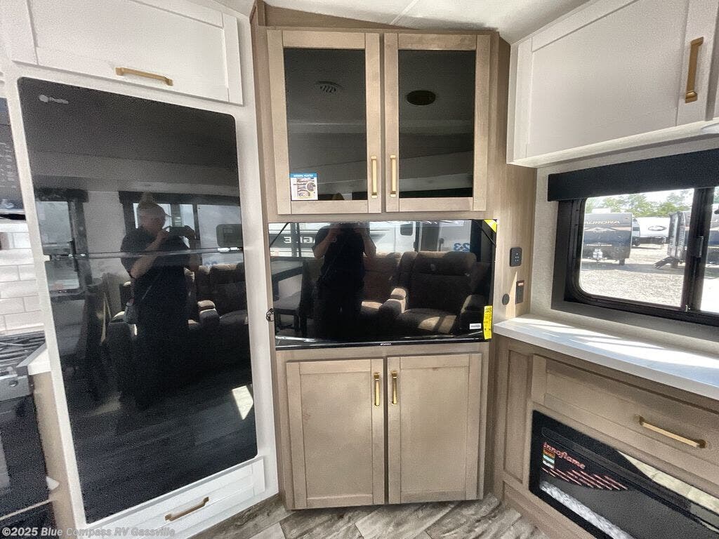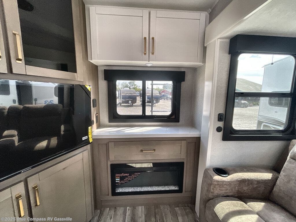 This is the perfect couple's fifth wheel since it features sleeping space for two up front! You can use the dual bedroom wardrobes to store your clothes in, and the full bath is close by so you can get ready each morning. After you've whipped up breakfast in the kitchen, you can dine at the table and chairs with bench seating, then relax with your coffee on the theater seat. There is an entertainment center across from the sofa for convenience, plus a hidden walk-in pantry behind the TV. You might even like to add the fireplace option to make it feel more like home!
